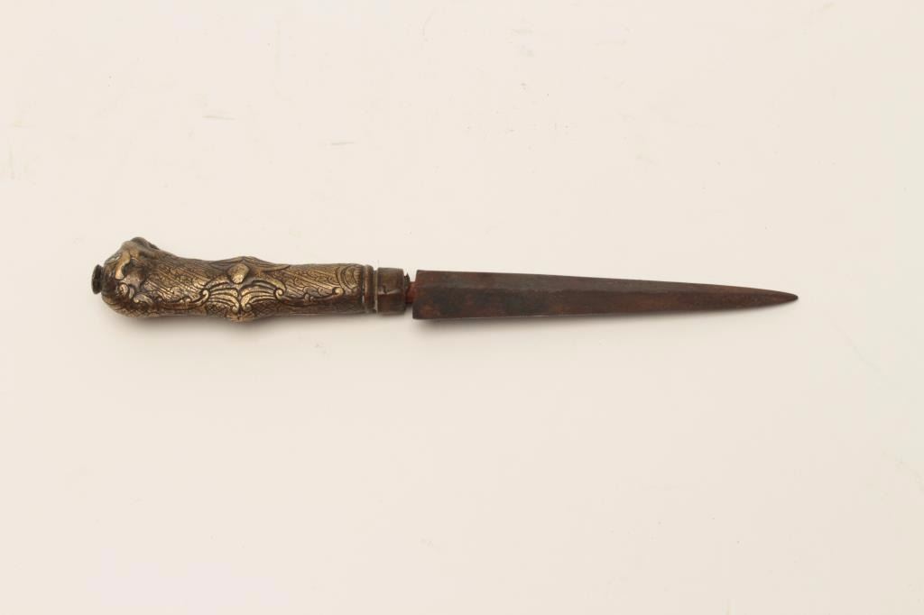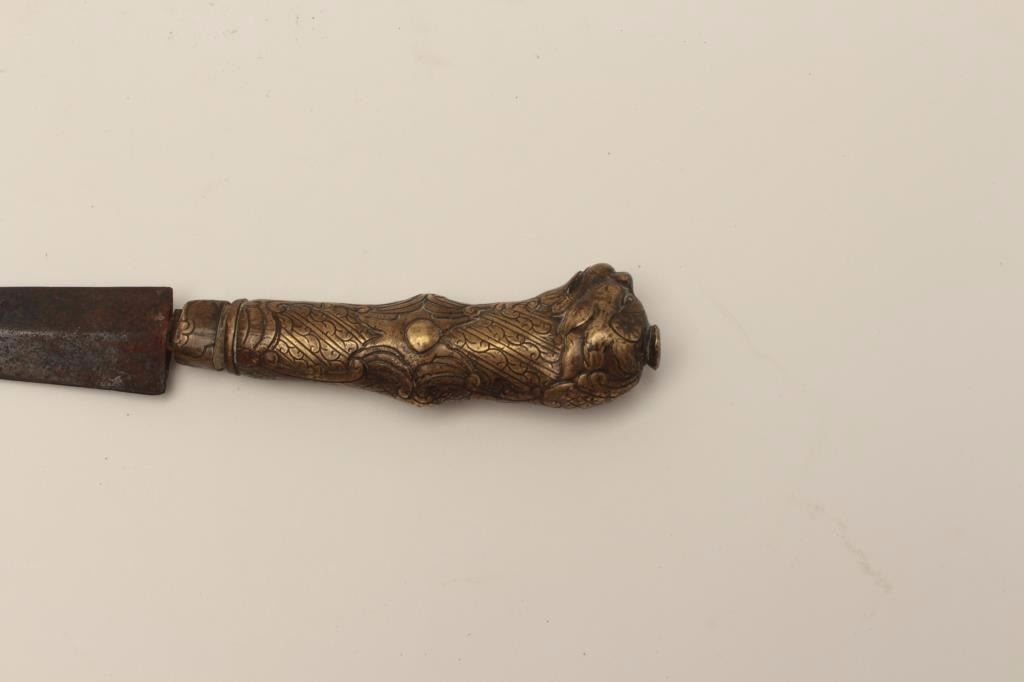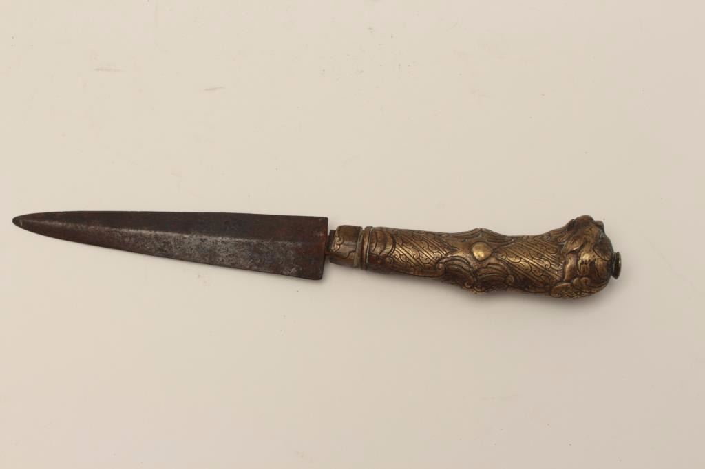 Belt size 18th century dagger with hilt from hanger or hunting sword showing lions head in brass; blade is triangular shaped and crudely forged; possibly American Revolutionary; approximately 10.25” overallwith a 5.5” blade; shows natural patina with some rust and pitting. Est.: $150-$300.