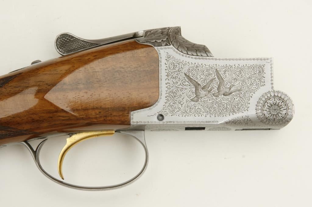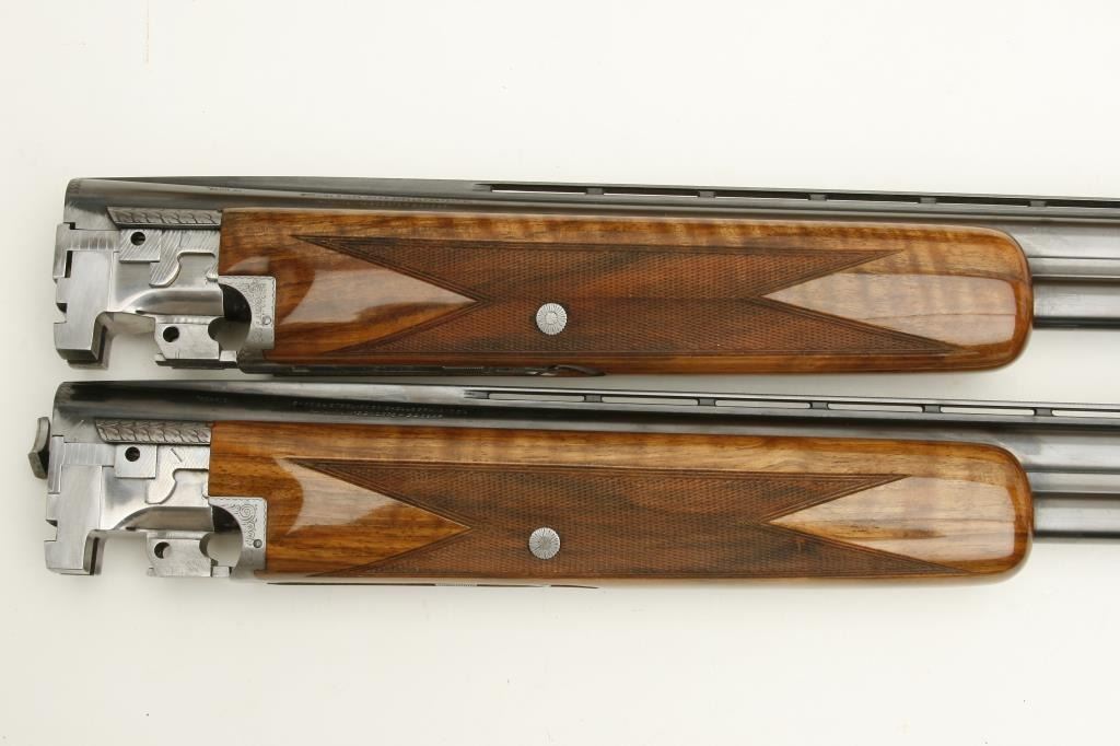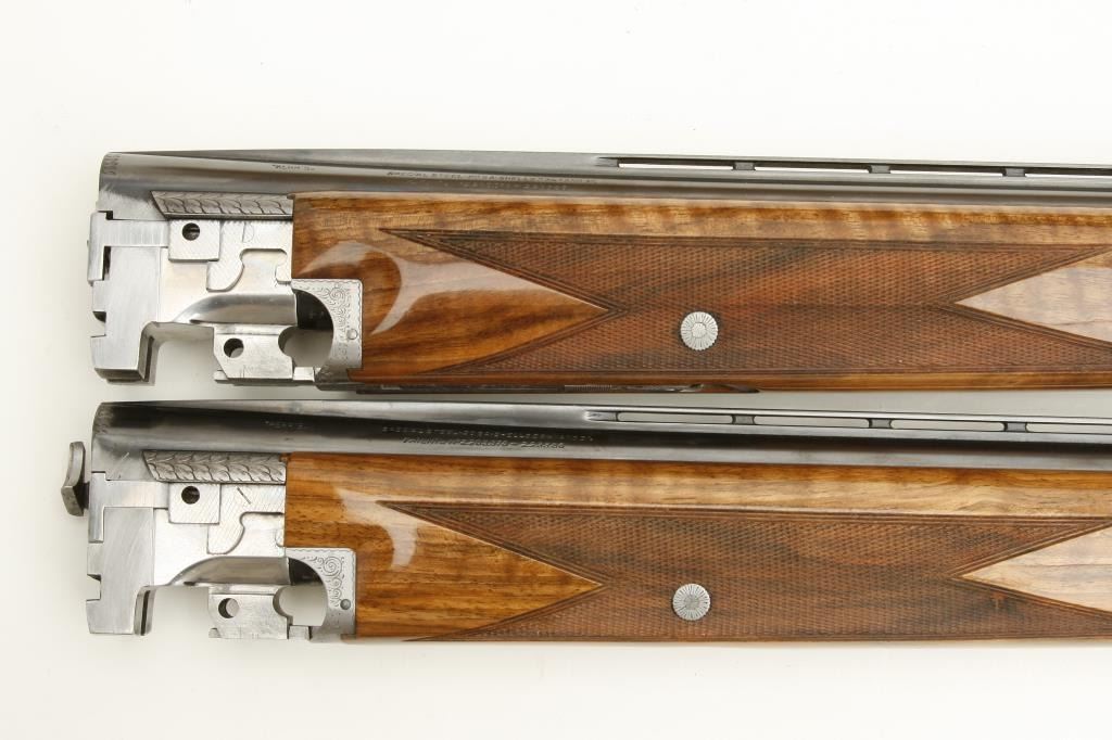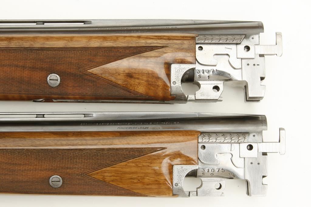 Belgian made Browning Pigeon Grade two barrel set, 20 gauge, 28” O/U ventilated rib barrels, Full-Modified and Full-Improved Cylinder choked, single gold trigger, blue barrels, engraved bright receiver, long tang, deluxe checkered wood stocks with round knob; L.O.P. is 12.75” to end of wood and 14.25” to end of Pachmayr hard rubber butt pad, S/N 31075V4, in overall excellent to like new condition; accompanied by a Browning lined leather suitcase style hard case. (Modern). Est.: $5,000-$10,000.