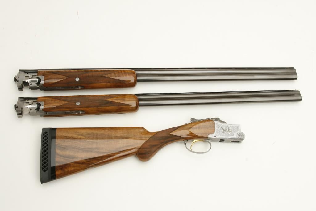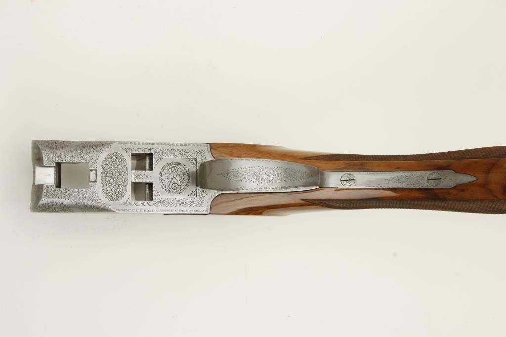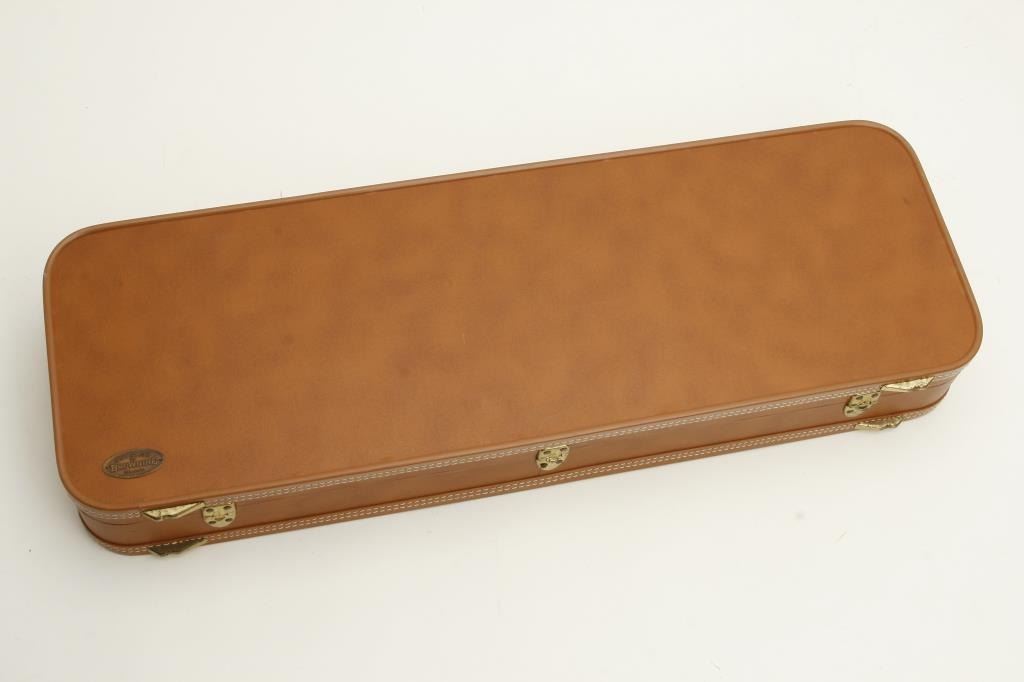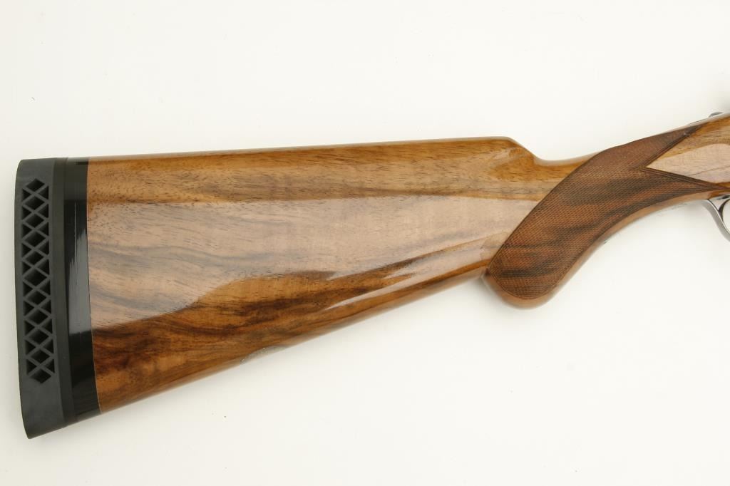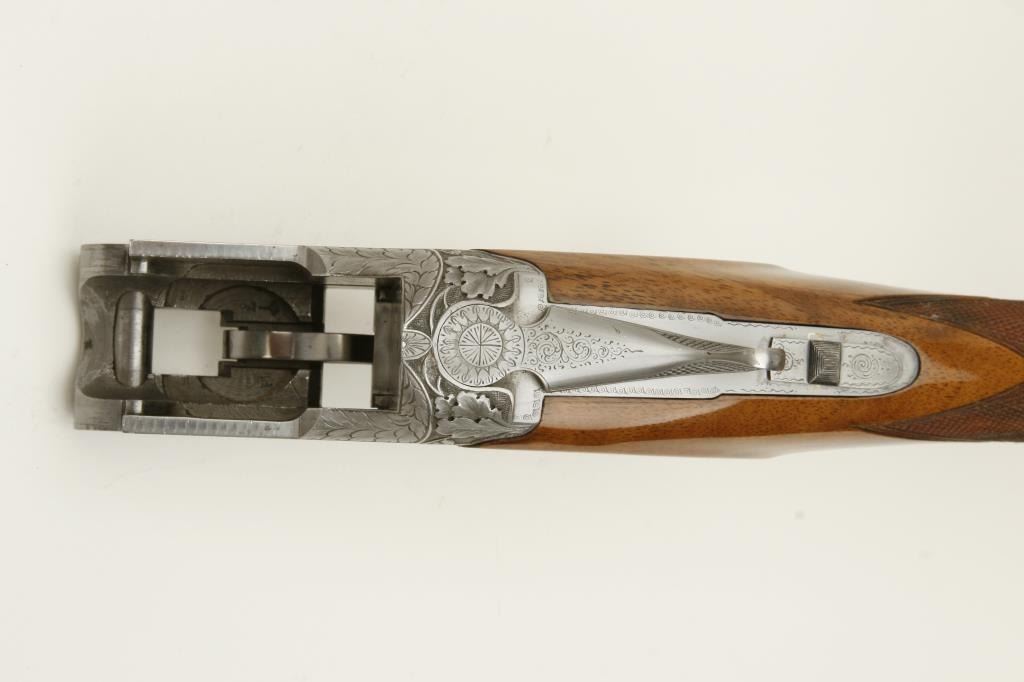 Belgian made Browning Pigeon Grade two barrel set, 20 gauge, 28” O/U ventilated rib barrels, Full-Modified and Full-Improved Cylinder choked, single gold trigger, blue barrels, engraved bright receiver, long tang, deluxe checkered wood stocks with round knob; L.O.P. is 12.75” to end of wood and 14.25” to end of Pachmayr hard rubber butt pad, S/N 31075V4, in overall excellent to like new condition; accompanied by a Browning lined leather suitcase style hard case. (Modern). Est.: $5,000-$10,000.