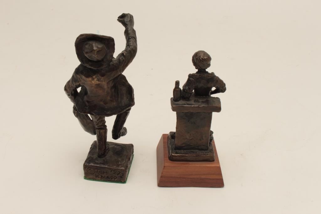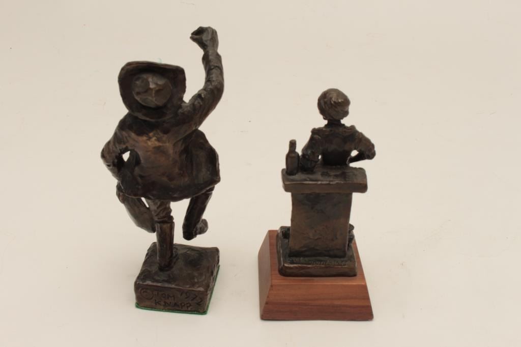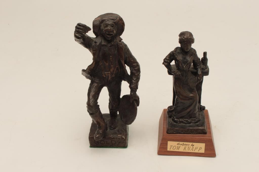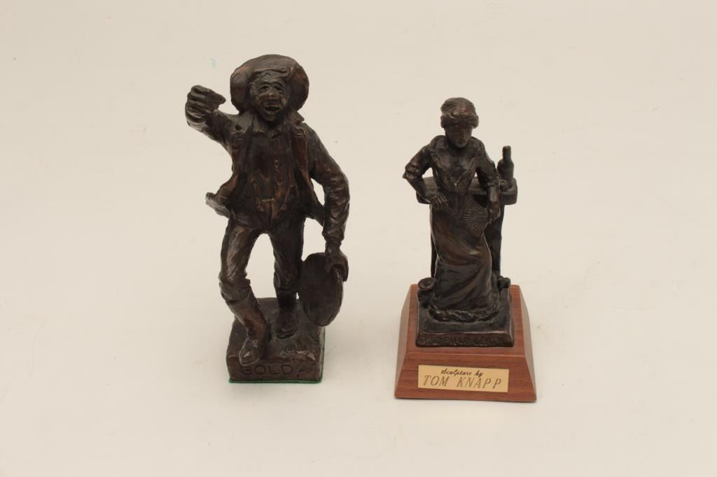 Bronze entitled “Gold” by Tom Knapp by Arrowsmith, Santa Fe, N.M. along with “Gold Field Girl” bronze; 2 total; 1 approximately 3.25” x 3.25” x 6.75”; the other approximately 2.375” x 2.375” x 5.75”.From the estate of Elmer E. Taylor. Est.: $150-$300.