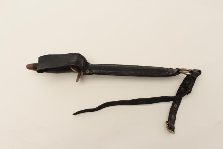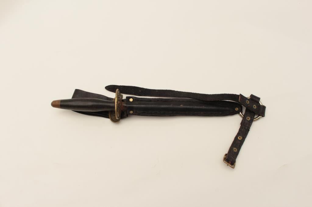 Dagger made from 18th century small sword; grip also turned and replaced grip to be used as a plug bayonet; later handmade leg scabbard with tie down and brass ring; approximately 14” overall with an 8.5” blade; dark patina on blade, good to very good overall condition. Est.: $150-$300.