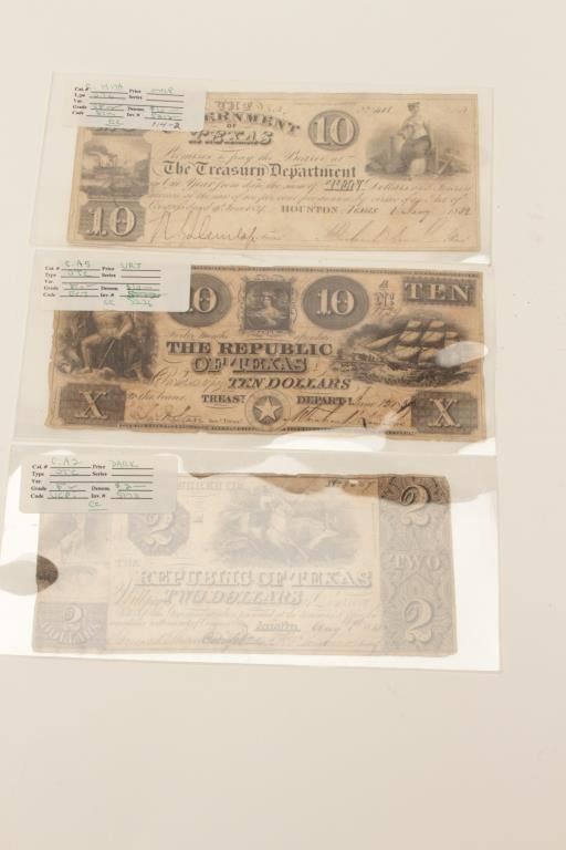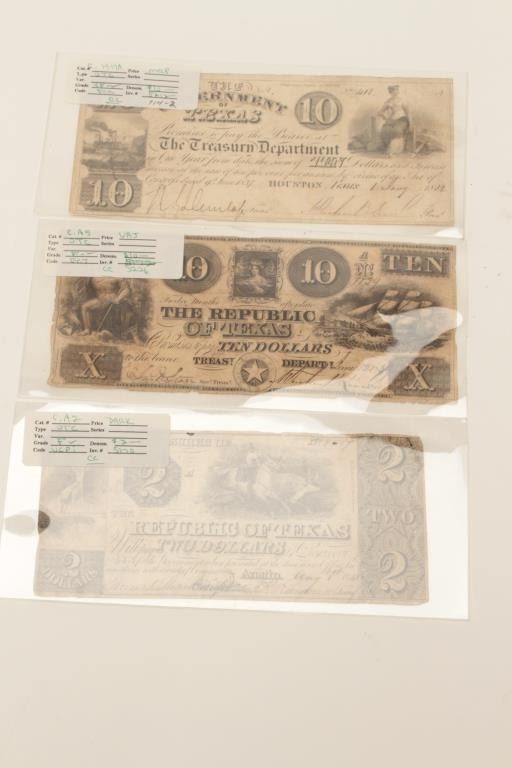 Lot of 3 Texas Treasury notes including: 1. Republic of Texas $10 Treasury Dept. note, hand signed by Sec. Treasurer and President, dated 1829, cancelled with small cuts; very good + condition; some tatters and loss. 2.Gov’t of Texas Treasury Dept. $10 note; Houston, Tex./Jan. 1839; signed Treasurer and President, #418. Steamboat and lady printed on one side only; very good to almost fine condition. 3. Republic of Texas $2 treasury note; Austin issue, 1848, #8567 numbered and signed by Treasurer and President; great scene of cowboy roping steer and antelope; very good condition, printed on only one side; earliest scene of American cowboy wehave seen; GREAT LOT! Est.: $750-$1,500.