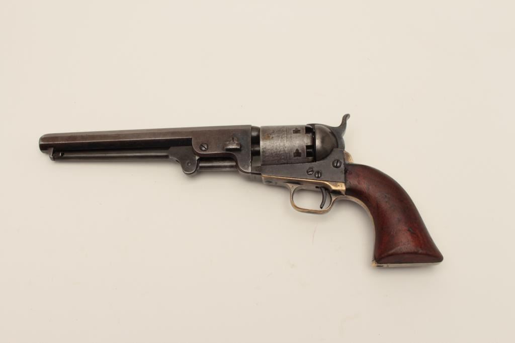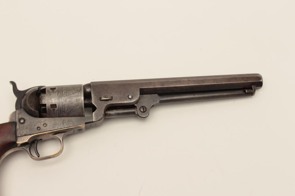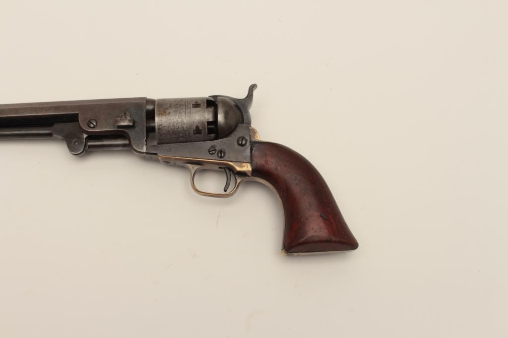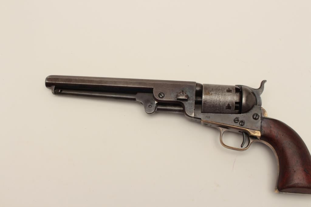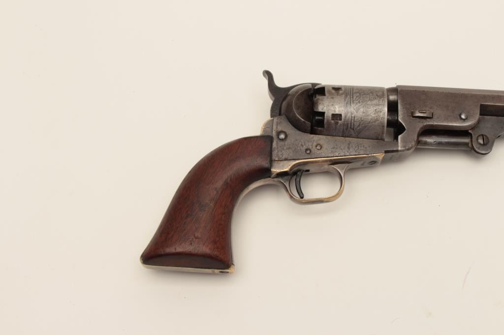 Early Colt Model 1851 small guard Navy, S/N 30406. This pistol has a very pleasing appearance and shows 10%-30% blue on the barrel with evening drifting and toning to patina with some bright areas. Sharp and good address with muzzle wear from holster. 50%-60% cylinder scene with patent marks and engagement dates visible and Ornsby signature visible under magnification. Faint traces of colors on the frame, lever, and hammer. Good frame marking. The cylinder has been cleaned lightly long ago. 30%-50% darkened original silver on the straps. The grips are good to very good with 30%-40% varnish and normal wear at the edges with a few marks and minorimperfections along with small losses of wood at the inside of the “Toe”. All matching visible serial numbers. Beautiful blue and case colors under the lever where protected. The action is tight. A nice California goldrush era ’51 Navy. (Antique) Est.: $1500-$3000