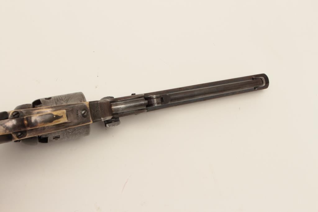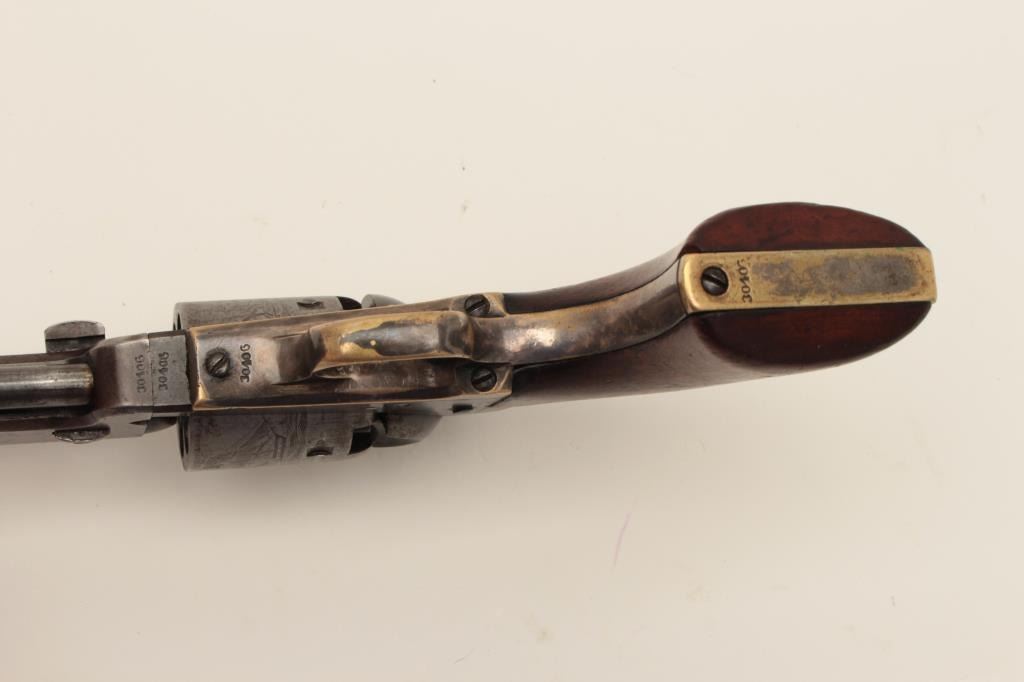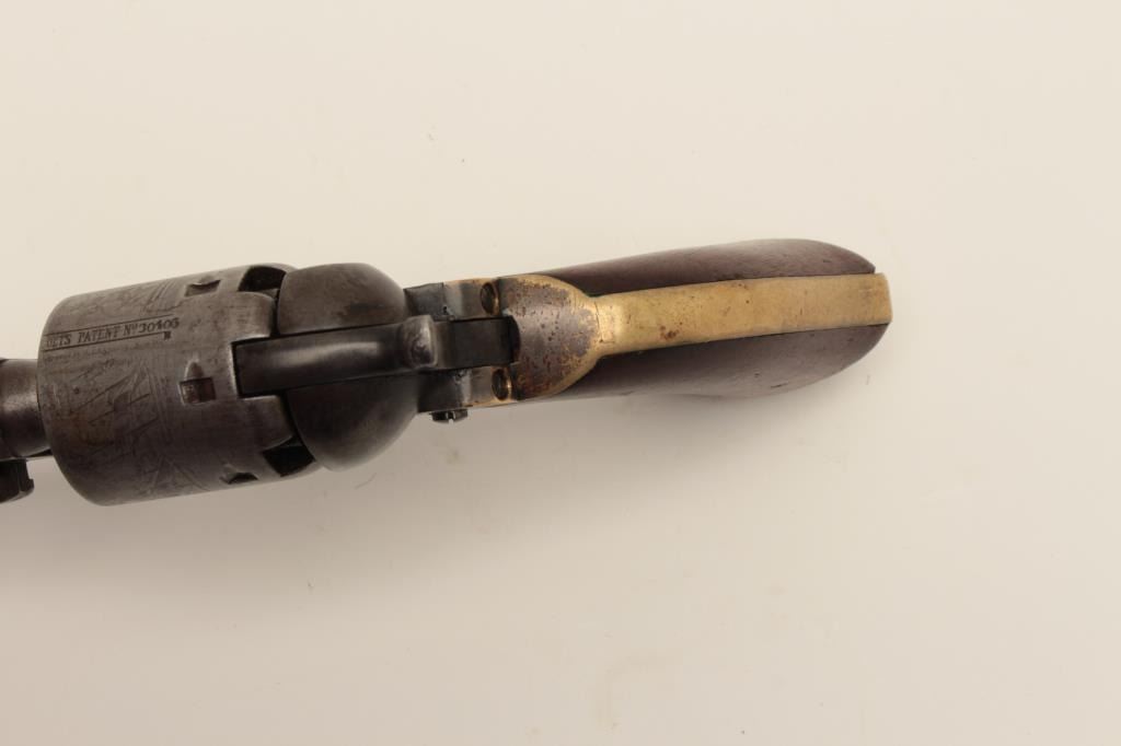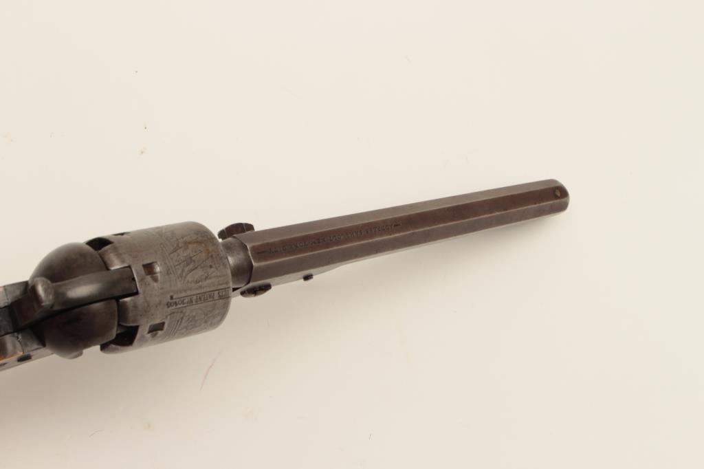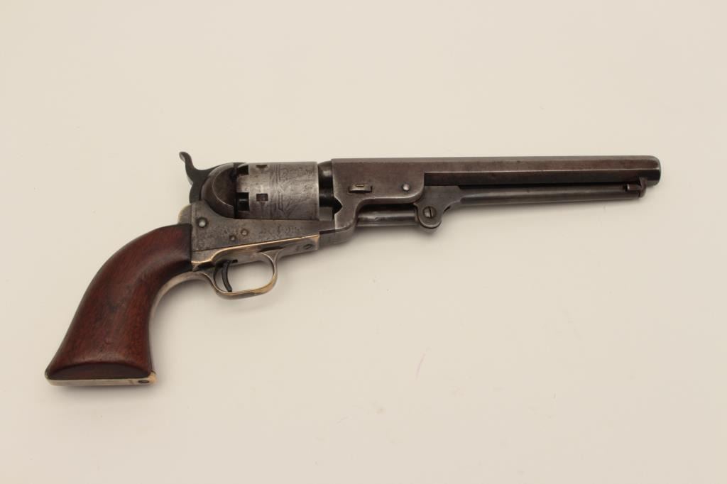 Early Colt Model 1851 small guard Navy, S/N 30406. This pistol has a very pleasing appearance and shows 10%-30% blue on the barrel with evening drifting and toning to patina with some bright areas. Sharp and good address with muzzle wear from holster. 50%-60% cylinder scene with patent marks and engagement dates visible and Ornsby signature visible under magnification. Faint traces of colors on the frame, lever, and hammer. Good frame marking. The cylinder has been cleaned lightly long ago. 30%-50% darkened original silver on the straps. The grips are good to very good with 30%-40% varnish and normal wear at the edges with a few marks and minorimperfections along with small losses of wood at the inside of the “Toe”. All matching visible serial numbers. Beautiful blue and case colors under the lever where protected. The action is tight. A nice California goldrush era ’51 Navy. (Antique) Est.: $1500-$3000