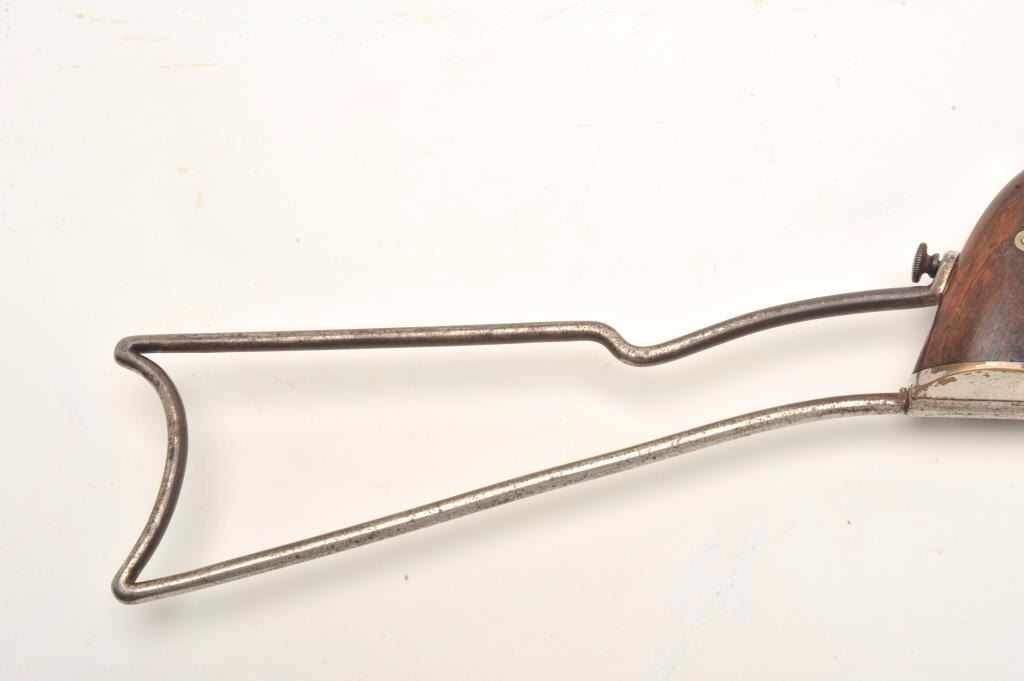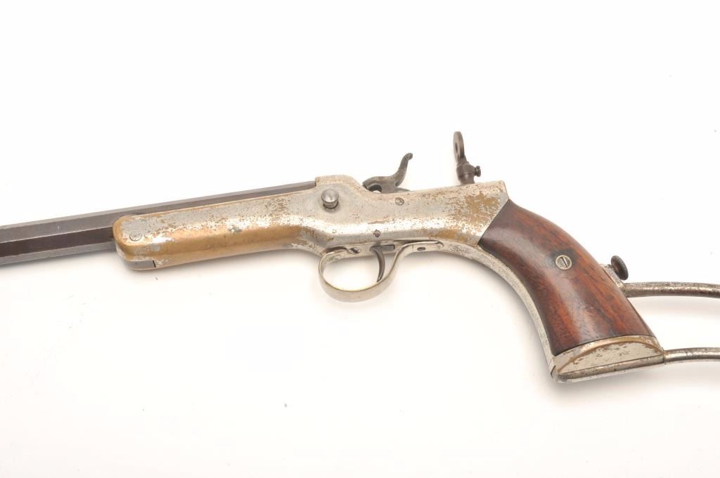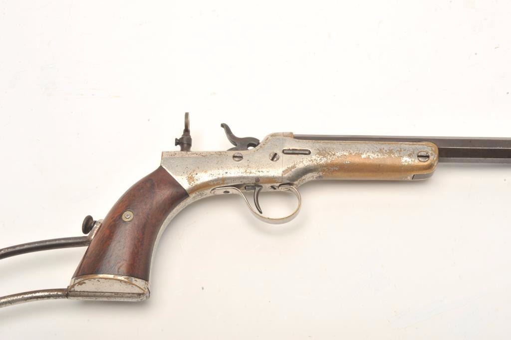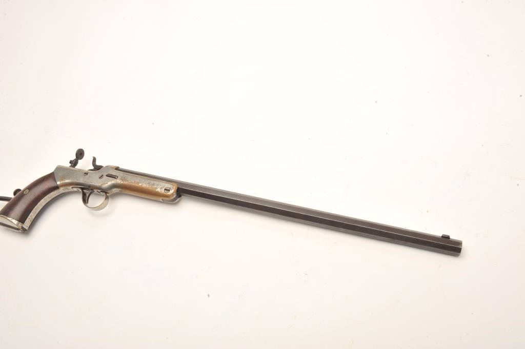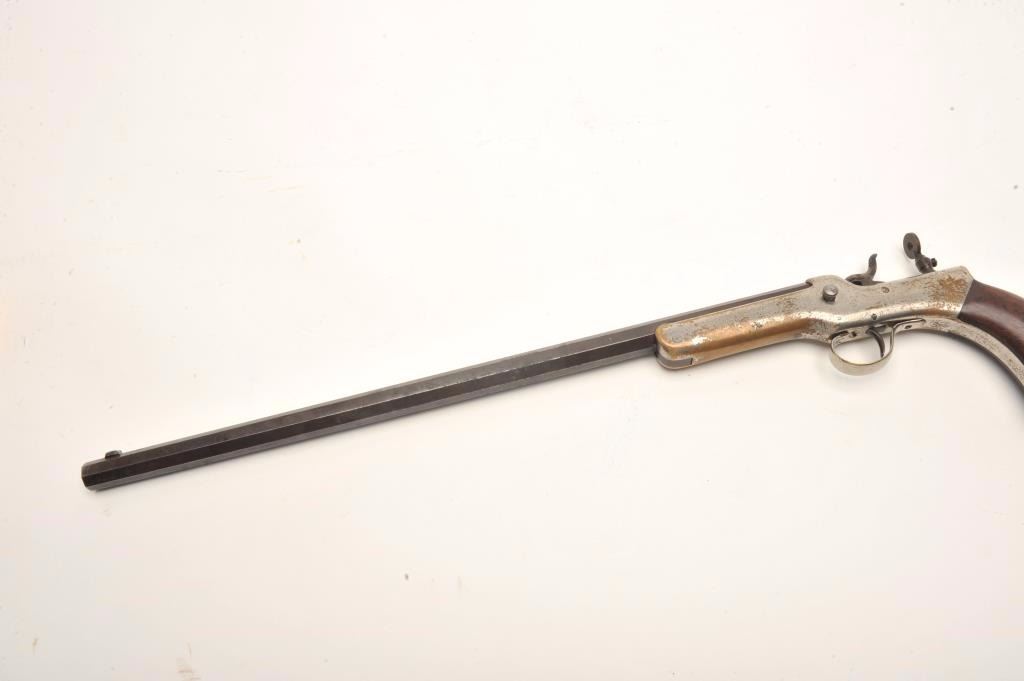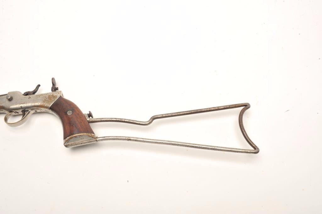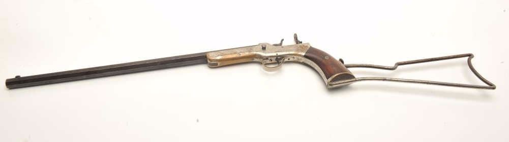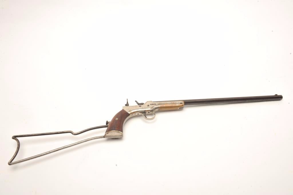 Experimental pocket rifle attributed to J.V. Setter of New England with a 16 ¼” octagon barrel in .25 caliber center fire and measures 31 ½” with stock attached. Nickel on brass frame. No serial numbers or markingsvisible. Good to very good condition overall with near fine grips. The bore is bright and very good plus to almost near fine. Peep style tang sight. Only example of this configuration and frame profile we haveviewed. (Antique) Est.: $1800-1600