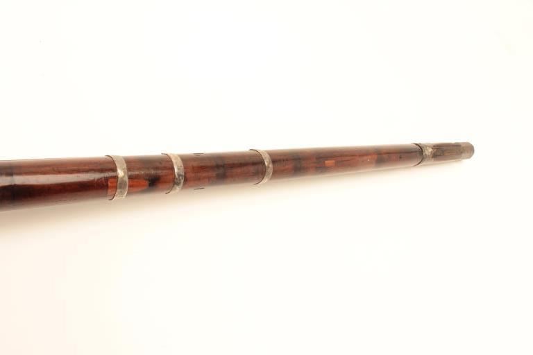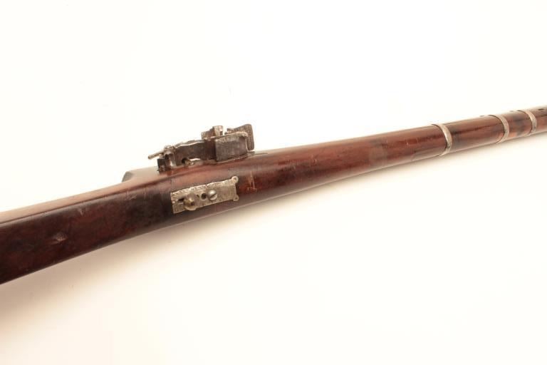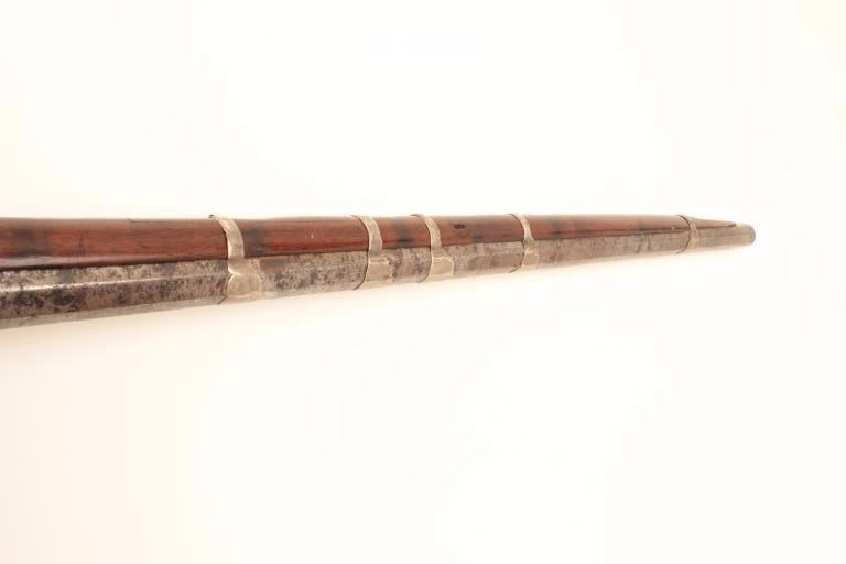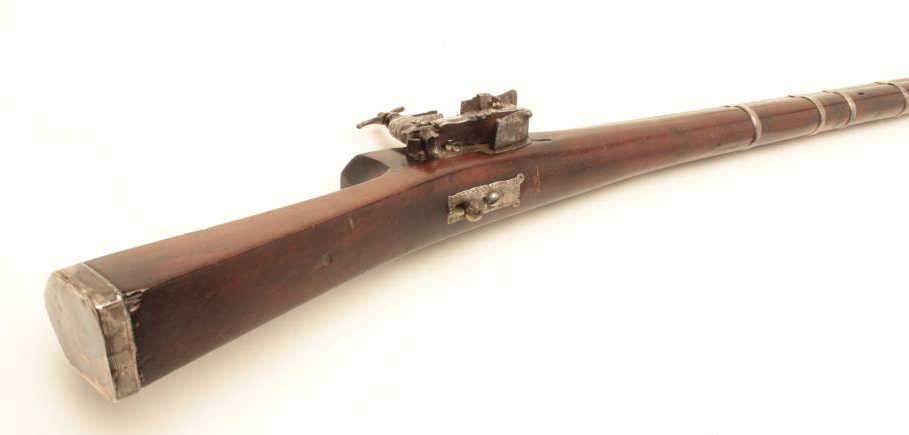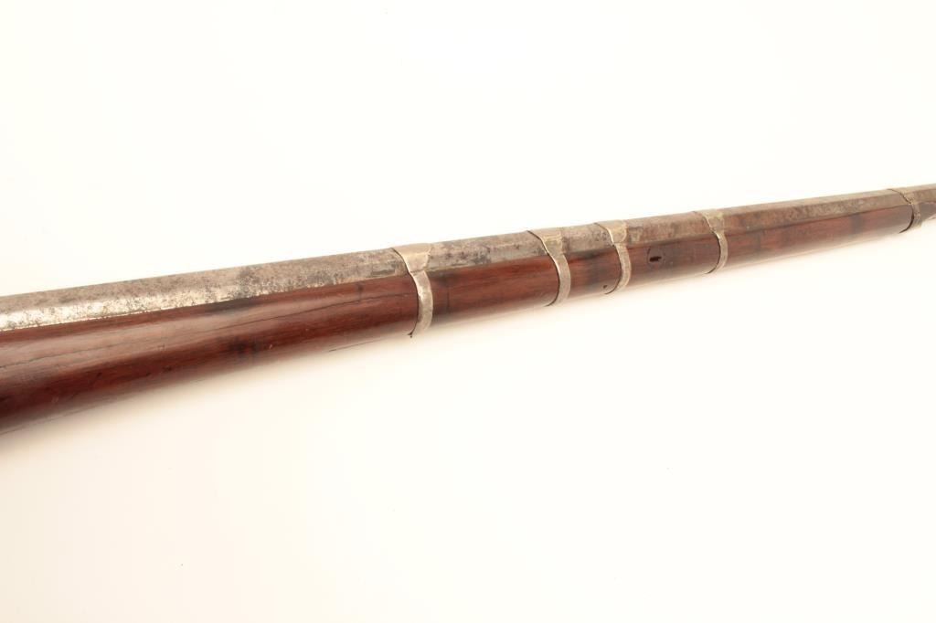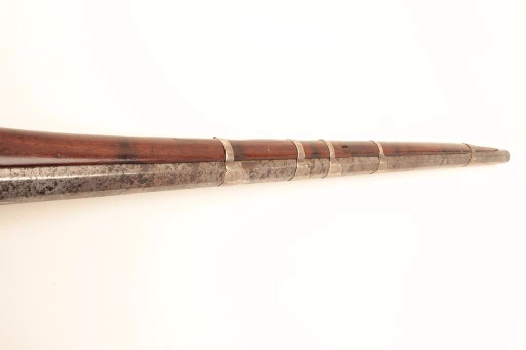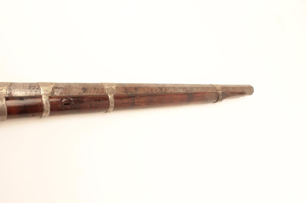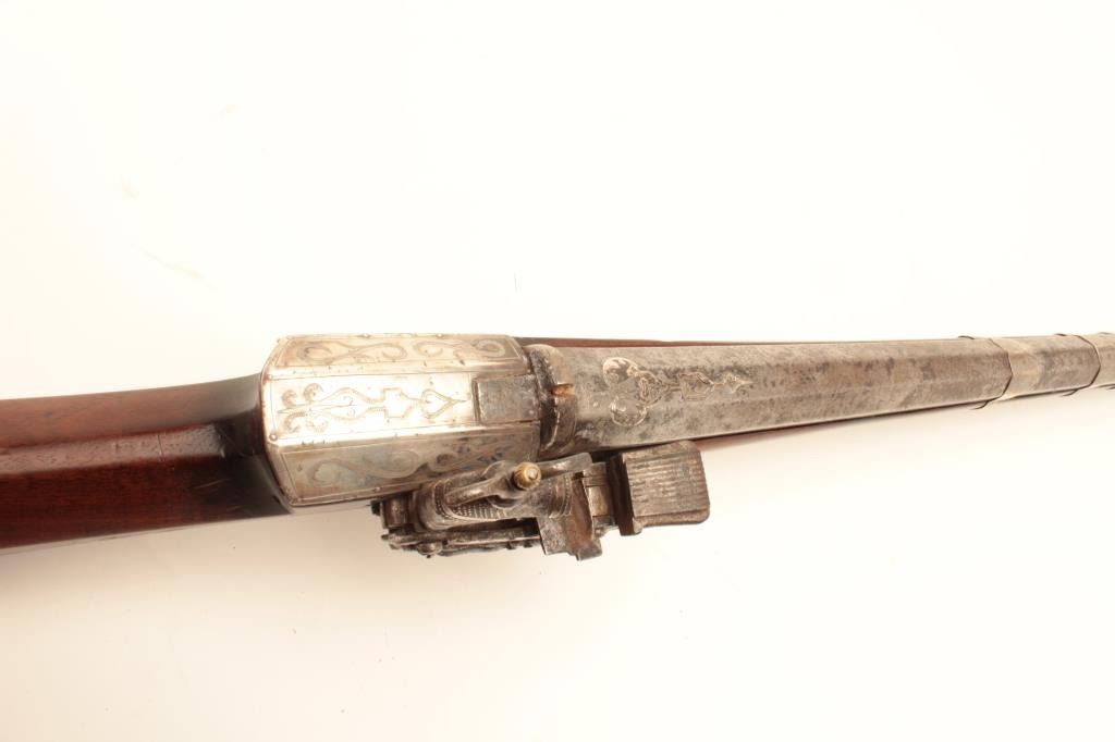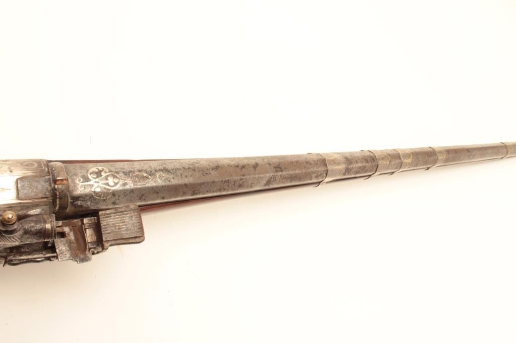 High quality Ottoman Turk flintlock miquelet carbine with fancy silver ornamentation circa 18th to early 19th century. The barrel measures 34” and 44” overall. Heavy octagon barrel of .80 plus caliber smoothbore. Nicemarking on both the lock and Damascus barrel. The lock is sheathed in sheet silver that is hand engraved. More silver sheet work at the tang area and at the butt as a cap. The wood has been refinished. The condition is goodoverall with some pitting on the barrel. From local estate. (Antique) Est.: $600-$1200