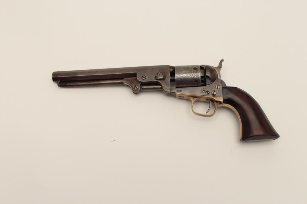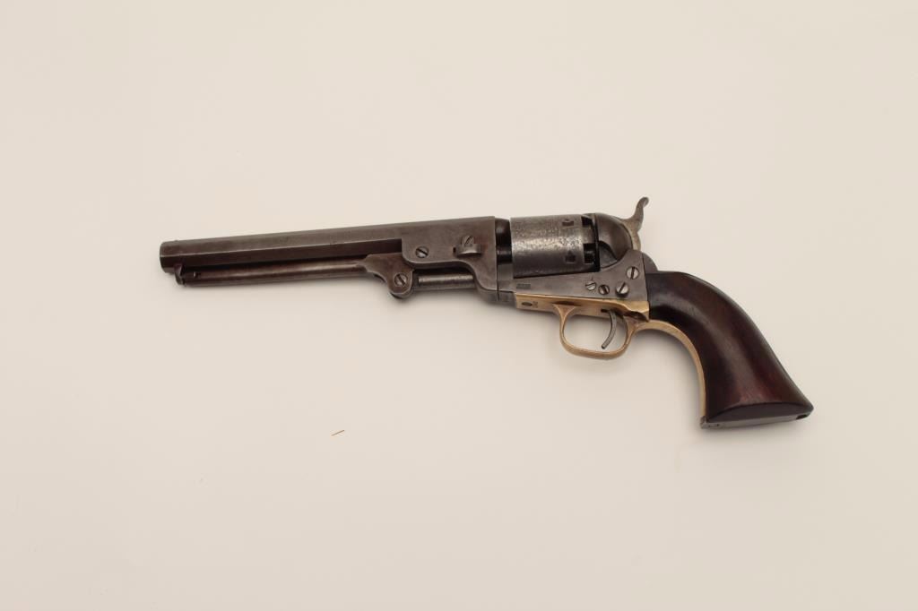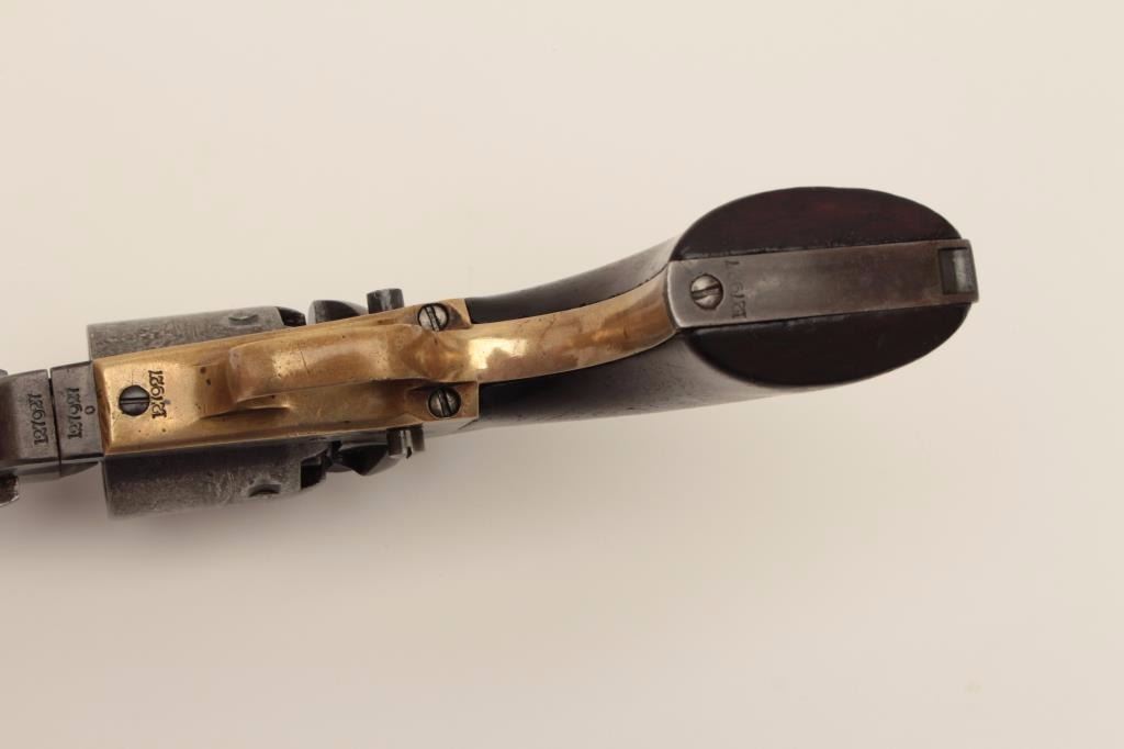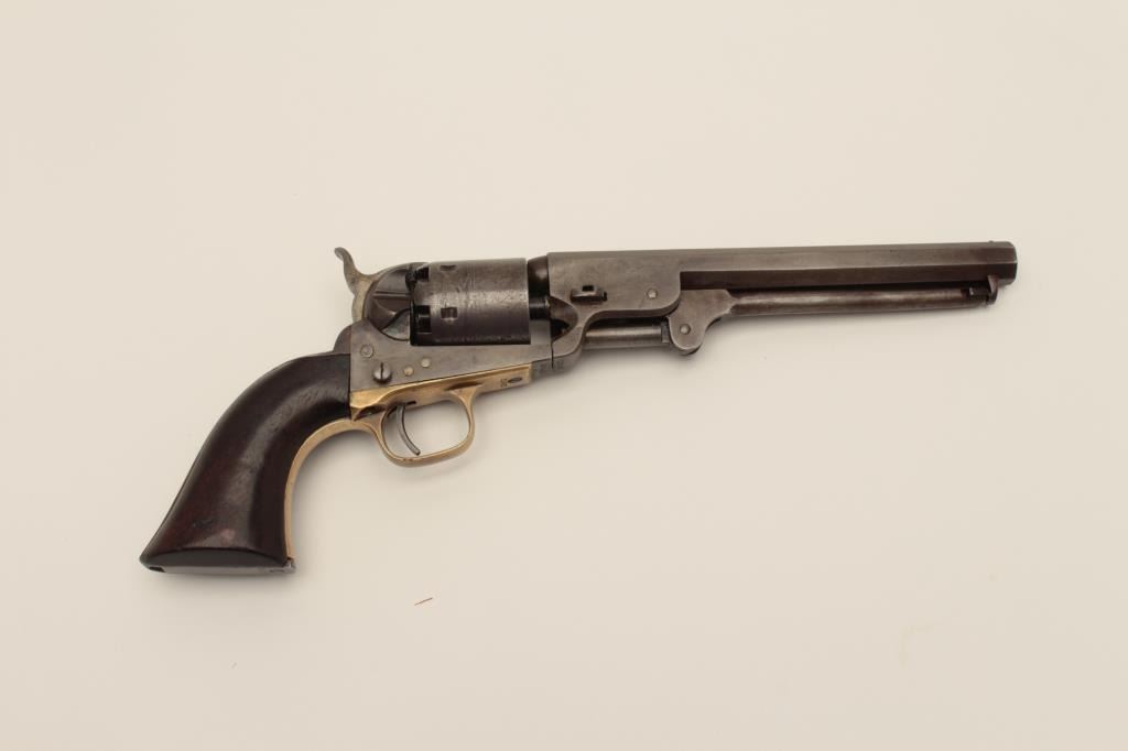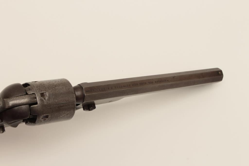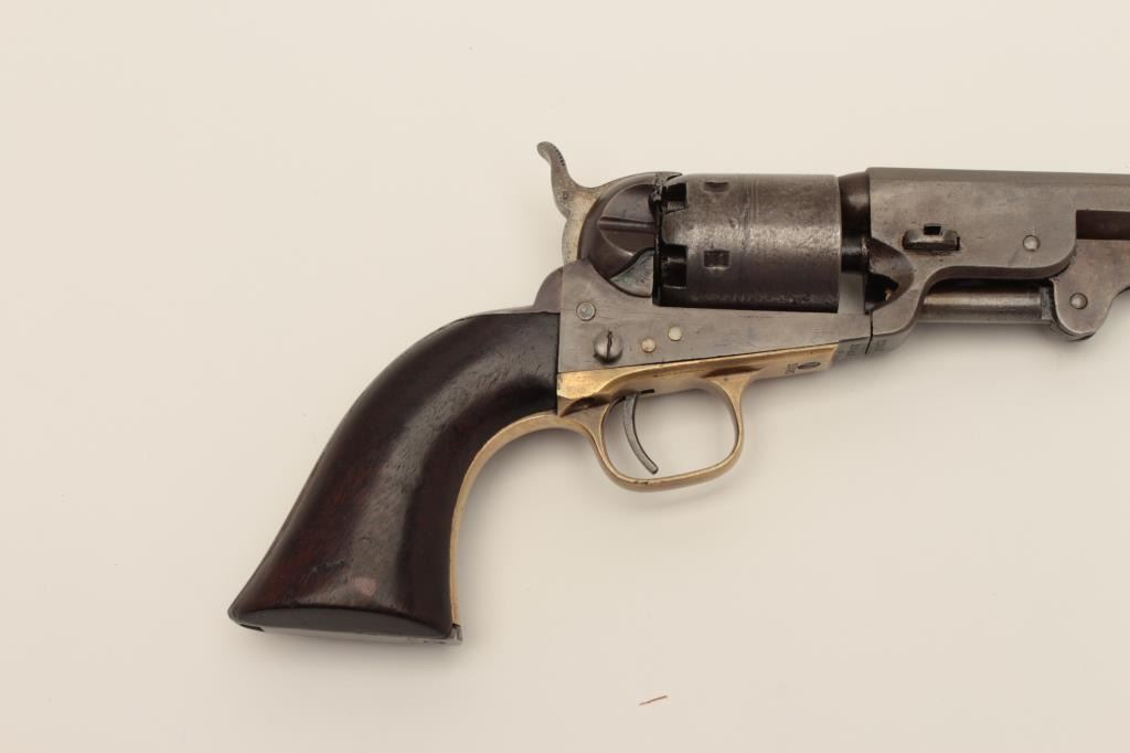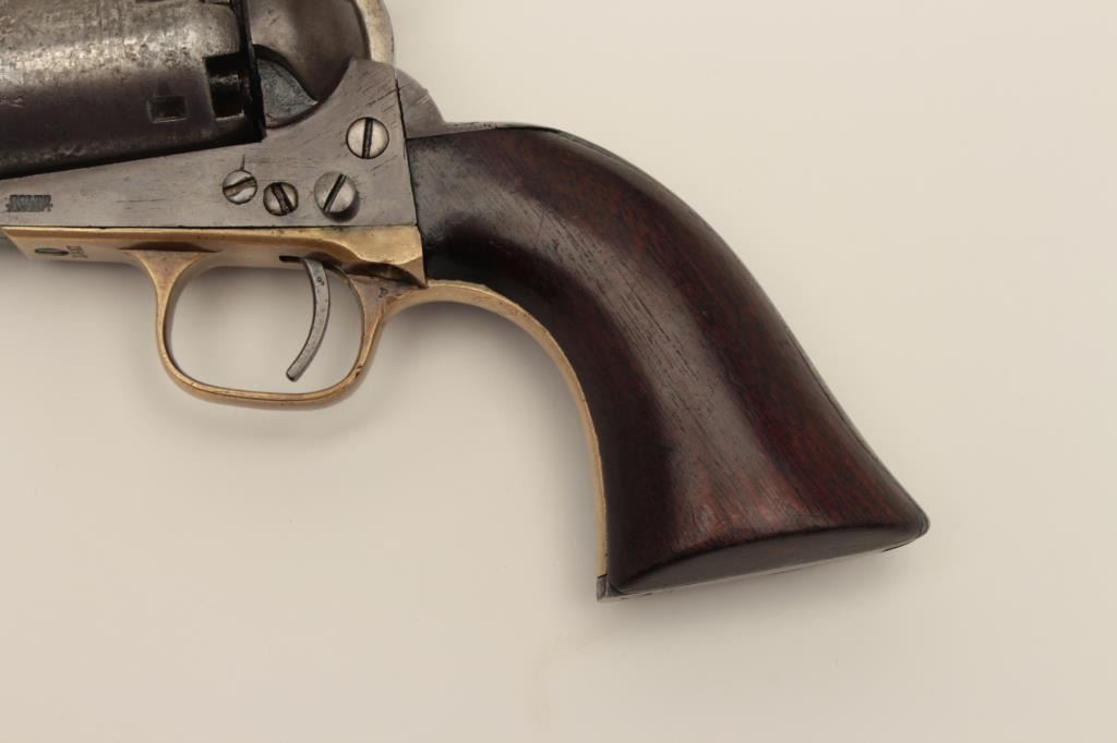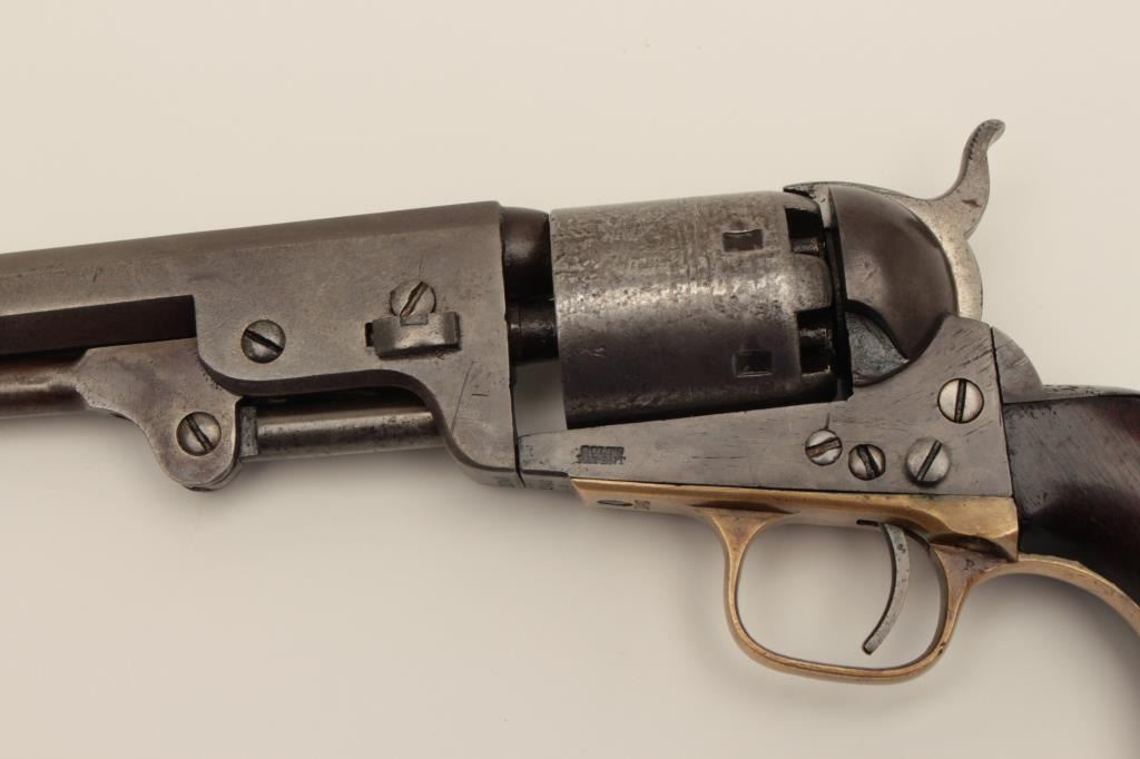 Colt 1851 4th Model Navy revolver 4 screw cut for shoulder stock with brass guard and New York address, S/N 127927 (O) marking under the number which indicates supplied with shoulder stock. This revolver is in goodcondition showing some light cleaning and coloring. Traces of cylinder scene with minor pitting and scratching. Sharp address and patent markings. All matching visible serial numbers. The grips are very good plus withsome oil staining a slight dark. A scarce variation. Est.: $1500-$3000