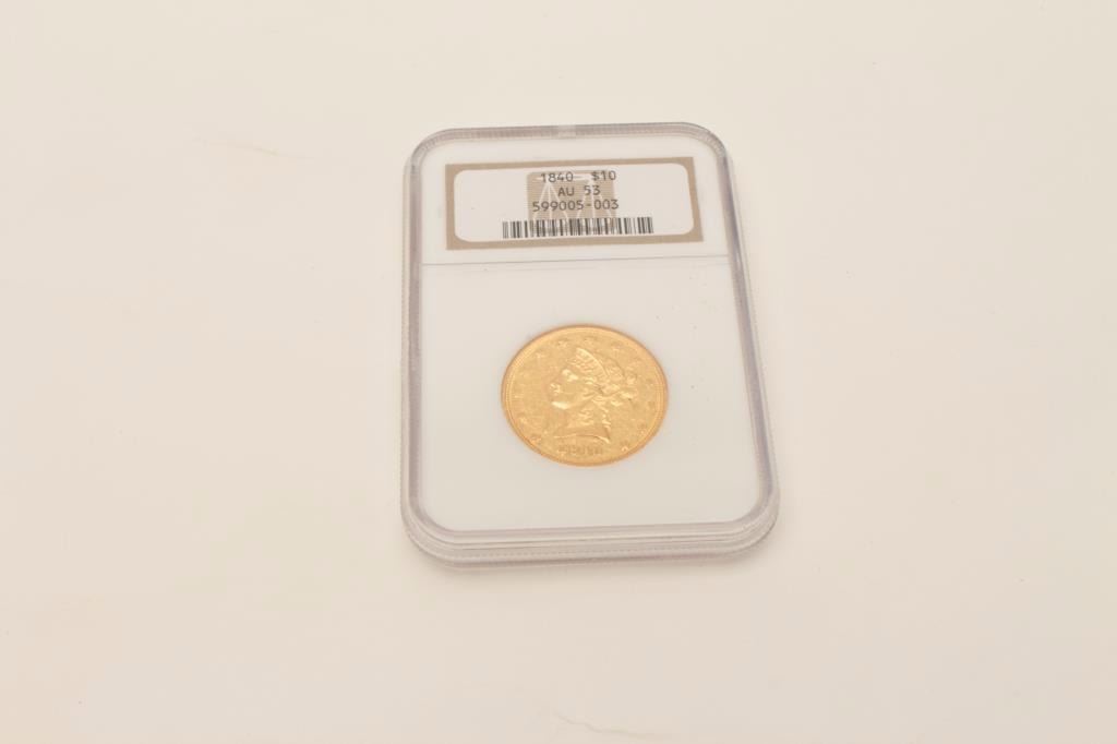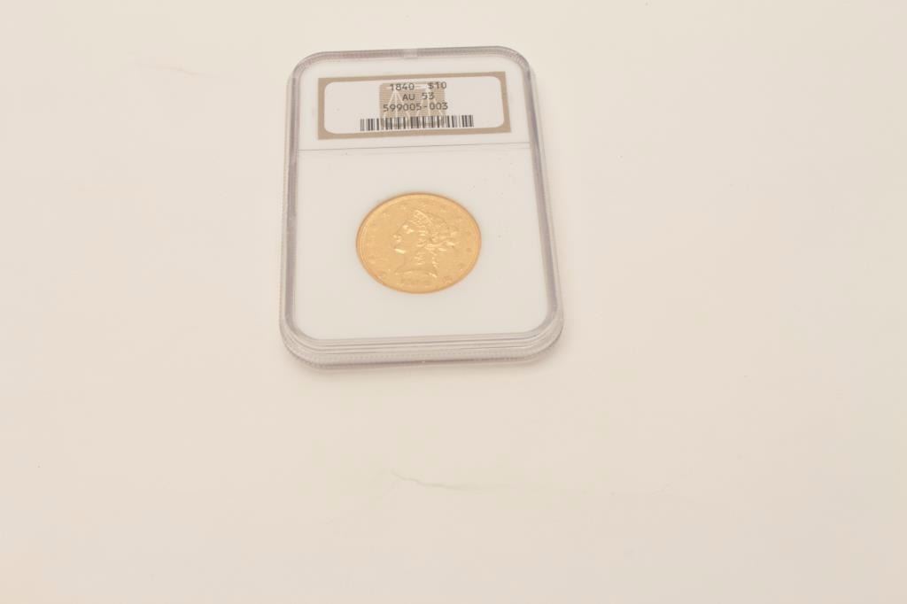 N.G.C. graded and slabbed $10 U.S. gold, AU53 and dated 1840. Old collector’s horde. Est.: $600-$1200