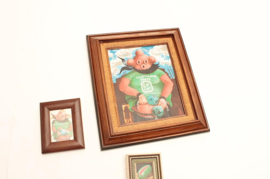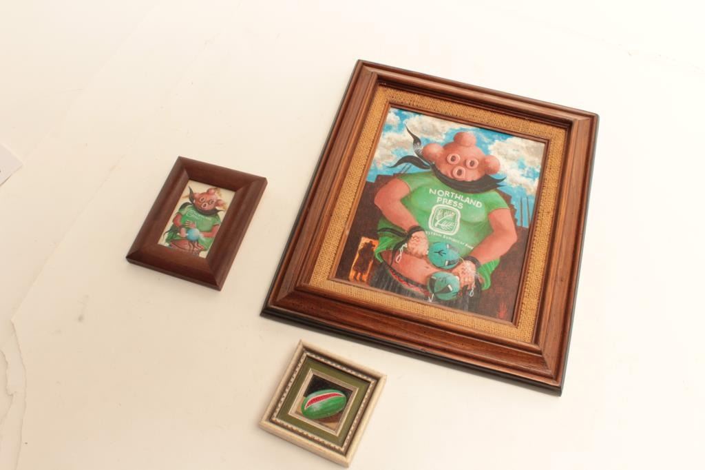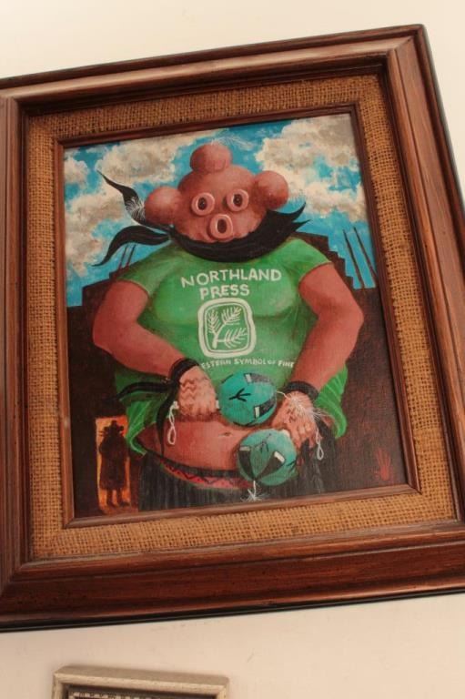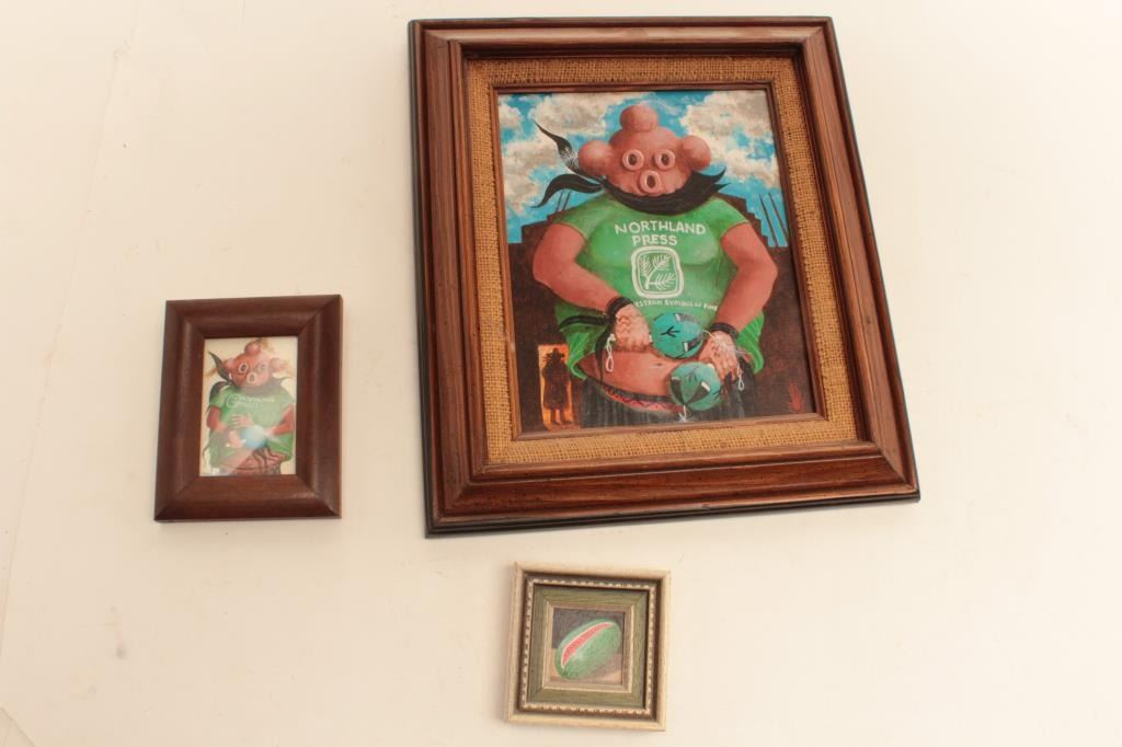 Lot 1749 Oil on canvas – Mud Head Kachina in Northland Press T-shirt with 2 miniatures (1982); gifted by Pa