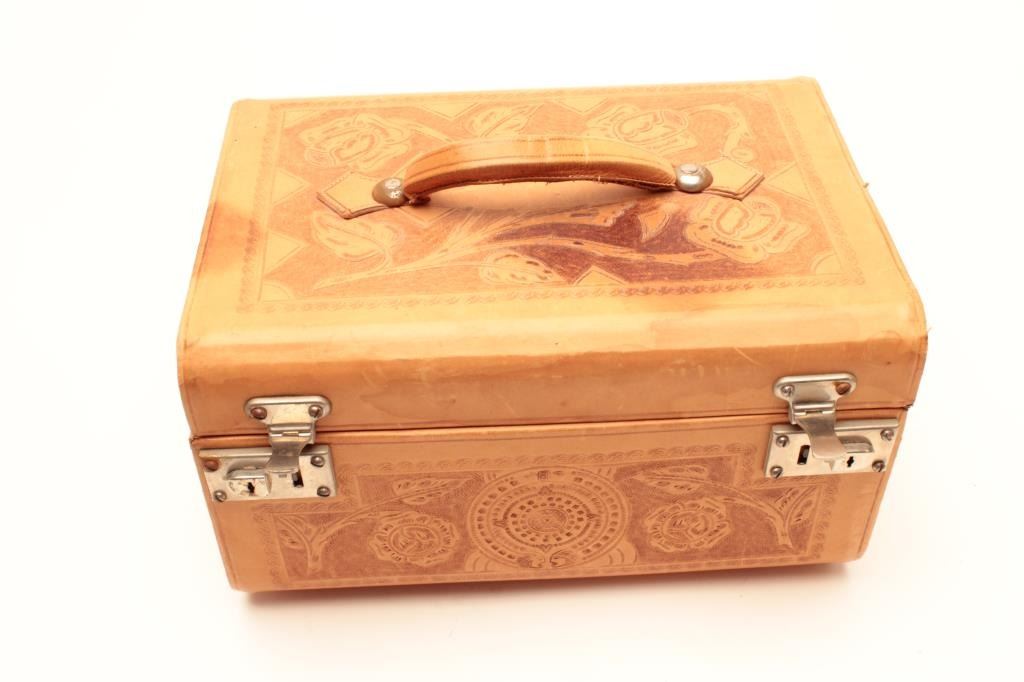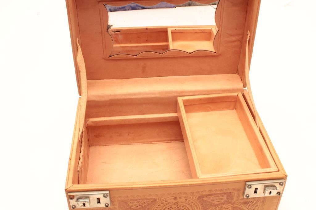 Lot 1903 Mexican tooled leather Train Case. The case measures 12” long by 8 ½” across and 6 ½” deep. The
