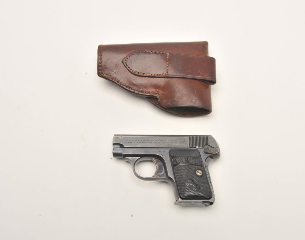 Colt Model 1908 semi-automatic pocket pistol, .25 caliber, 2” barrel, blued finish, checkered black hard rubber grips, S/N 381765, in overall very good to fine condition displaying the majority of itsoriginal blued finish with vivid case colors on the trigger, fine bore, crisp action, sharp markings and fine grips with two-tone magazine; also accompanied by a leather flap holster. (C&R/No PPT). Est.:$250-$500.