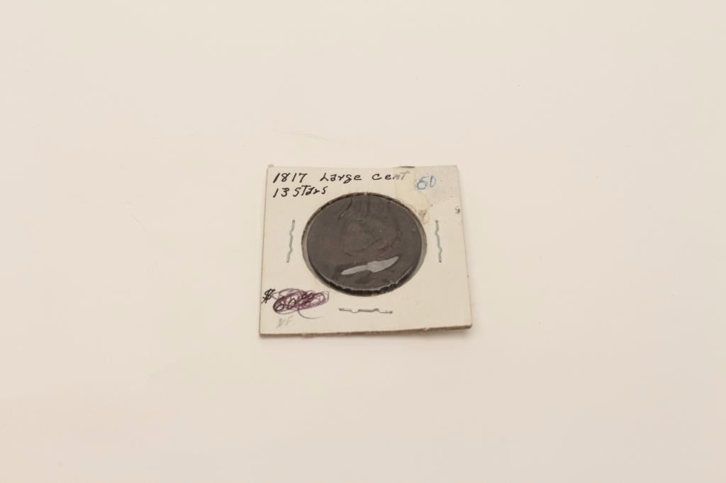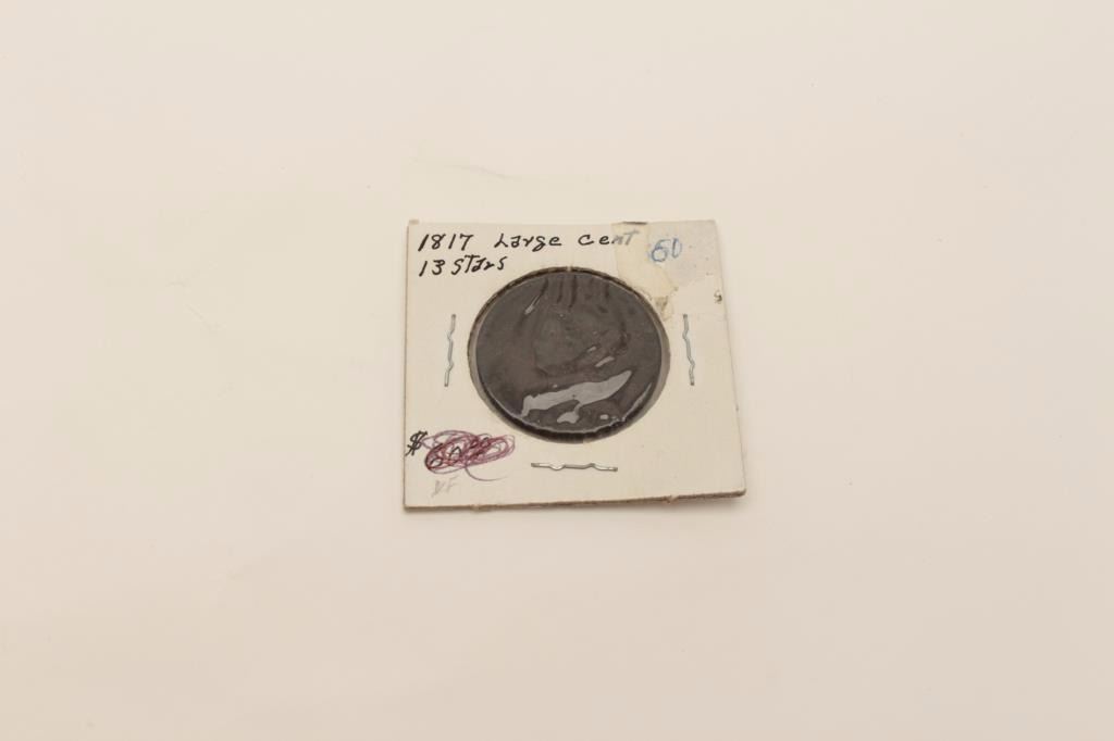 1817 large cent showing 13 stars. Not graded. Old collector’s horde. Est.: $50-$150