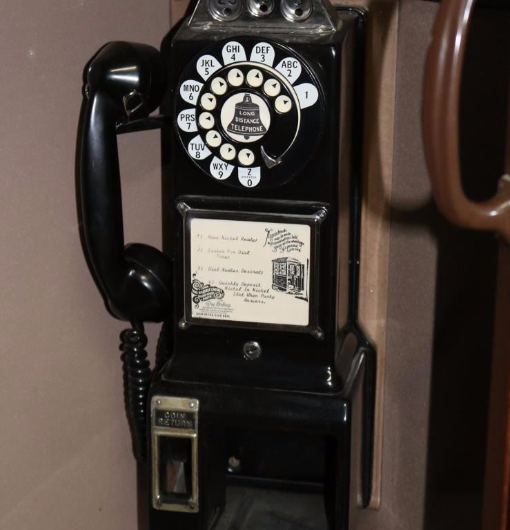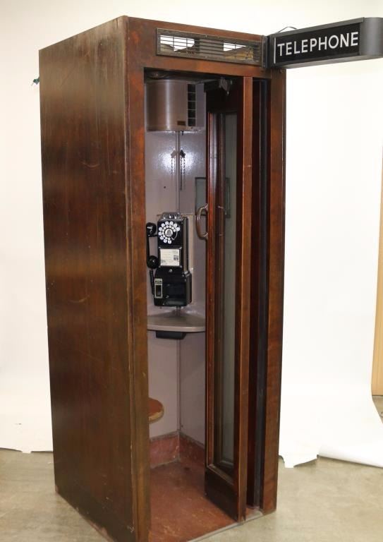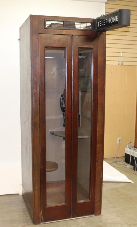 All wood construction. Metal lined with glass front folding door. Interior includes a seat with a vintage telephone 'Automatic Electric Co. Chicago, IL', and blower. Telephone sign on exterior lights up. Condition is very good overall. Measures 83"h x 31"w x 30 1/2"d.