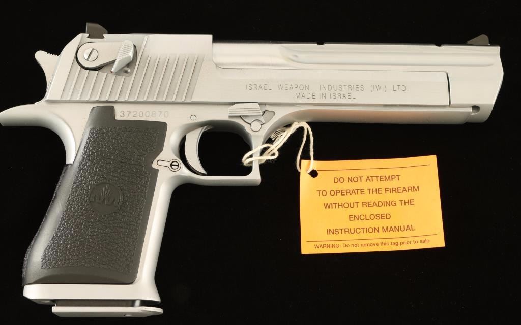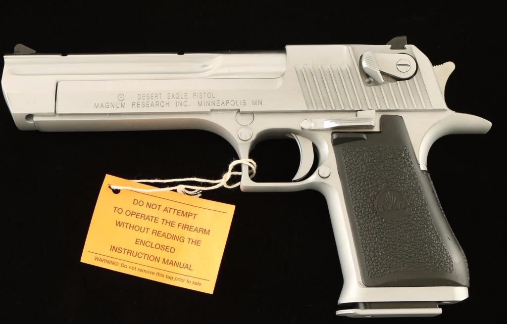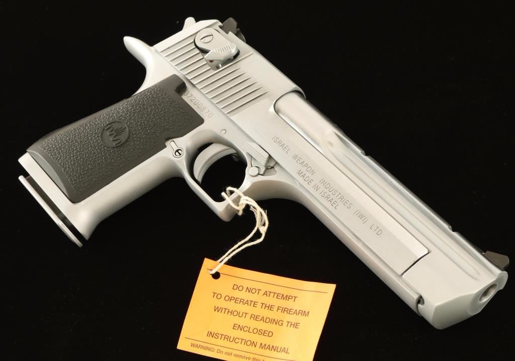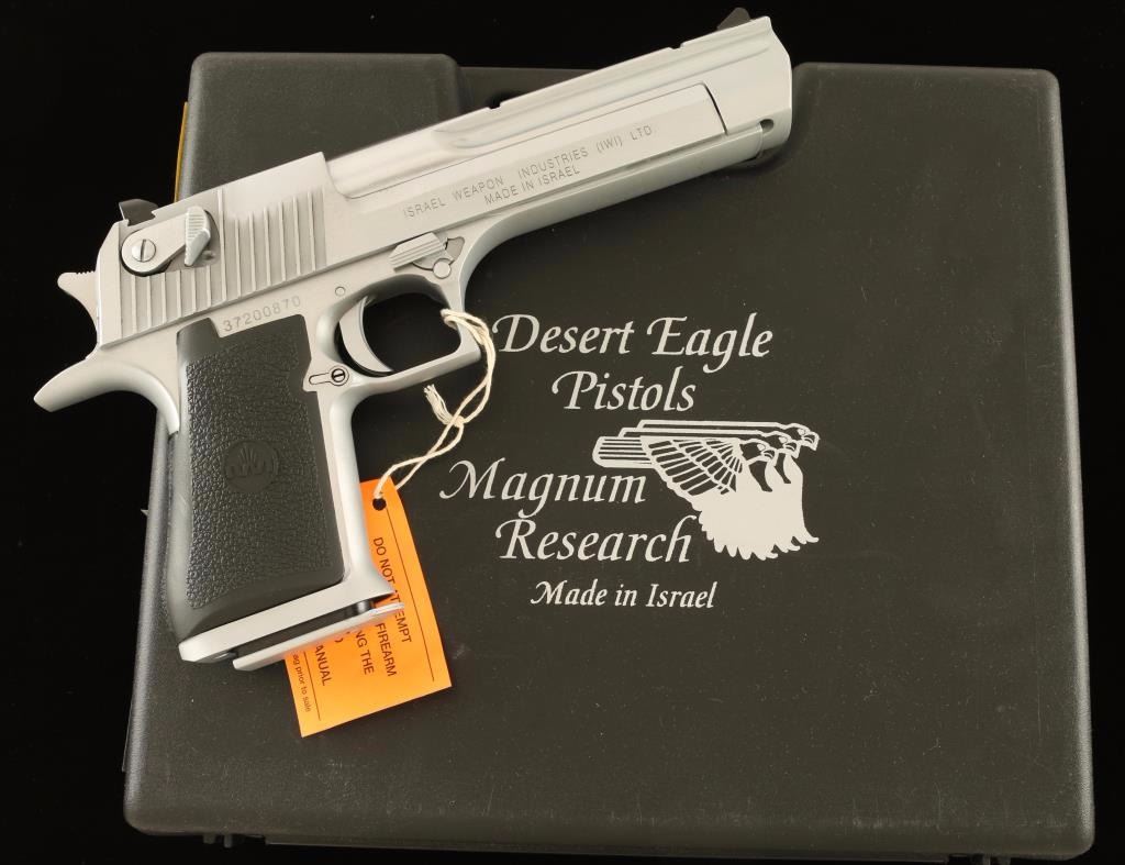 Extra large frame single-action semi-automatic pistol chambered in .44 Magnum, produced by Israel Weapon Industries for Magnum Research circa 2007. Features a brushed hard chrome finish, 6" barrel with integral weaver style scope rail, dovetailed ramp front sight & rear window sight, ambidextrous thumb safety, serrated trigger & hammer spur, push button magazine release, factory 8 round magazine dated 7-95, beavertail frame and one-piece textured black rubber wrap-around grip with IWI insignias. Includes the original factory hard case with documents, tool, spent case and lock. Pistol shows a few light handling marks and a deep scratch on left side of the frame under the slide. Action is strong, bore is pristine and grips are fine. Condition is near excellent in box. ***Modern Firearm***