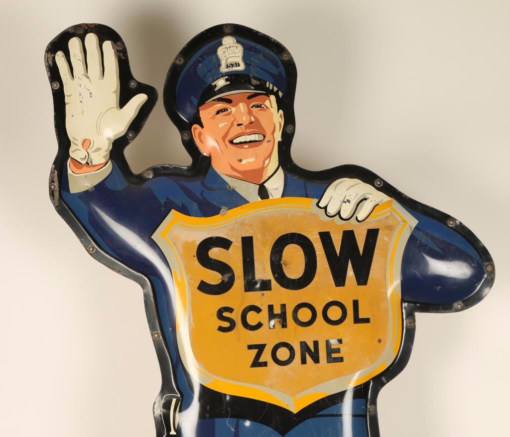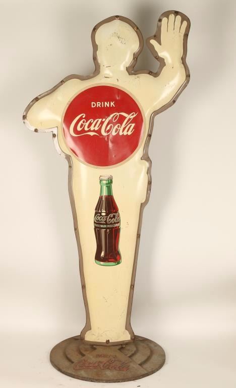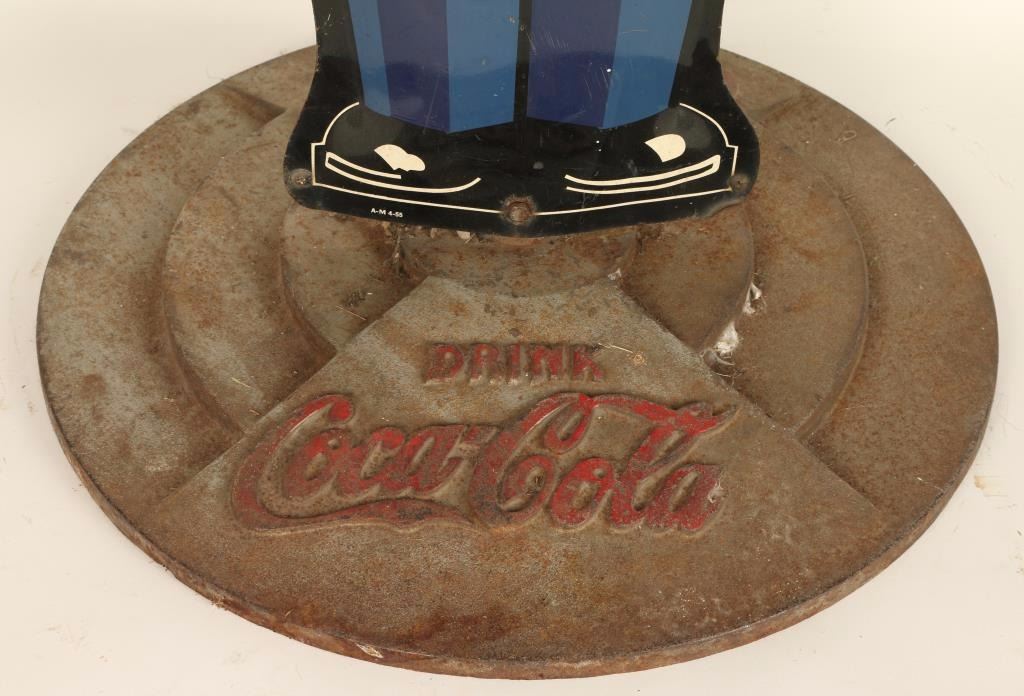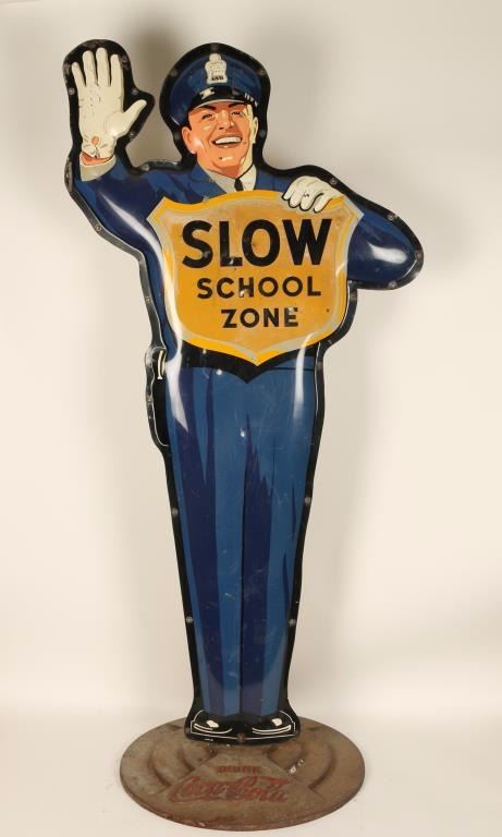 Two sided sign with police man/ crossing guard on one side and a Coca Cola logo on the other. On a metal base which also has the logo. 62 "T X 30"X 22" D base. All original. Condition-scattered losses to paint some small surface rust but overall good for age.