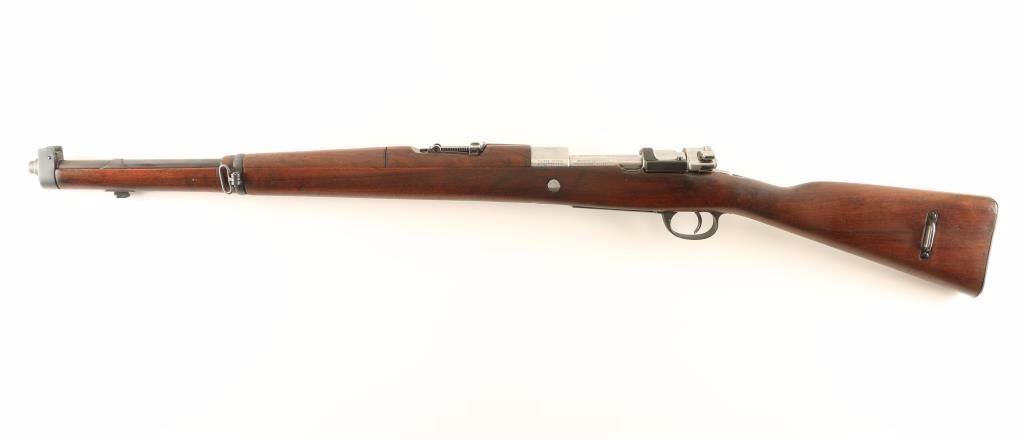 SN: B7553 Argentine military bolt-action service rifle chambered in 7.65x53mm, built in Berlin by DWM circa 1910-1911. Imported by JLD Enterprises of Farmington, CT with small import marks on the receiver. Features a blued 22" barrel, shrouded & dovetailed inverted 'v' front sight, tangent rear sight graduated to 1,400 meters, bayonet lug, bent bolt handle, manual safety on bolt, internal box magazine with hinged floorplate, smooth trigger, sling swivels, smooth wood handguard and full-length straight grip shoulder stock with smooth metal buttplate. Serial numbers match on the receiver, bolt handle and bottom metal. Rifle exhibits approximately 96% of it's finish intact overall showing little wear while the receiver, bolt and buttplate are in-the-white. The receiver shows light evidence of old pitting which has been cleaned. Action is smooth, bore is dull with good rifling and wood stocks are fine. Condition is near excellent. ***C&R Firearm*** ***Modern Firearm***