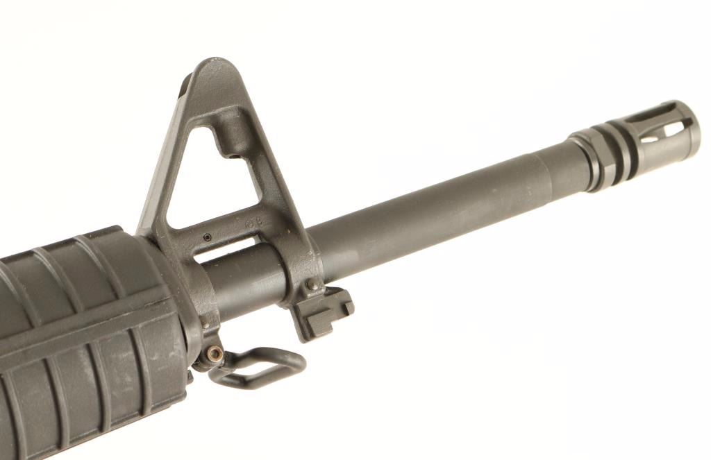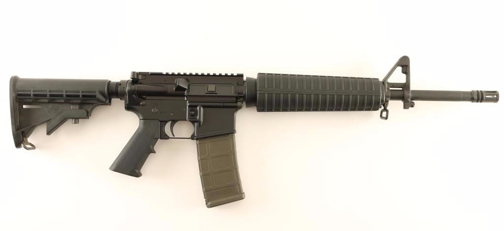 American made AR platform semi-automatic rifle chambered in 5.56x45mm. Features a matte black finish, 16.25" semi-heavy barrel, birdcage style flash hider, A2 style post front sight with bayonet lug & sling swivel. no rear sight, standard LPK, AR-15 profile BCG, standard charging handle, dust cover, shell deflector, forward assist, push button magazine release, 30 round OD green PMAG, mid-length black synthetic handguard, A2 style pistol grip and six-position collapsible black synthetic shoulder stock. Rifle exhibits approximately 98% of it's original matte black finish showing some light scuffs with no major wear observed. Action is smooth, bore is excellent, and synthetic stocks are fine. Condition is excellent. ***Modern Firearm***