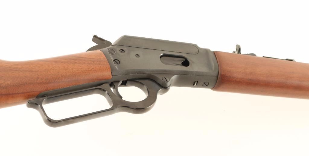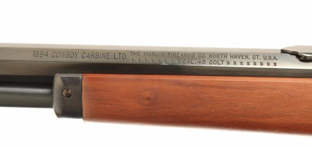 'Cowboy Carbine Limited' American made lever action repeating rifle chambered in .45 Colt. Features a blued finish, JM stamped 20" octagonal barrel, full-length magazine tube, dovetailed blade front sight with brass bead, semi-buckhorn adjustable rear sight, smooth trigger, serrated hammer spur, push button cross-bolt safety, drilled & tapped receiver, smooth walnut forend with metal cap and straight grip shoulder stock with factory black synthetic buttplate. Rifle exhibits approximately 98% of the original blued finish showing few scattered losses. Action is smooth, bore is pristine and wood stocks are fine. Condition is near new. ***Modern Firearm***