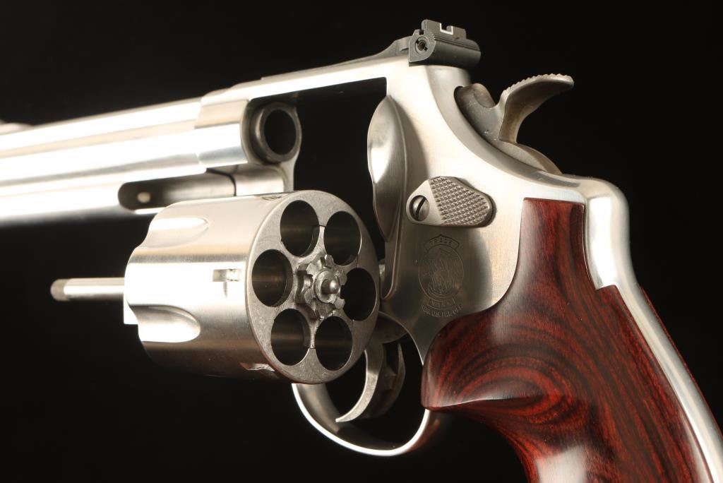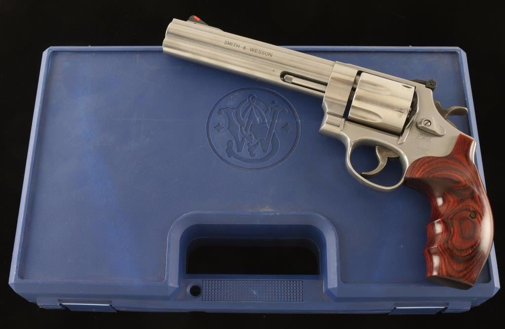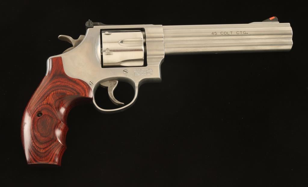 'Model of 1989' Large frame stainless steel double-action revolver chambered in .45 Colt, circa 1998-2001. Features a brushed finish, power-ported 6 1/2" full-lug barrel with serrated top rib, raised ramp front sight with orange insert, micrometer click adjustable rear window sight with white outline, fluted six-shot cylinder, .400" smooth target trigger, .500" target hammer, round butt N target frame and two-piece laminated rosewood finger groove grips. Includes the original factory hard case with documents and lock. Revolver exhibits only minor handling marks and a faint drag line on the cylinder with no major wear observed. Action is smooth with tight lock-up, bore is pristine and wood grips are fine. Condition is excellent in case. ***Modern Firearm***