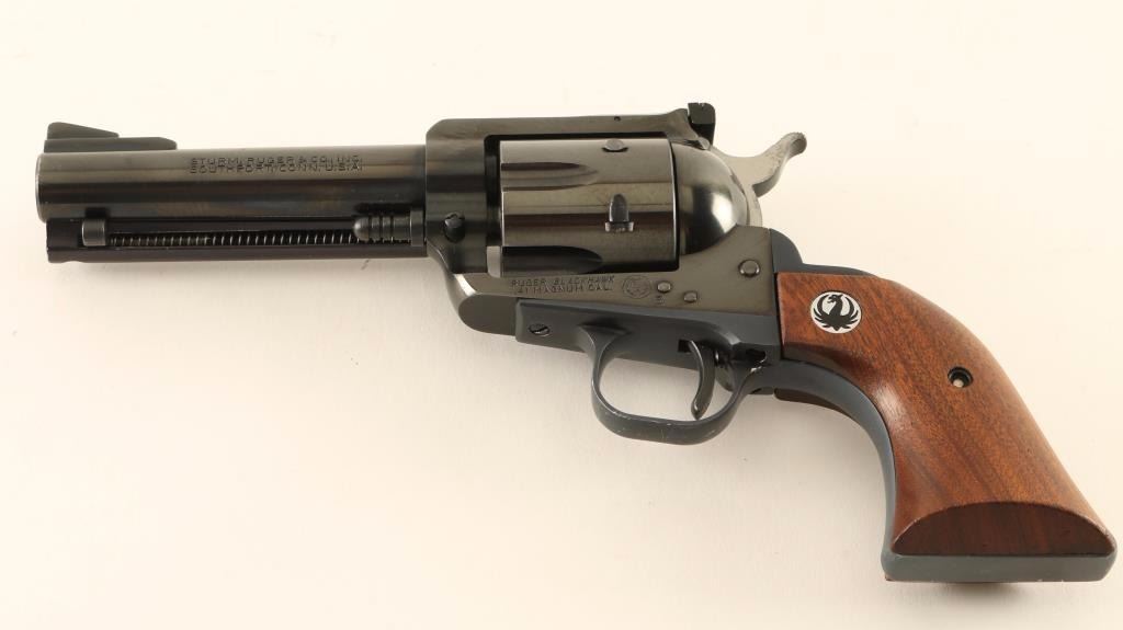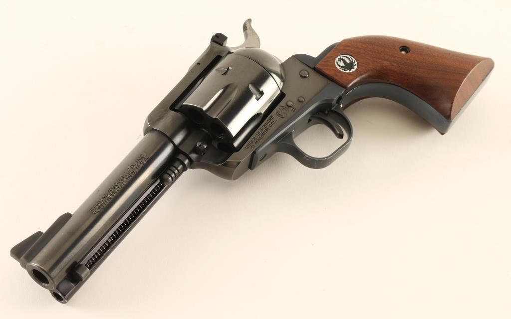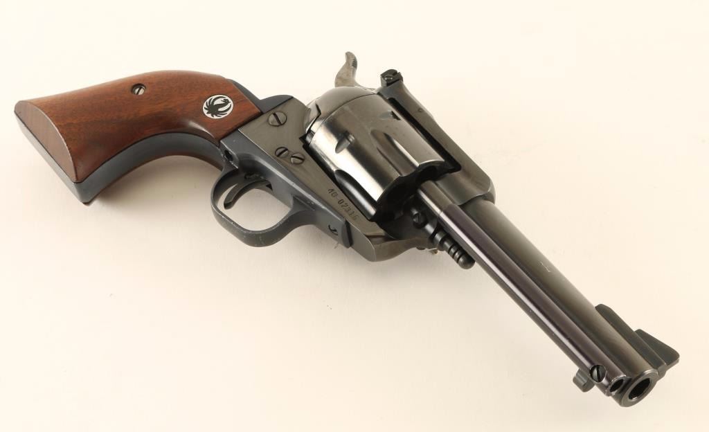 Vintage American made six-shot single action revolver chambered in .41 Magnum, circa 1969. Features a blued finish, 4 5/8" barrel, raised ramp front sight, adjustable rear window sight, ejector rod, fluted cylinder, flat top three-screw frame, smooth trigger, serrated hammer spur, black anodized aluminum alloy grip frame and two-piece smooth walnut grips with Ruger medallions. Revolver exhibits approximately 94% of it's original blued finish showing light edge wear, some small scattered scratches, a faint drag line on the cylinder and small amounts of pin prick pitting on the cylinder with a minute spot observed on the barrel. The grip frame shows fading on both grip straps and light scratches on the bottom of the trigger guard. Action is smooth with very good lock-up, bore is excellent and wood grips are fine. Condition is good to very good. ***Modern Firearm***