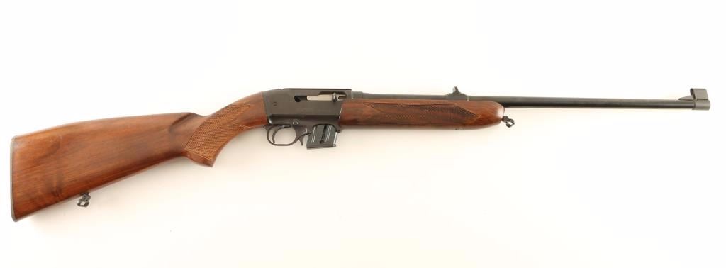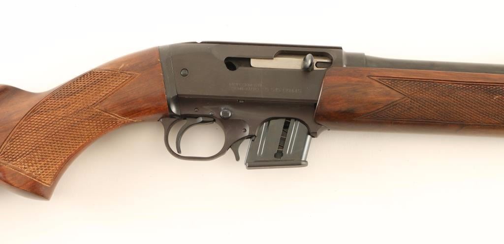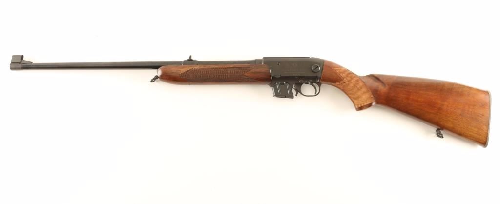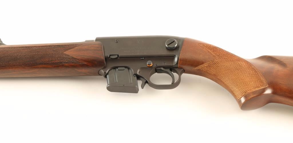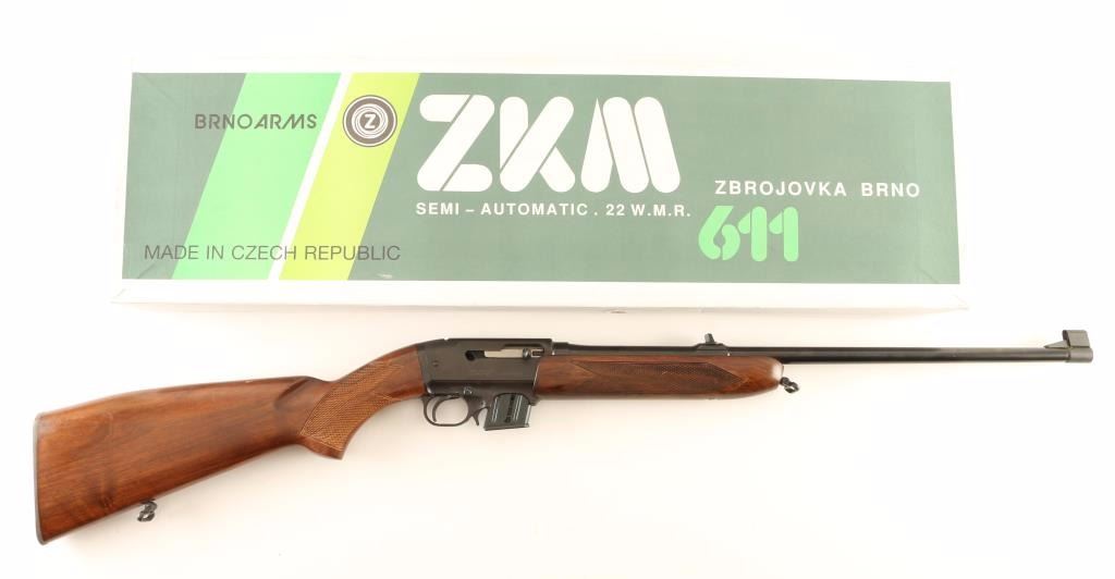 Desirable Czech made semi-automatic sporting rifle chambered in .22 Magnum, circa 1995. Features a blued finish, 20.5" barrel, ramped & hooded patridge front sight, dovetailed rear window sight, take-down receiver with integral scope rail cuts, 6 round detachable magazine, smooth trigger, push button safety, sling swivels, checkered wood forend and pistol grip shoulder stock with factory buttplate. Includes the original factory cardboard box with target and manual. Rifle exhibits approximately 98% of it's original finish showing a few scattered light scratches. Action is smooth, bore is pristine and wood stocks are very good++ with some small blemishes. Condition is near excellent. ***Modern Firearm***