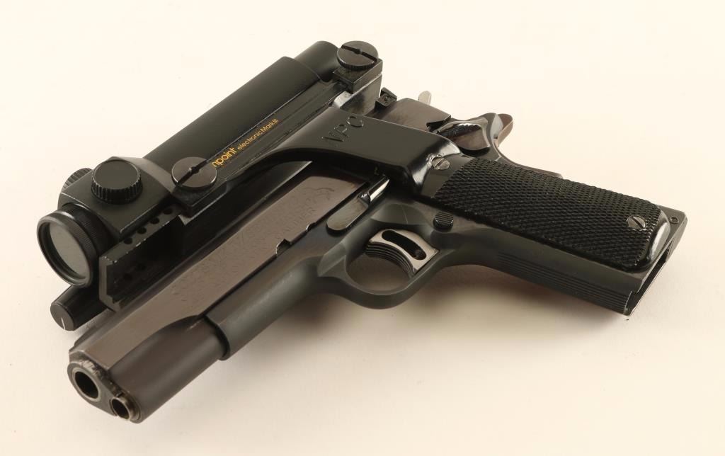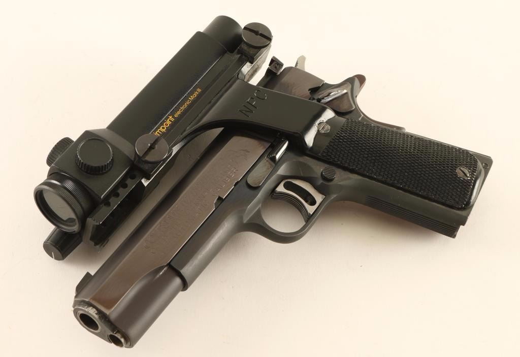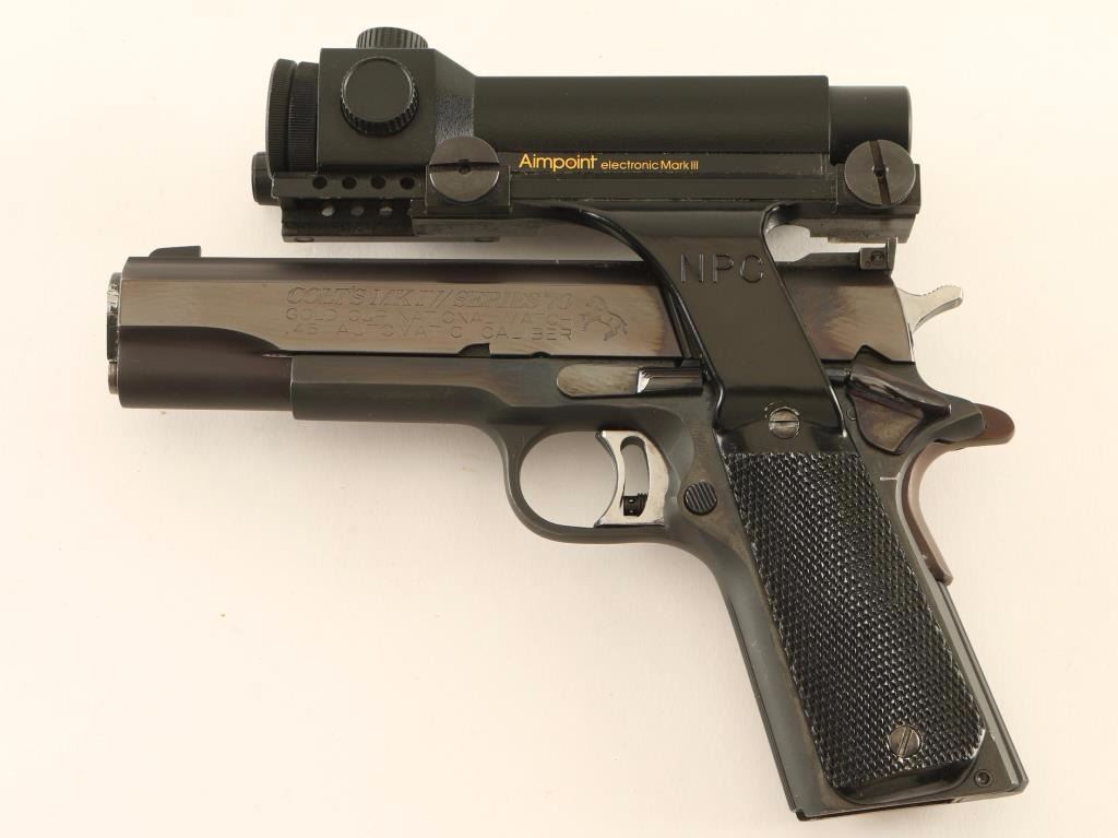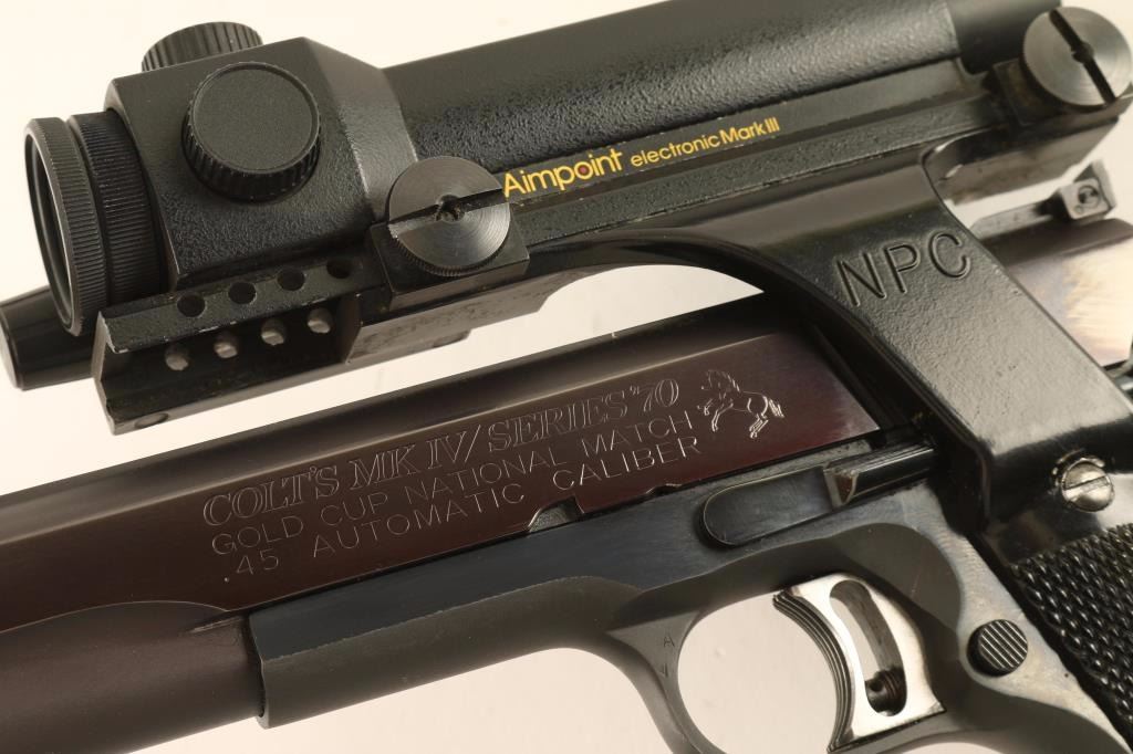 'MK IV Series 70 National Match' Customized single action semi-automatic target pistol chambered in .45 Automatic, circa 1974. Features a blued finish, 5" NM barrel, Micro barrel bushing, patridge front sight, Elliason adjustable rear window sight, Aimpoint electronic Mark III scope, serrated wide adjustable trigger, serrated hammer spur, thumb safety, beavertail grip safety, push button magazine release, no magazine, serrated mainspring housing NPC checkered black plastic scope mount left side grip panel and checkered walnut right side grip panel with gold Colt medallion. The slide, grip safety & thumb safety have turned plum. Pistol exhibits approximately 95% of it's original blued finish showing light edge wear, minimal handling marks and tooling marks on the barrel bushing. Action is smooth, bore is pristine and grips are very good.