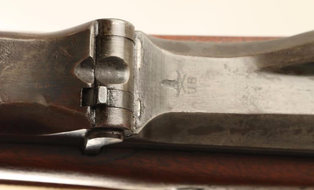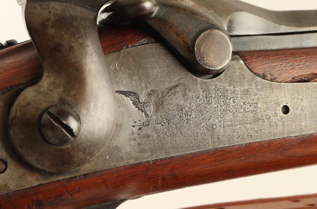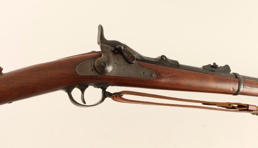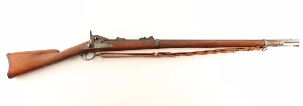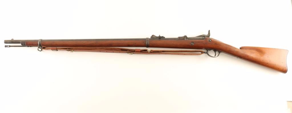 Antique U.S. Military breechloading single-shot rifle chambered in .45-70 Government, circa 1870's-1880's. Features a blued 32.5" tapered barrel with two bands, blade front sight/bayonet lug, flip-up ladder rear sight graduated to 1.200 yards, brown leather sling, cleaning rod, smooth trigger, checkered hammer spur, and full length walnut shoulder stock with "U.S." marked metal buttplate. Markings: Breechblock - "[eagle head]/[crossed arrows]/US" Stock - circled "P" Barrel - V/P/[eagle head] & Lock - "U.S./Springfield/1873" and [eagle]/[arrows]. The barrel exhibits some remaining finish in the protected areas with the balance turned to dark brown patina. The lock is in-the-white with scattered pin-prick pitting and the breechblock shows a light grey patina. Action is strong, bore shows light scattered pin-prick pitting, and wood stock is near fine. Condition is very good ***Antique Firearm***