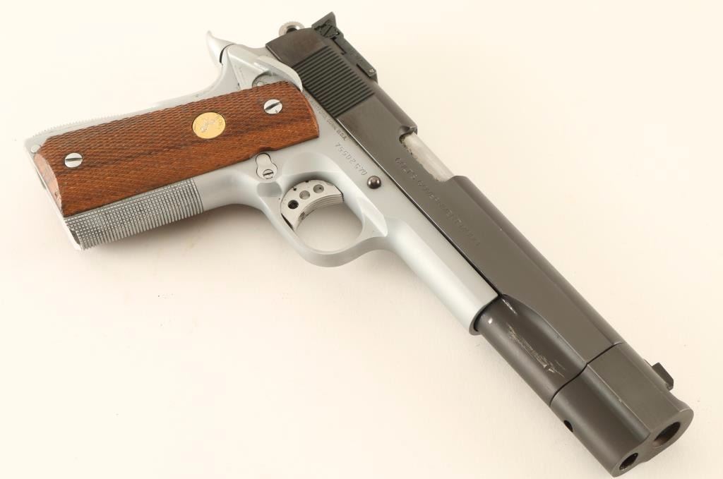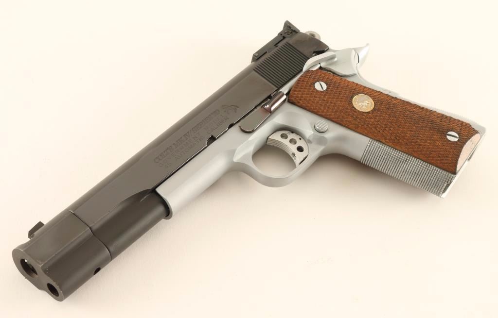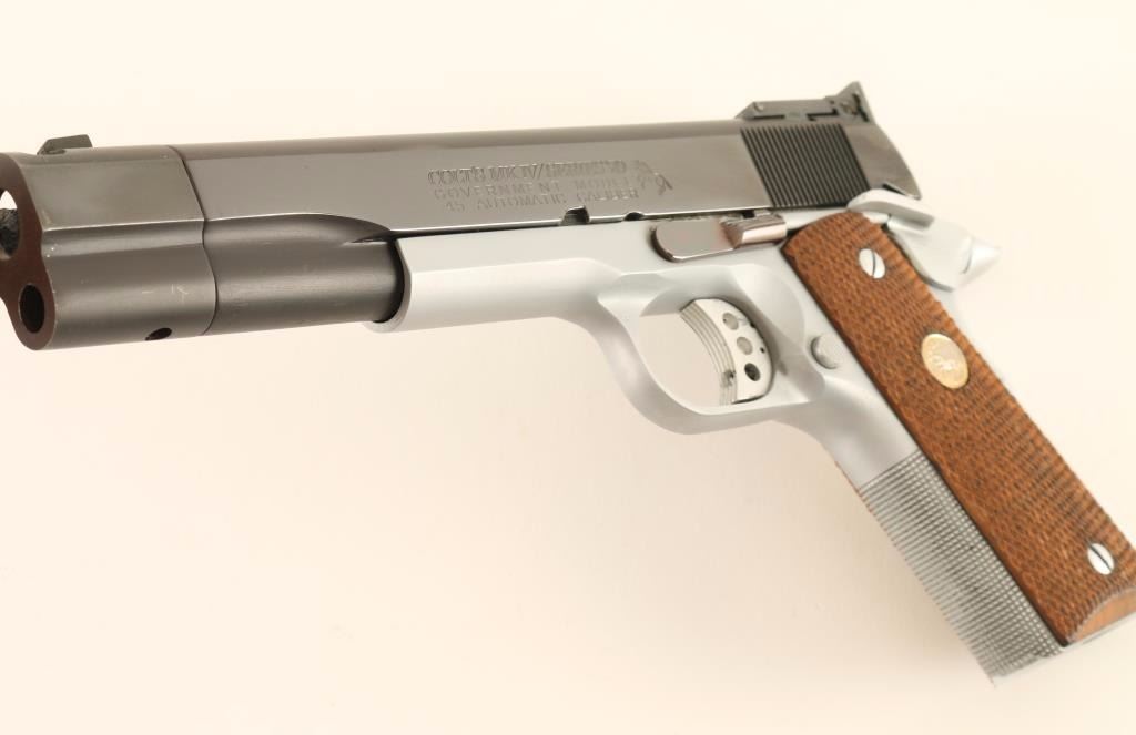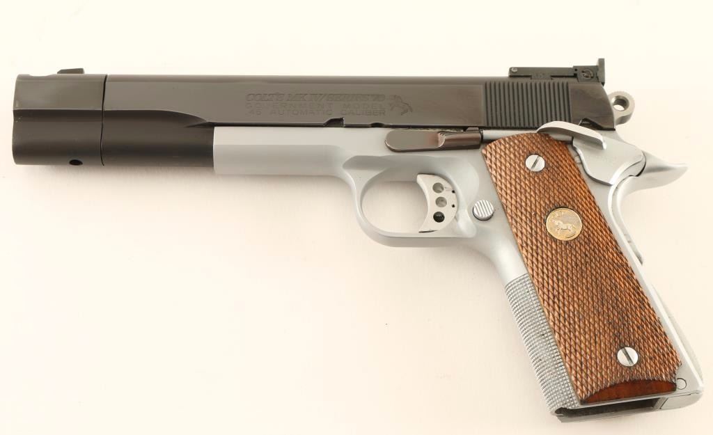 'MK IV Series 70' Customized 1911-A1 style single action semi-automatic pistol chambered in .45 Automatic, circa 1978. Features a blued/satin silver finish, 5.5" barrel, compensator with patridge front sight, Bo-Mar adjustable rear window sight, serrated adjustable trigger, serrated round hammer spur, A.D. Swenson ambidextrous thumb safety, beavertail grip safety, push button magazine release, no magazine, arced mainspring housing with knurling, and two-piece checkered wood grips with gold Colt medallions. The slide has been refinished and the slot for the front sight has been filled. Pistol retains approximately 95% of it's blued finish with the slide turned slightly plum and showing a couple bright wear spots on it's end with a few other minor spots of scattered wear. Action is strong, bore is excellent and grips are very good with semi-worn points. Condition is very good++ as refinished. ***Modern Firearm***