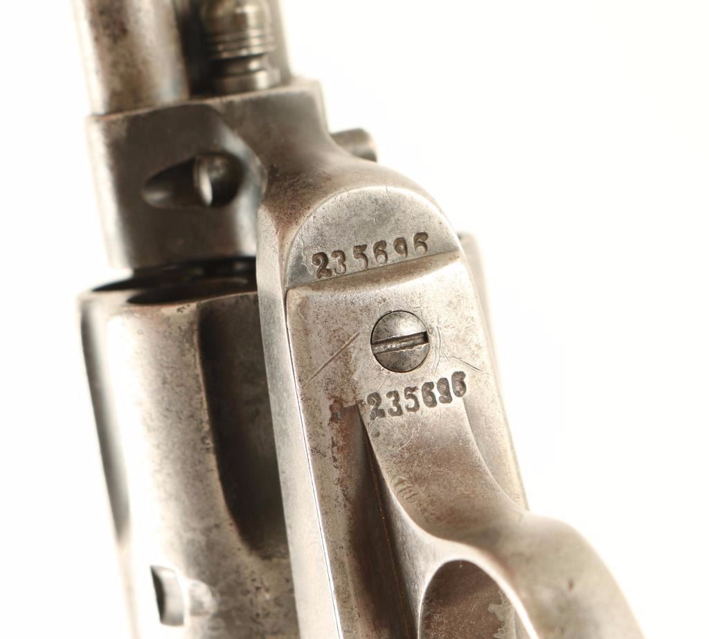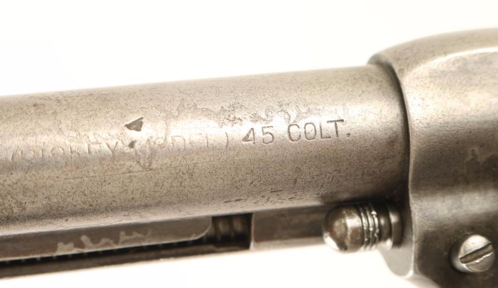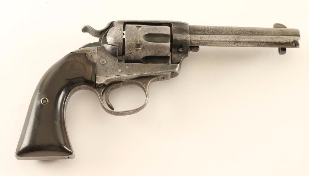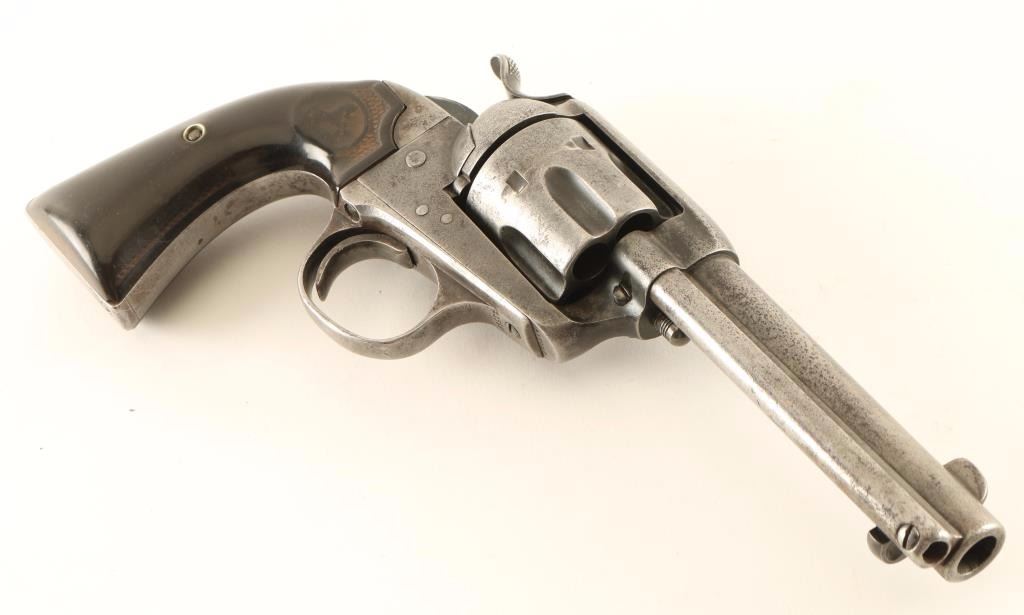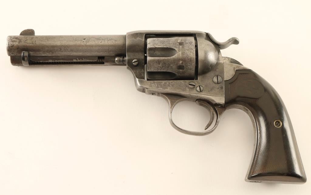'First Generation' Single action six-shot revolver chambered in .45 Colt, circa 1902. Features a blued & case hardened finish, 4 3/4" barrel with two line address, ejector rod, blade front sight, 'v' notched rear sight, wide low-profile hammer spur, smooth trigger, fluted cylinder, and humped-back grip frame with Rampant Colt two-piece checkered black hard rubber grips. Markings are mostly good and all serial numbers are matching. Revolver is primarily in-the-white showing dark scattered pitting on the right side of the barrel, and light scattered erosion/pitting throughout. Action is smooth with four clicks, bore is shiny with scattered pitting & light rifling and hard rubber grips are fair to good as worn smooth. Condition is good. ***C&R Firearm*** ***Modern Firearm***