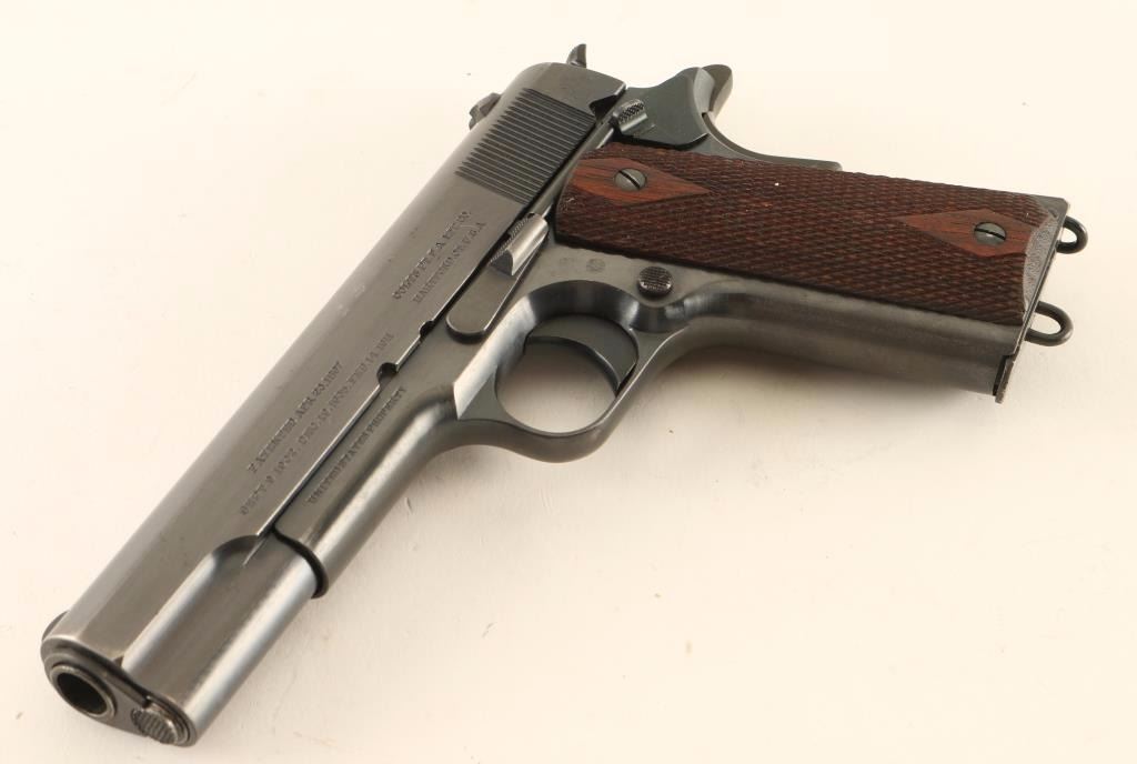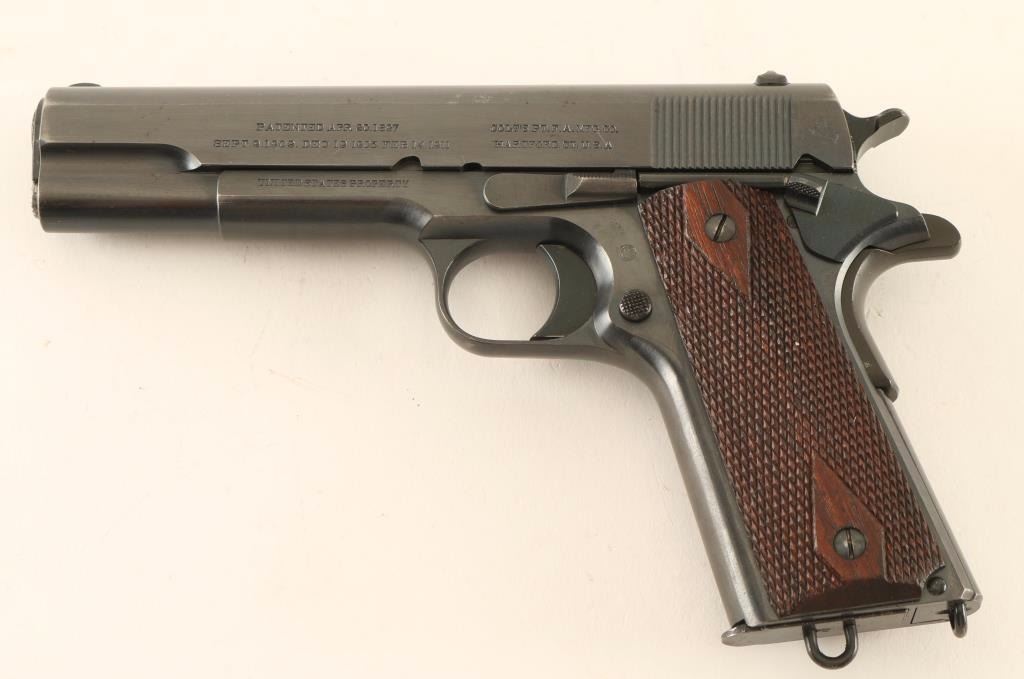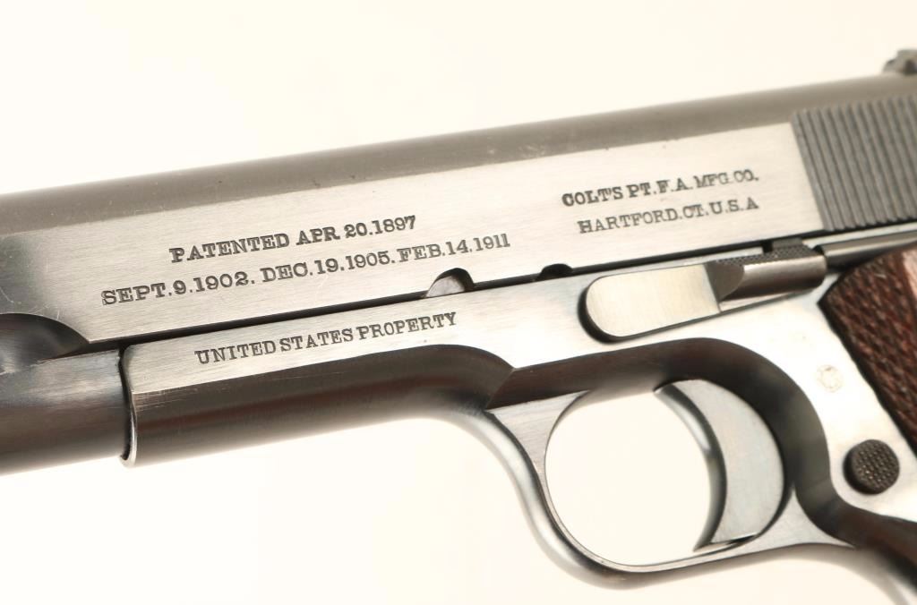 Minty early production U.S. military semi-automatic service pistol chambered in .45 Automatic, circa 1913. Features it's original blued finish, 5" barrel marked "P" & "H", low-profile blade front sight, dovetailed 'u' notched rear window sight, "UNITED STATED PROPERTY" marked frame with "WGP" inspector mark, thumb safety, beavertail grip safety, smooth trigger, checkered wide hammer spur, push button magazine release, 7 round two-tone magazine with lanyard loop, smooth straight mainspring housing with lanyard loop and two piece double diamond checkered walnut grips. Pistol exhibits approximately 94% of it's original blued finish showing light muzzle wear, some scattered scratches, slide wear on the barrel and some light wear on the front strap & back of the mainspring housing/frame. Action is smooth, bore is pristine and wood grips are very good+. Condition is excellent ***C&R Firearm*** ***Modern Firearm***