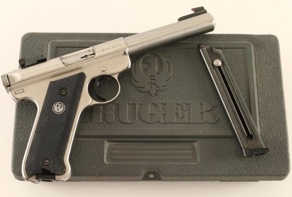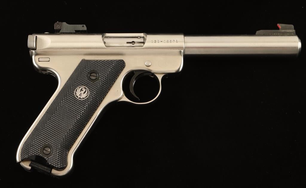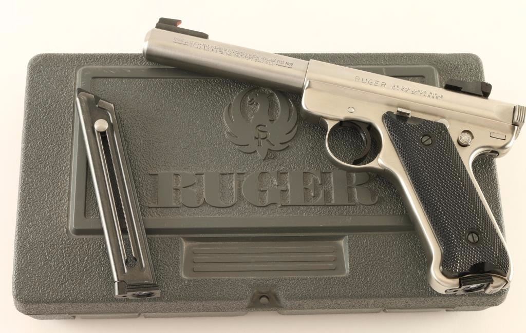 Stainless steel blowback-operated semi-automatic target pistol chambered in .22 Long Rifle. Features a brushed finish, 5.5" heavy barrel, raised patridge front sights, adjustable rear window sight, serrated trigger, hold open lever, thumb safety, factory 10 round magazine and two-piece checkered black plastic grips with a Ruger medallion on the right panel. Includes a factory hard case with spare magazine, documents and lock. Pistol exhibits only light muzzle wear, few handling marks and some slide wear on the bolt. Action is smooth, bore is pristine and plastic grips are fine. Condition is near excellent in box. ***Modern Firearm***