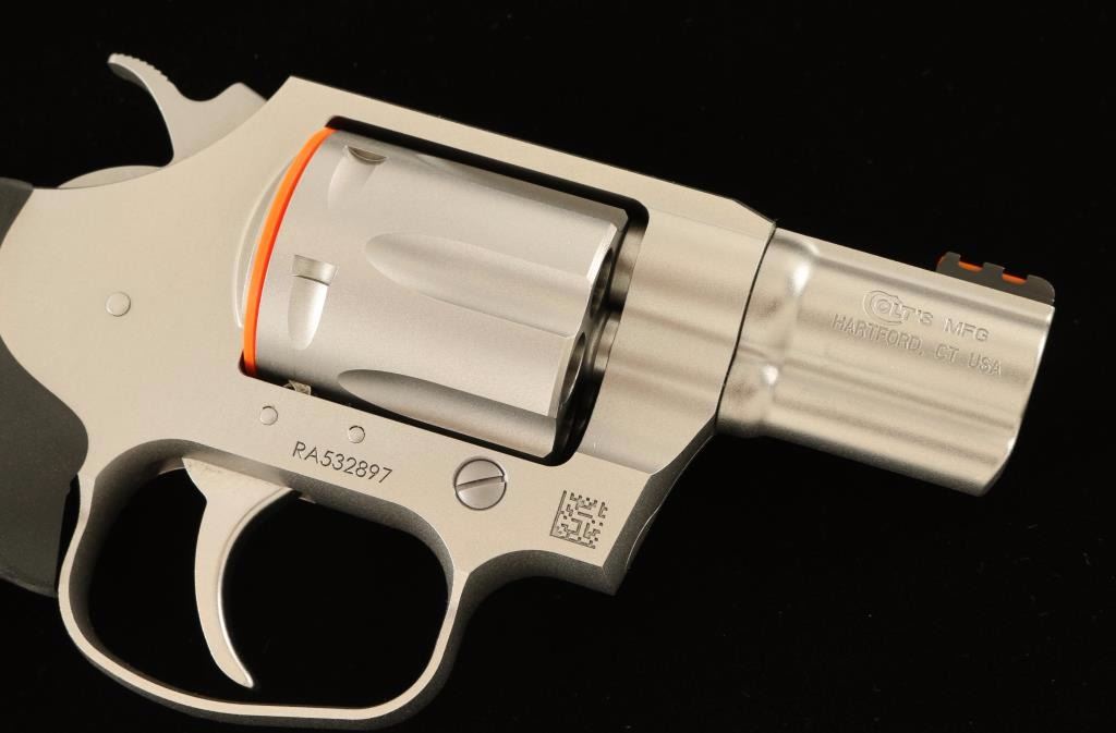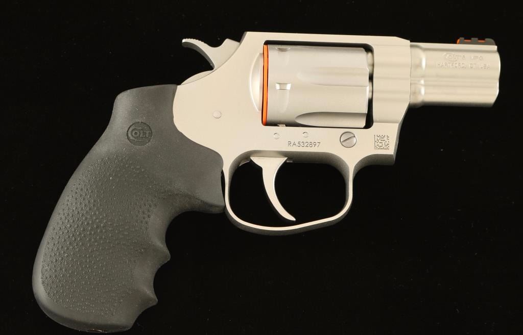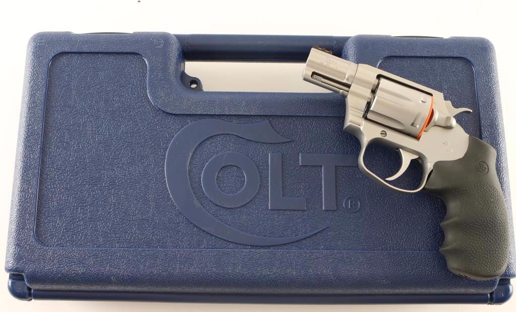 Modern production stainless steel double action snub-nosed revolver chambered in .38 Special and rated for +P ammunition. Features a matte finish, 2" ribbed barrel with full underlug, orange fiber optic front sight, square notched rear sight, fluted six-shot cylinder, smooth trigger, serrated hammer spur, and one-piece Hogue pebbled black rubber overmolded finger groove grip with Colt insignias. Includes the factory hard case with documents, hang tag and lock. Revolver exhibits little to no visible wear. Action is smooth with solid lock-up, bore is good and rubber grips are fine. Condition is like new in box. ***Modern Firearm***