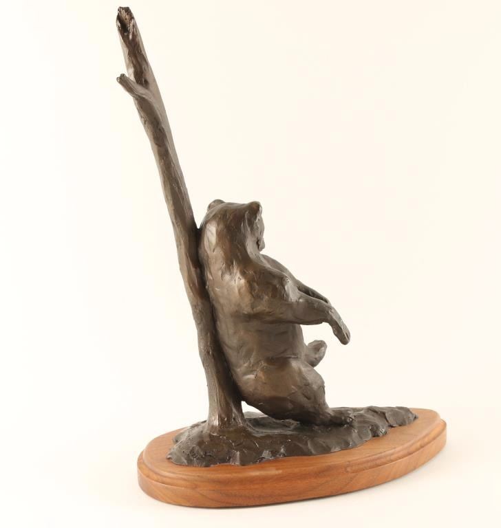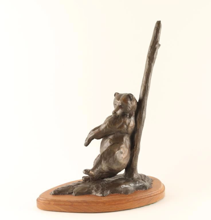 Artist Chris Navarro depicts a bear scratching his back on a tree, on oak base. Measures 14"x 10". A "Buffalo Bill Quick Draw" Sculpture that took 3-5 hours. A sculptor of cowboy rodeo figures, plains Indians, and wildlife as well as other images of the West, Chris Navarro had first-hand experience with his subject matter when he was a rodeo competitor at Casper College in Wyoming. He has remained a resident of Casper but in 1999, opened a gallery in Taos, New Mexico. Of his work, he writes in his book, Chasing the Wind, 'The greatest gift a person has to offer the world is the work he creates and the effort he puts into it'. One of his best known works is the Lane Frost Memorial, a fifteen-foot sculpture of a bull rider in Frontier Park in Cheyenne, Wyoming. Many of his works are large scale including Spirit of the Thunderbird, a 15-foot high sculpture at Casper College and Twenty Chance of Flurries, also 15 feet in height, at Colorado State University in Fort Collins.