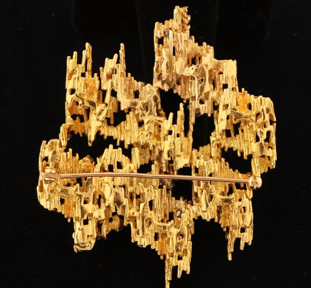contains 52 diamonds approx 3.75cts tw set in 18KT yellow gold setting. Can be worn as a pin or as pendant as it has a loop for a chain. Includes an appraisal from Victors Palm Beach, Florida 1987 which they paid $3400.00