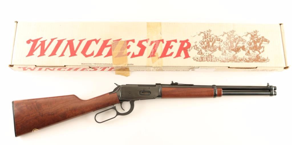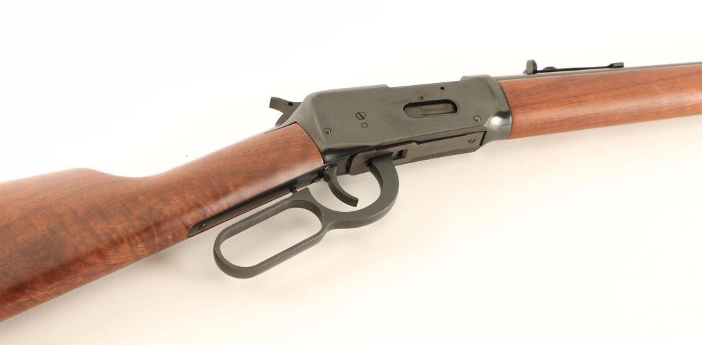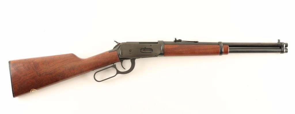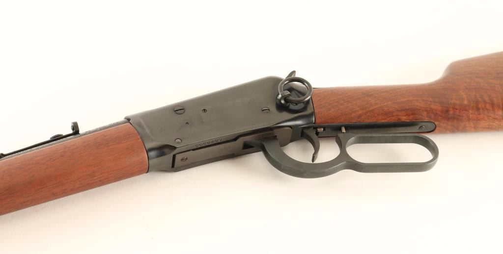 'Angle Eject - Trapper' Lever-action repeating rifle chambered in .44 Magnum. Features a blued finish, 16" tapered barrel, dovetailed blade front sight, semi-buckhorn adjustable rear sight, drilled & tapped receiver, full-length magazine tube, saddle ring, serrated hammer spur, smooth trigger with beveled edges, grip safety, two barrel bands, smooth satin finished American walnut forend and straight grip shoulder stock with factory checkered black synthetic buttplate. Includes the original factory cardboard box with documents, hang tag & hammer extension. Rifle exhibits approximately 99% of it's original blued finish showing only a few small scattered scratches. Action is smooth, bore is pristine and wood stocks are fine with a single 1" long shallow scrape on the buttstock. Condition is near new in box. ***Modern Firearm***