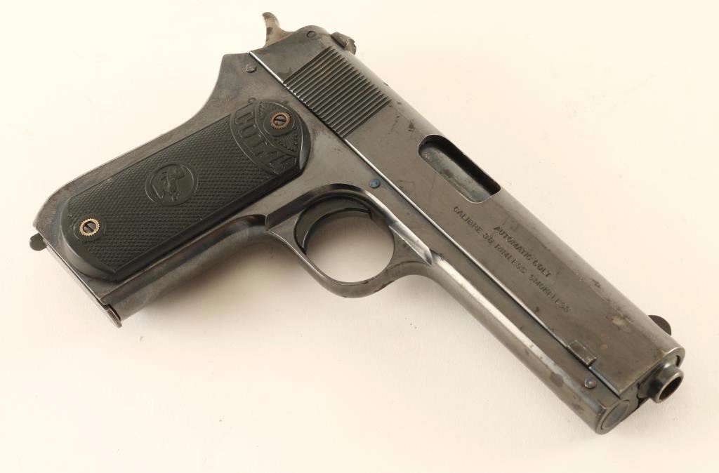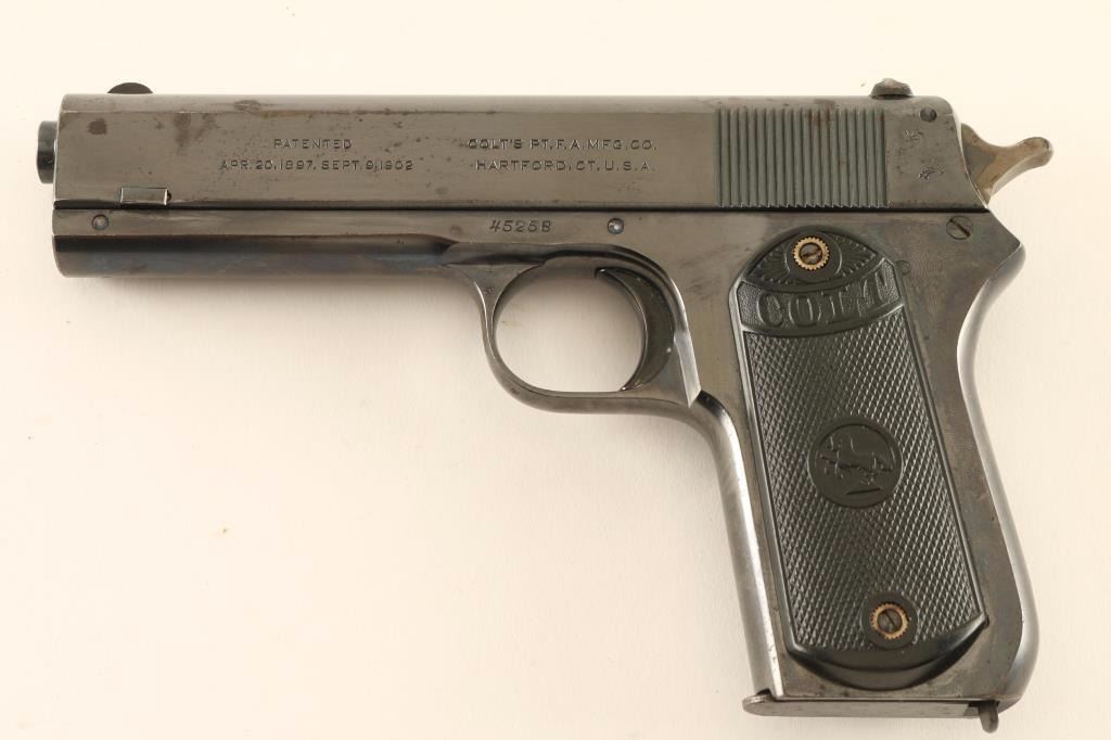 Early single action semi-automatic pistol chambered in .38 Rimless Smokeless, circa 1922. Features a blued finish, 4.5" barrel, round blade front sight, dovetailed rear window sight, rear cocking serrations on the slide, cash hardened hammer with checkered spur, smooth trigger, unmarked 7 round magazine, steel frame and two-piece checkered black hard rubber grips with "COLT" & Rampant Colt motifs. Pistol exhibits approximately 85% of it's original finish showing small scattered areas of pin prick pitting, some general wear and a cleaned area on the backstrap around some dark rust. Action is sound, bore is good with scattered pin prick pitting and hard rubber grips are very good+. Condition is fine. ***C&R Firearm*** ***Modern Firearm***