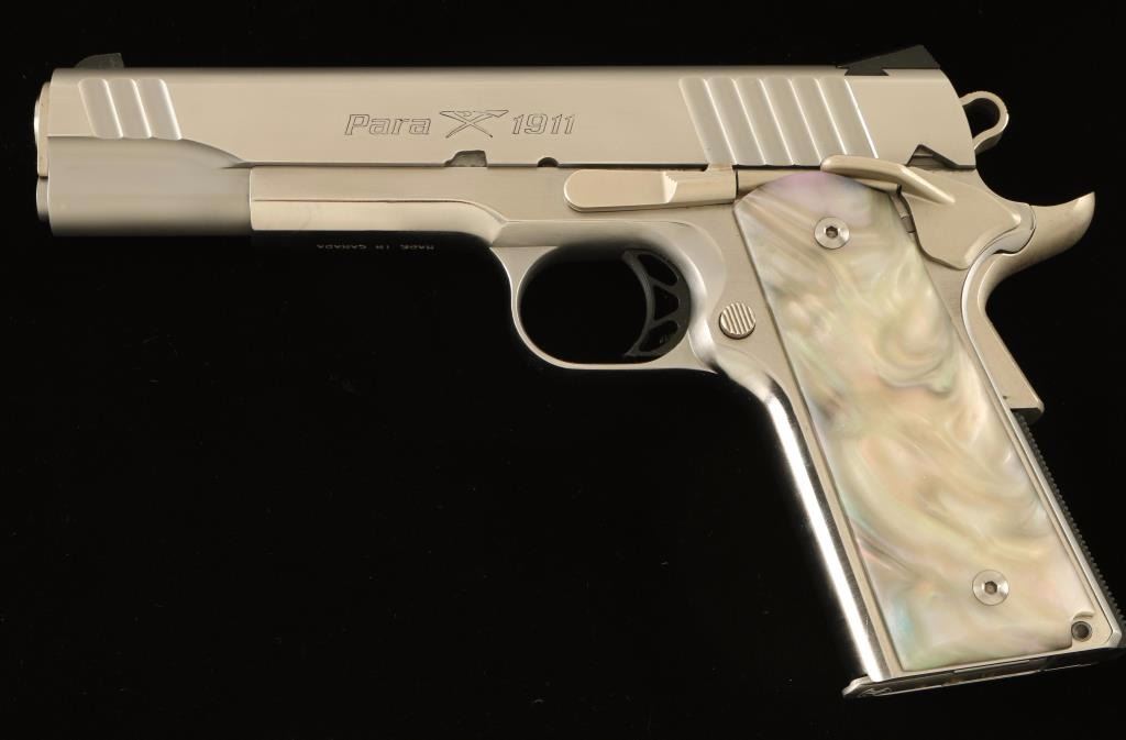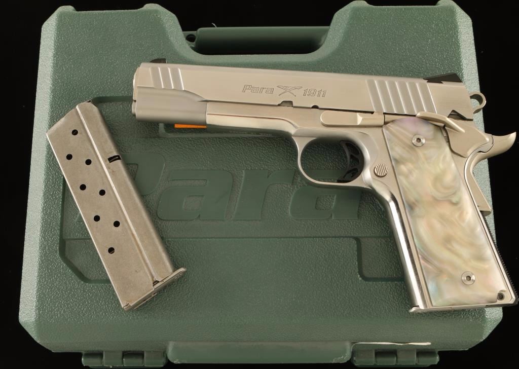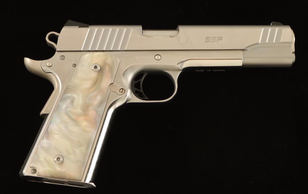 American made stainless steel 1911-A1 style single action semi-automatic pistol chambered in .38 Super. Features a bright polished/matte finish, 5" barrel, dovetailed low profile three-dot sights, dual cocking serrations on the slide, thumb safety, beavertail grip safety, serrated adjustable 'k' trigger, skeletonized hammer, push button magazine release, 9 round magazine, and two-piece tough synthetic mother-of-pearl grips. Includes the original factory hard case with documents, lock, tools, and spare magazine. Pistol exhibits only few minor handling marks with no major wear observed. Action is strong, bore is pristine and faux pearl grips are fine. Condition is near new in box. ***Modern Firearm***