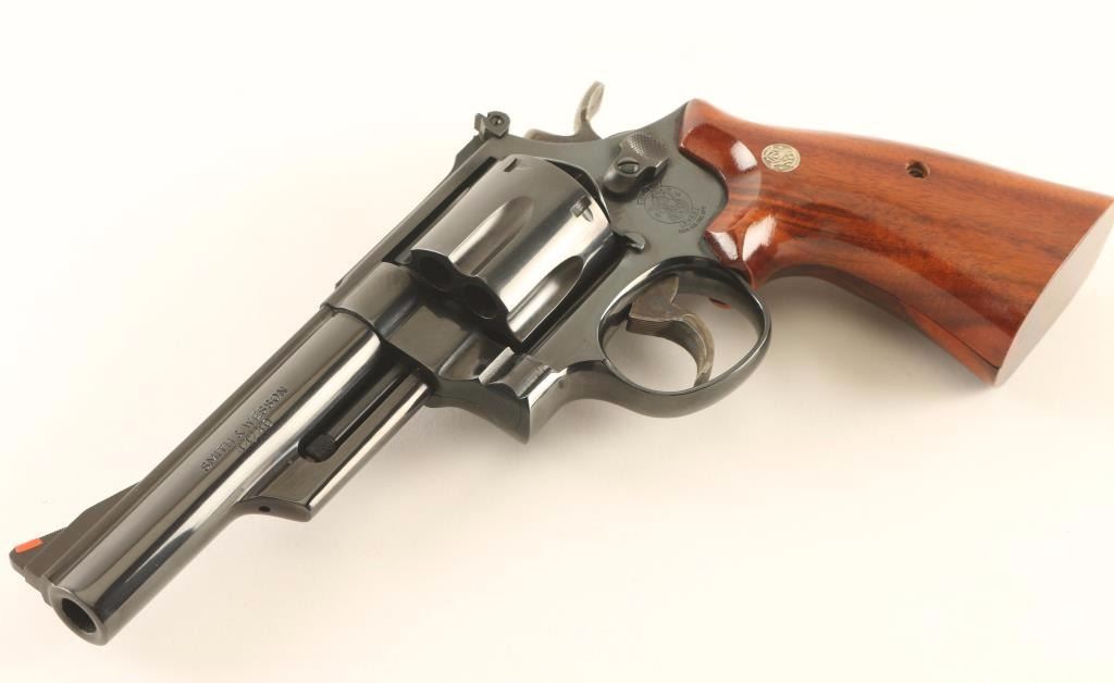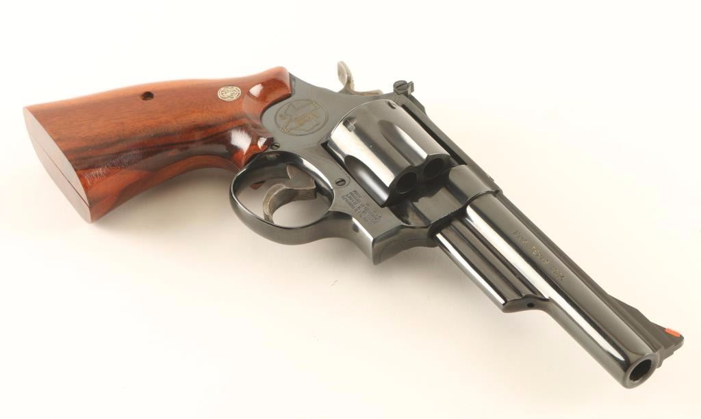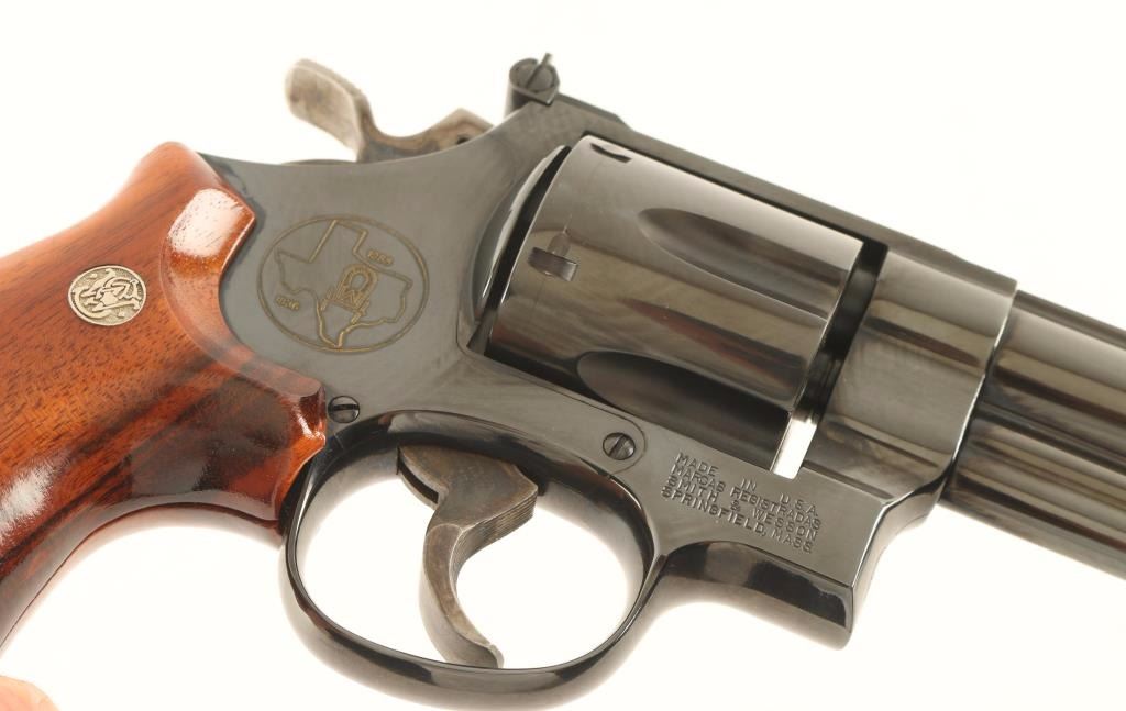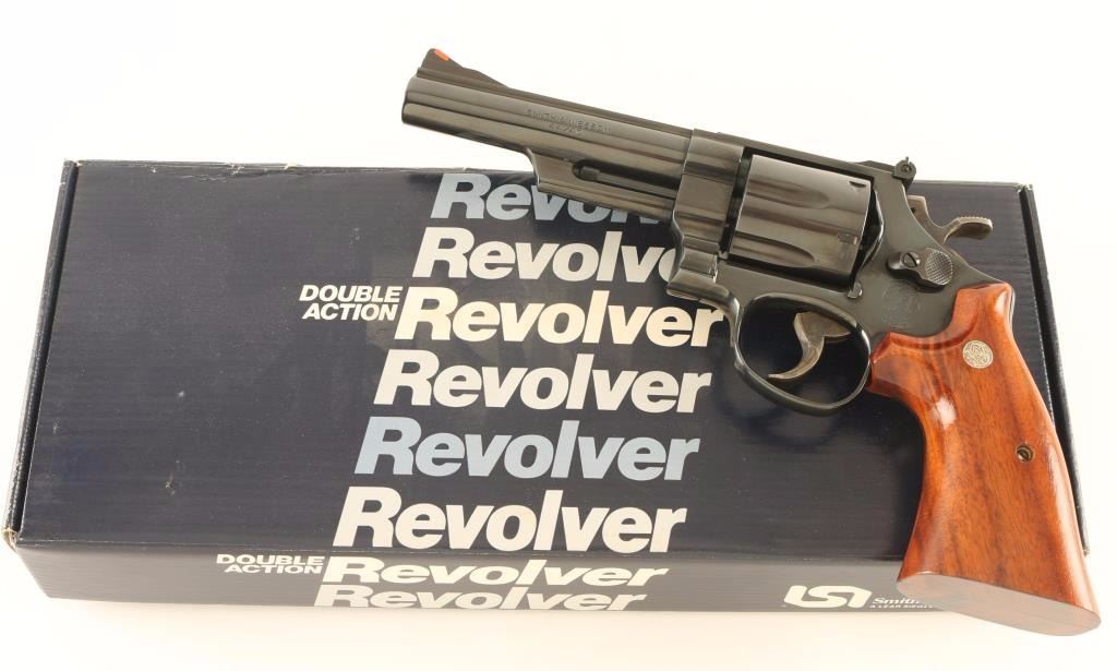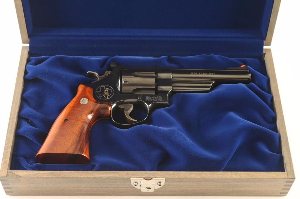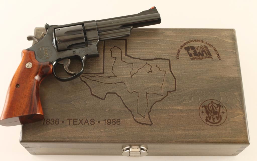 'Texas Wagon Train Sesquicentennial' Commemorative large frame double-action revolver chambered in .44-40 Winchester, circa 1986. 1 of only 4,782 produced. Features a blued finish, ribbed 5" barrel marked "1836 TEXAS 1986", raised ramp front sight with orange insert, micrometer click adjustable rear sight with white outline, shrouded ejector rod, fluted six-shot cylinder, .400" target trigger, .500" target hammer, square butt N target frame with Texas Wagon Train decor on the sideplate and two-piece smooth goncalo alves target grips with silver S&W medallions. Includes the original factory shipping box, basswood locking presentation case with blue velvet interior, and cardboard box with documents & cleaning tools. Revolver exhibits approximately 98%+ of it's original blued finish showing a small blemish on the left side of the frame below the cylinder which may be dark rust and a single small loss & faint drag line on the cylinder. Action is smooth with very good lock-up, bore is pristine and wood grips are fine. Condition is excellent in box. ***C&R Firearm*** ***Modern Firearm***