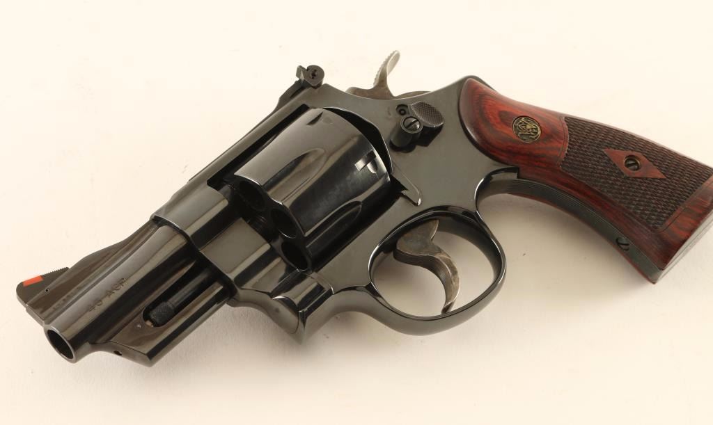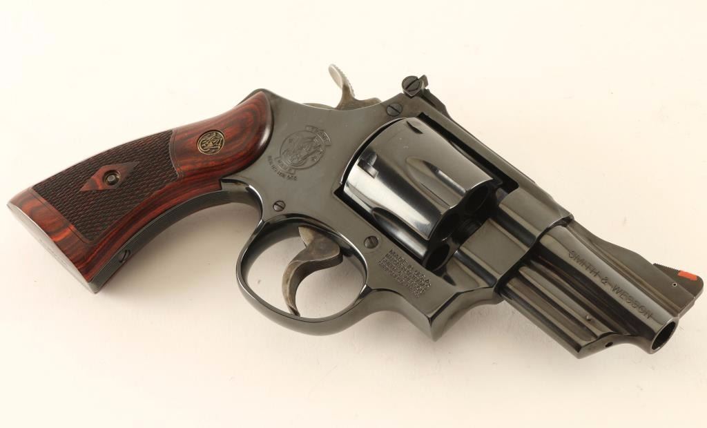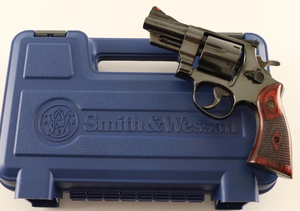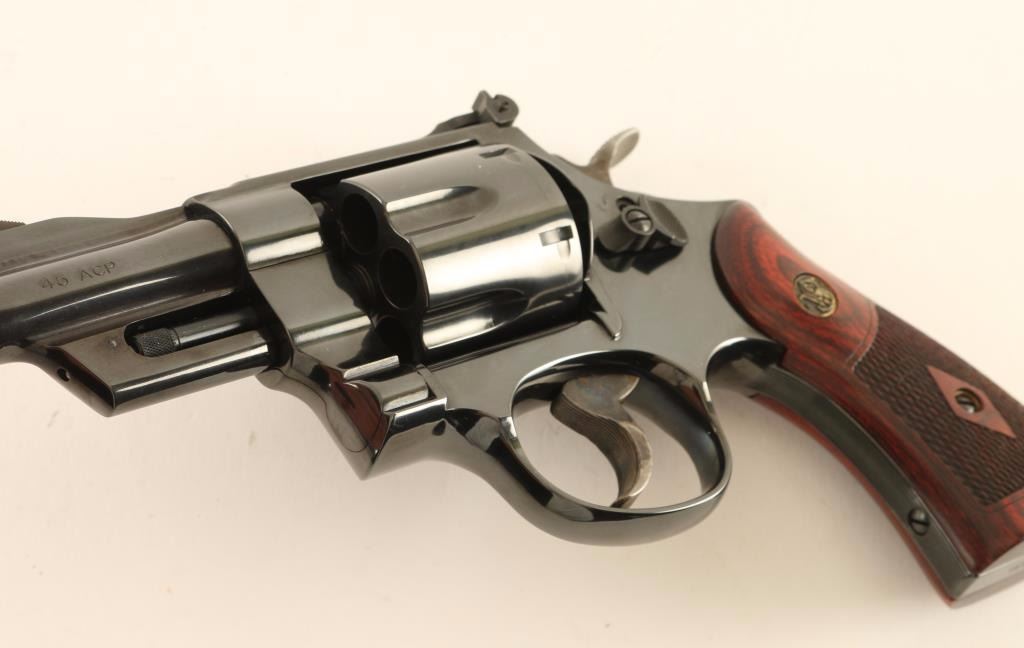 '150124' Limited edition #231 of 250 large frame double action revolver chambered in .45 Automatic. Features a polish blued finish, 3" barrel, raised ramp front sight with orange insert, adjustable micrometer click rear sight with white outline, .400" serrated target trigger, .500" target hammer, fluted six-shot cylinder, square butt N target frame with serrated grip straps & internal locking safety, and two-piece diamond checkered rosewood grips with brass S&W medallions. Includes the original factory hard case with documents, moon clips and keys. Revolver exhibits approximately 99% of it's original blued finish showing a faint drag line on the cylinder and minimal handling wear. Action is smooth with solid lock-up, bore is excellent and wood grips are fine. Condition is near new in case. ***Modern Firearm***