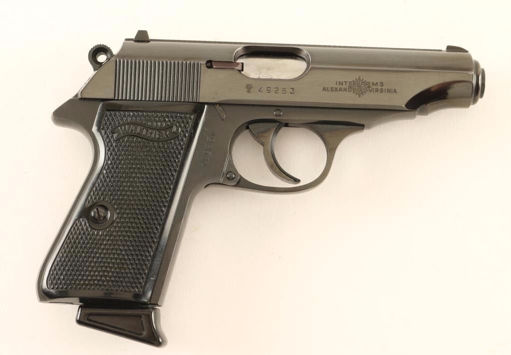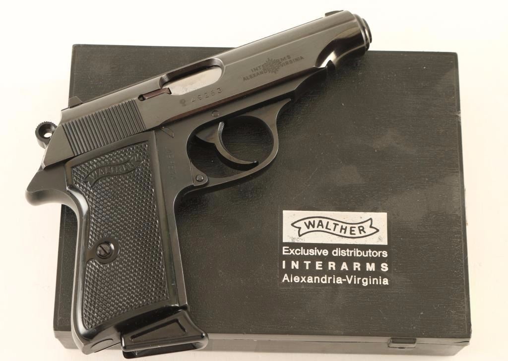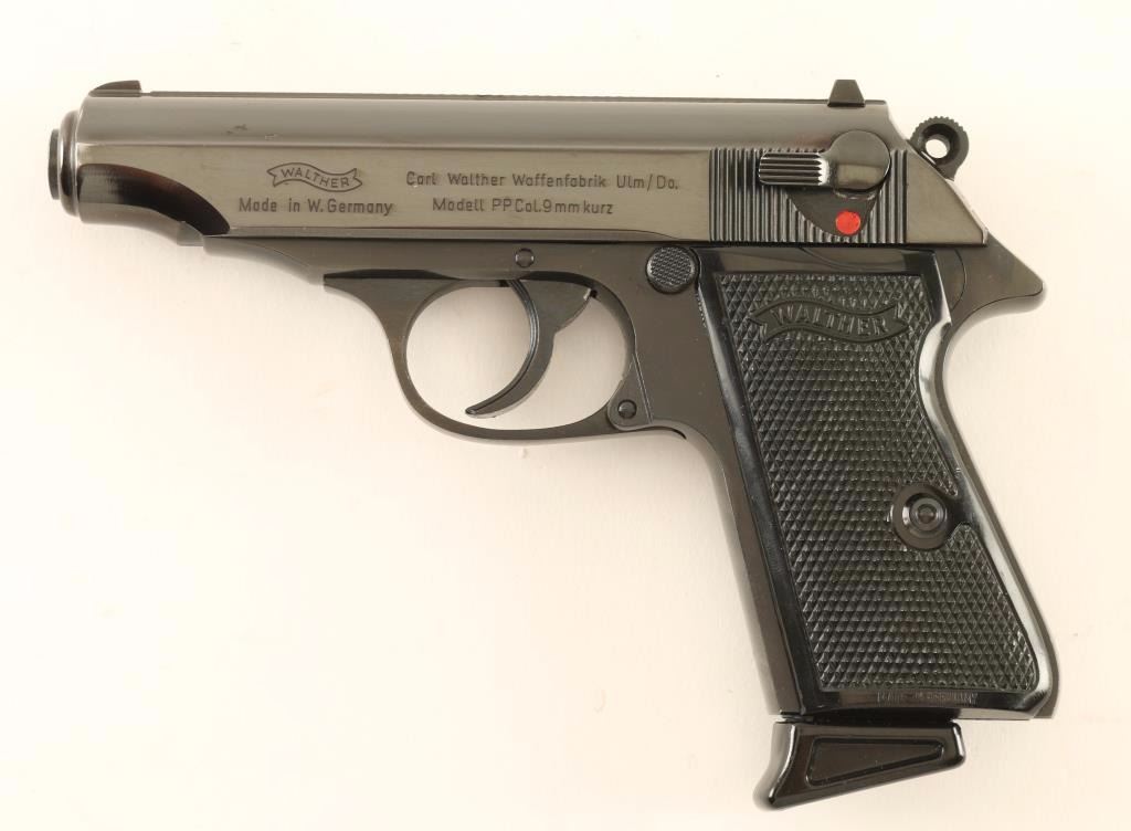 German made double action semi-automatic pistol chambered in 9mm Kurtz. Features a blued finish, 3.9" barrel, fixed white-dot patridge front sight, dovetailed rear window sight with white bar, serrated trigger, serrated round hammer spur, thumb safety/decocker, push button magazine release, 7 round factory magazine with finger rest floorplate, steel beavertail frame and two-piece checkered black plastic grips with Walther banners. Includes the original factory hard case with tool and cleaning rod. Pistol retains approximately 94% of it's original finish showing light muzzle wear and a small amount of scattered light surface rust. Action is strong, bore is pristine and plastic grips are very good. Condition is very good in box. ***Modern Firearm***