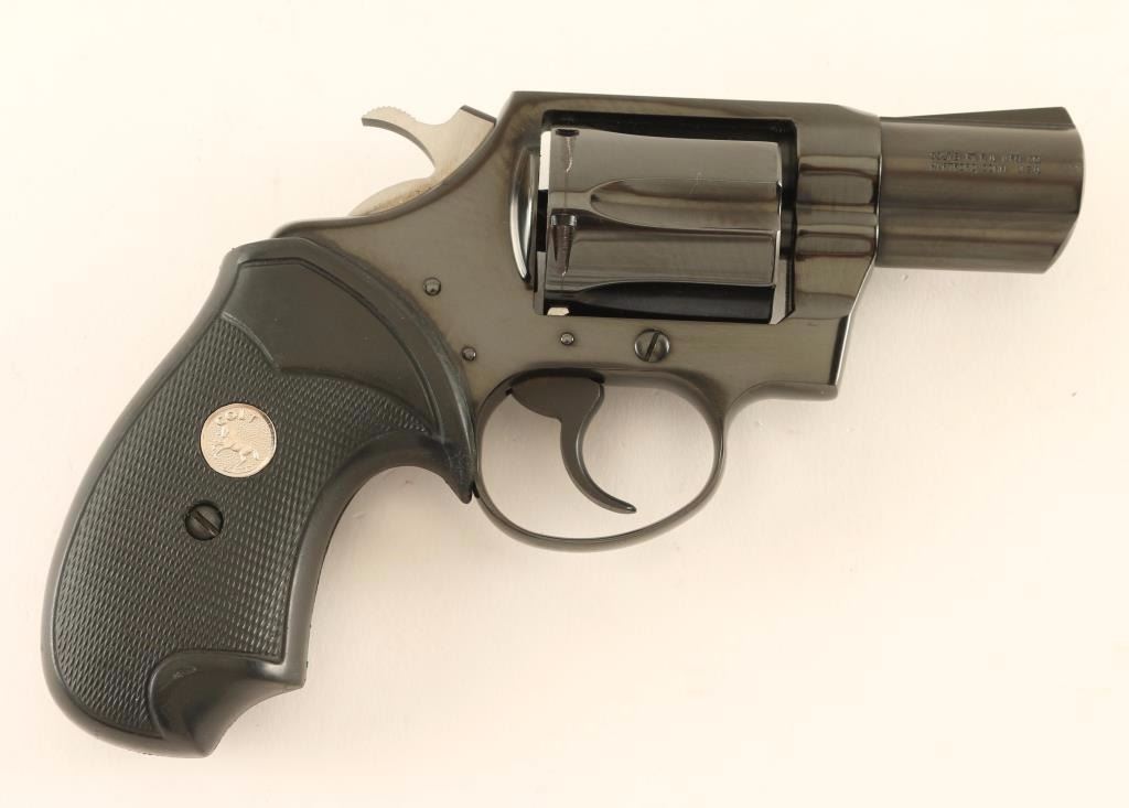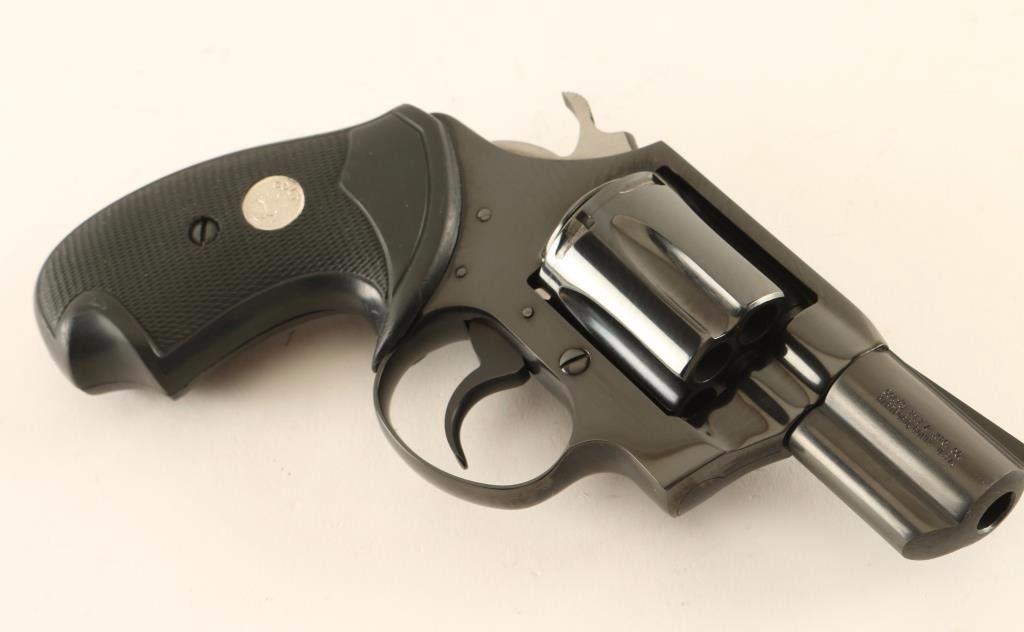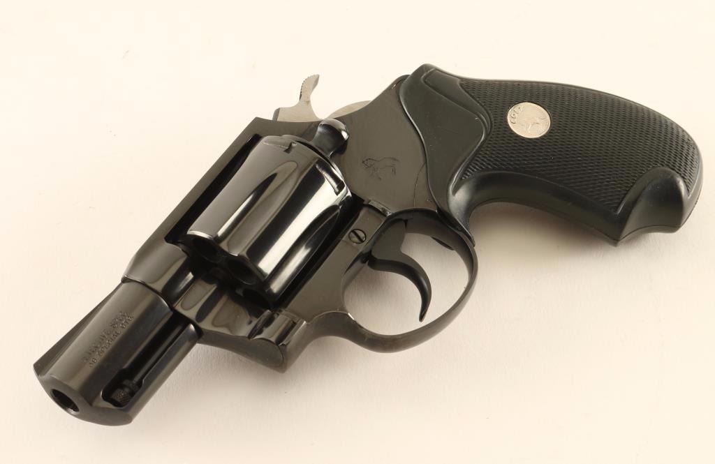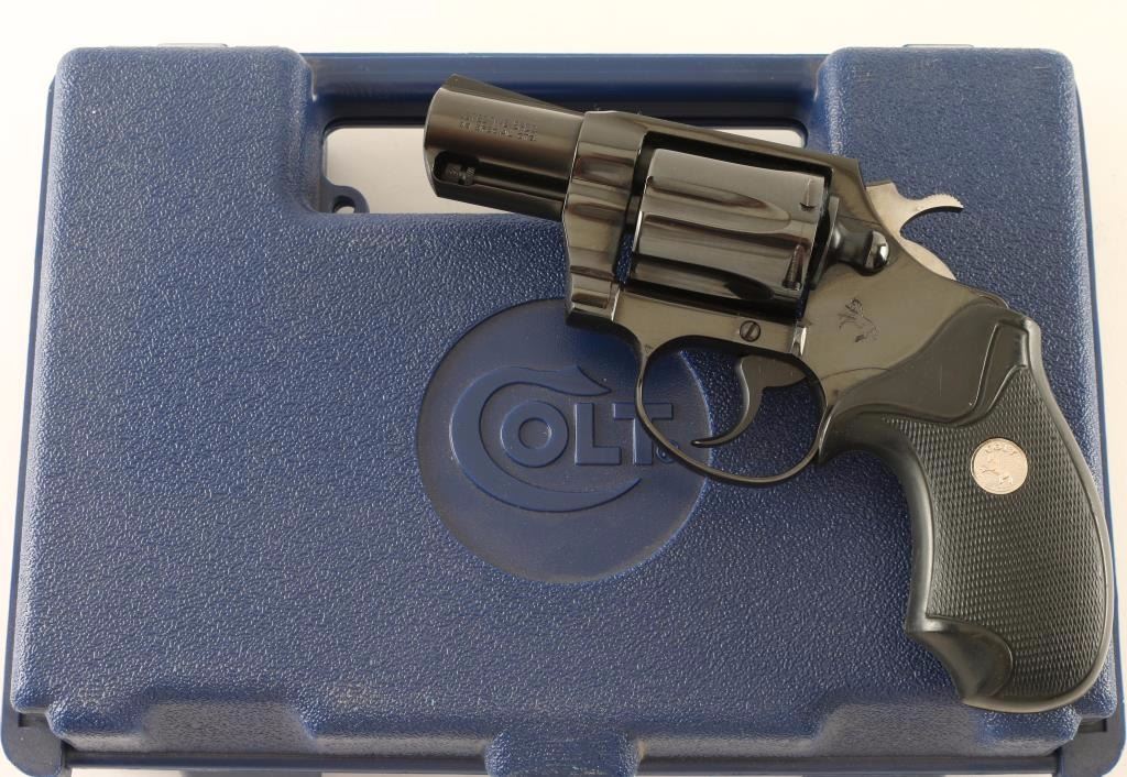 '4th Issue' Snub nosed double-action revolver chambered in .38 Special, circa 1993-1995. Features a blued finish, 2" barrel with full underlug, ramped front sight, square notched rear sight, long fluted six-shot cylinder, smooth trigger, serrated hammer spur and two-piece checkered black rubber wrap-around grips with silver Colt medallions. Includes a factory hard case with manual. Revolver exhibits approximately 99% of it's original blued finish a small loss and fine drag line on the cylinder. Action is crisp with solid lock-up, bore is pristine, and grips are very good. Condition is near new in box. ***Modern Firearm***