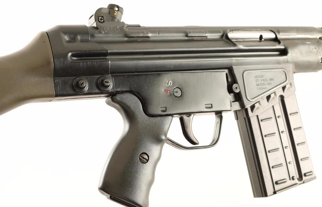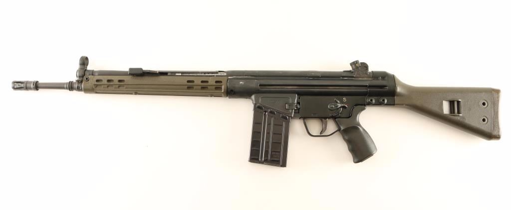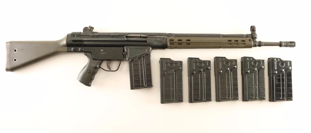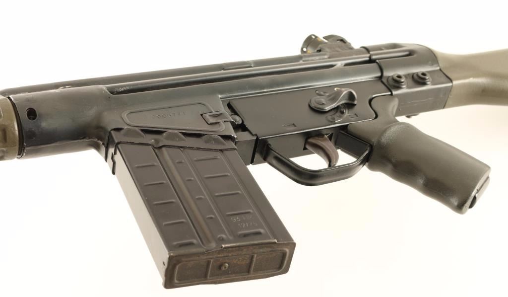 American made clone of the HK 91 semi-automatic battle rifle chambered in 7.62x51mm. Features a matte black finish, 17.7" barrel, flash hider, folding charging handle, hooded front sight, rotating rear cylindrical sight with various apertures, stamped receiver, manual safety, push button magazine release, 20 round HK G3 magazine, OD green synthetic forearm, black synthetic pistol grip and OD green buttstock. Includes five additional G3 magazines. Rifle retains approximately 90% of it's matte black finish showing scattered wear and pitting under the finish on the receiver. Action is smooth, bore is bright scattered shallow pitting, and synthetic stocks very good Condition is good to very good. ***Modern Firearm***