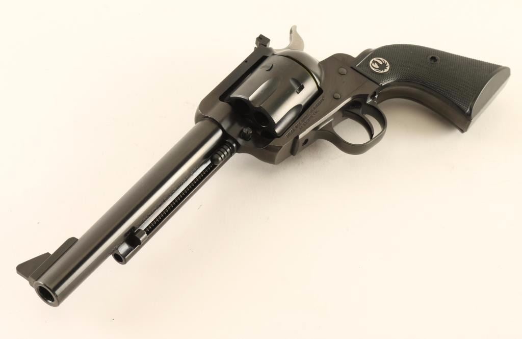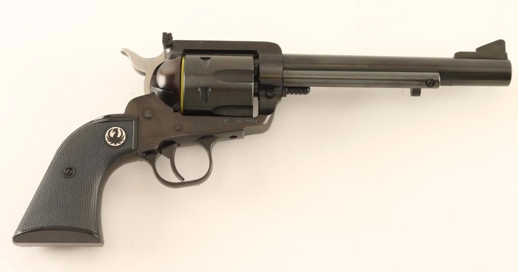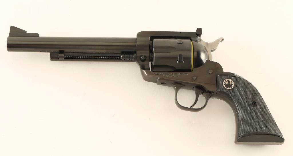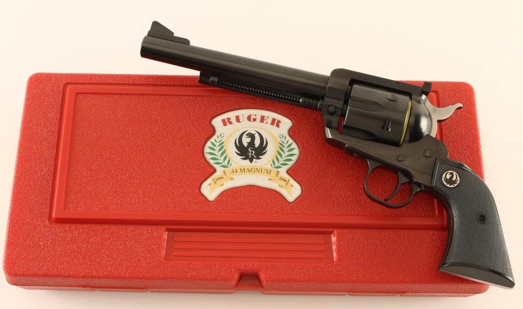 SN: 870-02007 '50th Anniversary Model' American made six-shot single action revolver chambered in .44 Magnum, circa 2006. Features a blued finish, 6 1/2" barrel with gold roll marked "50 YEARS OF .44 MAGNUM/1956 TO 2006", raised ramp front sight, Micro adjustable rear window sight, flat-top frame, ejector rod, fluted cylinder, transfer bar safety, serrated hammer spur, smooth trigger, and two-piece checkered black plastic grips with Ruger medallions. Includes the original factory hard case with documents. Revolver exhibits approximately 99% of it's original blued finish showing only minimal handling marks and a faint drag line on the cylinder. Action is smooth with tight lock-up, bore is excellent and plastic grips are fine. Condition is near new in case. ***Modern Firearm***