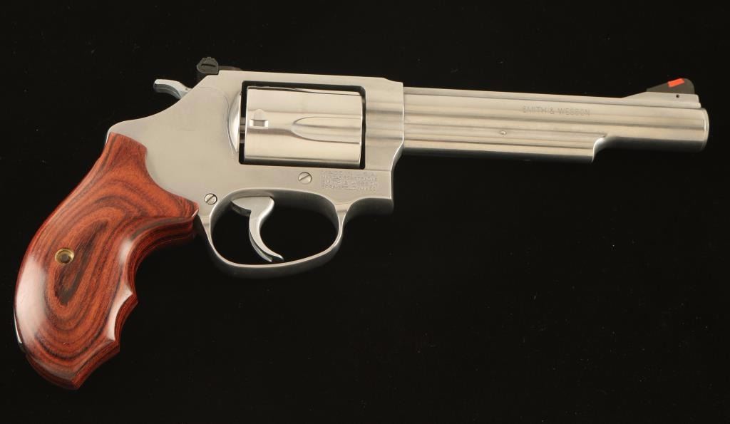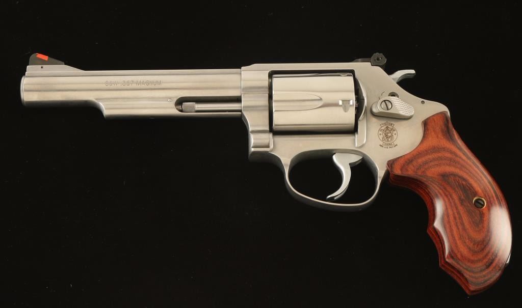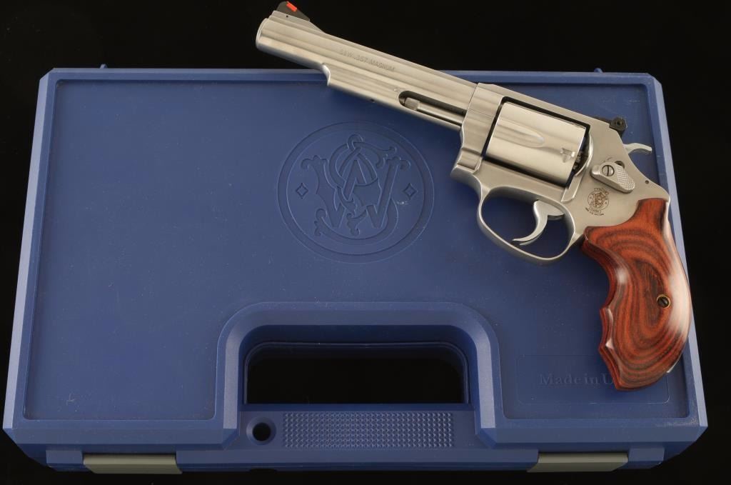 'Chiefs Special Stainless' Small frame stainless steel double-action revolver chambered in .357 Magnum, circa 2006. Features a brushed finish, 5" two-piece barrel with serrated top rib, raised ramp front sight with red insert, micrometer click adjustable rear window sight, shrouded ejector rod, fluted five-shot cylinder, internal key lock, .312" smooth combat trigger, .240" service trigger, round butt J Magnum frame, and two-piece smooth brown laminated wood finger groove grips. Includes the original factory hard case with documents, lock, spent case and keys. Revolver exhibits light handling marks and a fine drag line on the cylinder with no major wear observed. Action is is smooth with tight lock up, bore is very good and wood grips are fine. Condition is excellent in case. ***Modern Firearm***