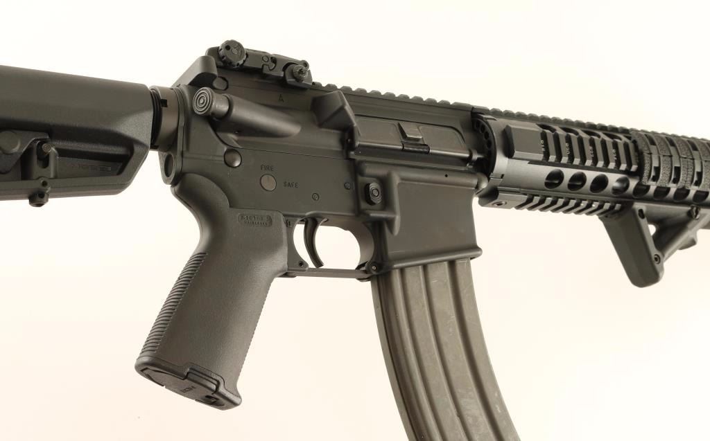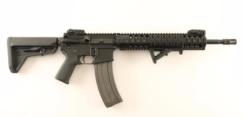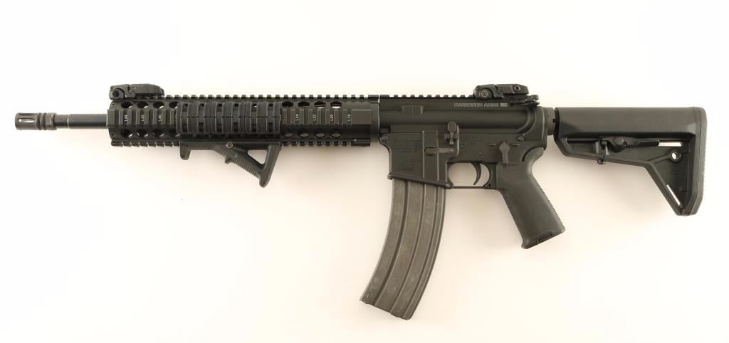 Customized semi-automatic AR platform rifle chambered in .300 Blackout. Features a matte black/blued finish, 16.25" barrel with 1/8 twist, birdcage style flash hider, Magpul MBUS flip-up sights, rifle length quad-rail handguard with Magpul angled foregrip & covers, Hardened Arms marked flat-top upper receiver, M-16 profile BCG, standard charging handle, shell deflector, dust cover, forward assist, push button magazine release, 40 round steel magazine, thumb safety, Magpul black rubber overmolded pistol grip and Magpul MOE SL six-position collapsible shoulder stock. Rifle exhibits approximately 97% of it's finish overall showing edge wear on the handguard and minor scuffs on the upper & lower receiver. Action is smooth, bore is excellent and stocks are fine. Condition is excellent. ***Modern Firearm***