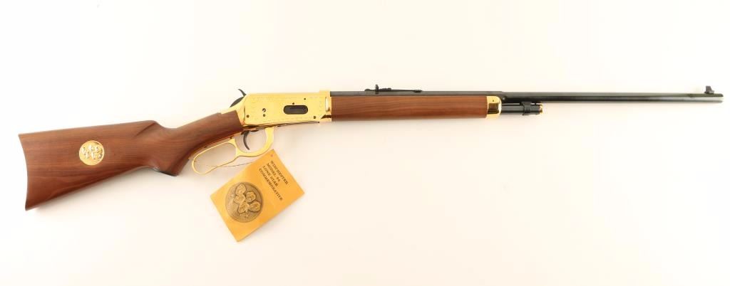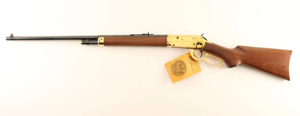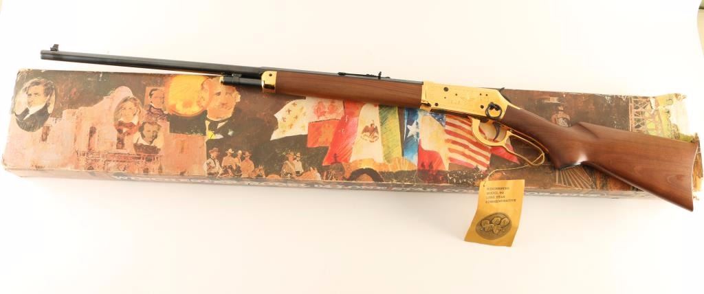 Commemorative lever-action repeating rifle chambered in .30-30 Winchester, circa 1970. Features a blued 26" half octagonal barrel, dovetailed blade front sight, adjustable rear sporting sight, half length tube magazine, brass colored receiver with engraved stars & 1845/1970 dates, saddle ring, beveled trigger, serrated hammer spur, brass colored magazine cap, lever & forend cap, smooth wood forend and pistol grip shoulder stock with inlayed commemorative medallion, brass colored metal buttplate & 13 1/4" LOP. The tang is inscribed "Under Six Flags" and the pistol grip cap has a embossed brass plaque that reads "Texas". Includes the original factory box with documents and hang tag. Rifle exhibits no signs of use with minimal handling marks/wear. Action performs well, bore is pristine and wood stocks are fine with only a single small blemish observed behind the pistol grip cap. Condition is like new in box. ***Modern Firearm***