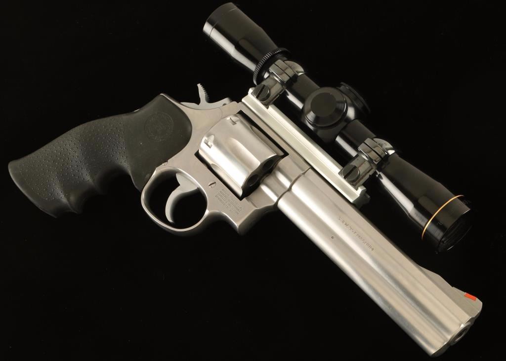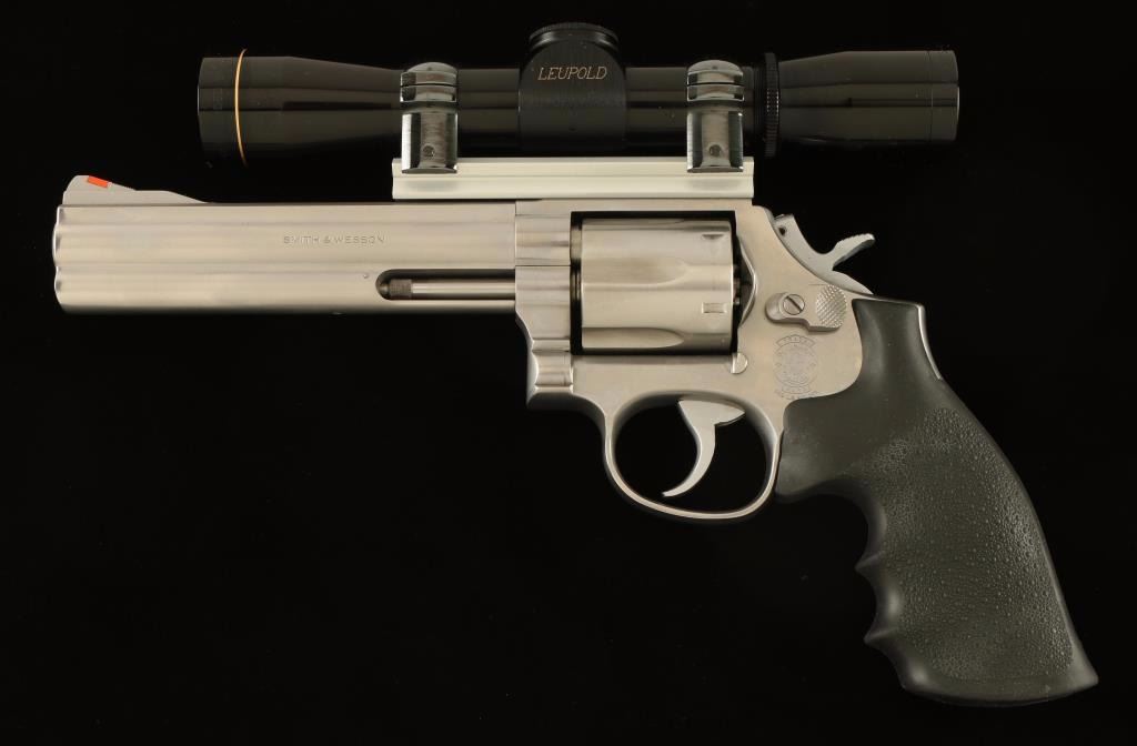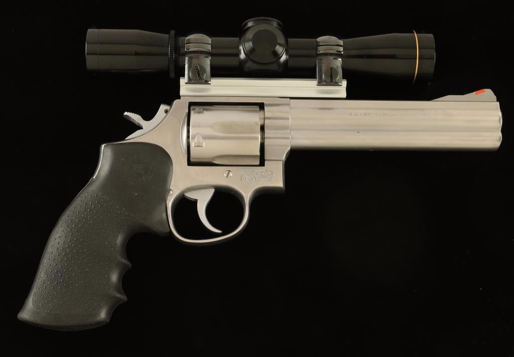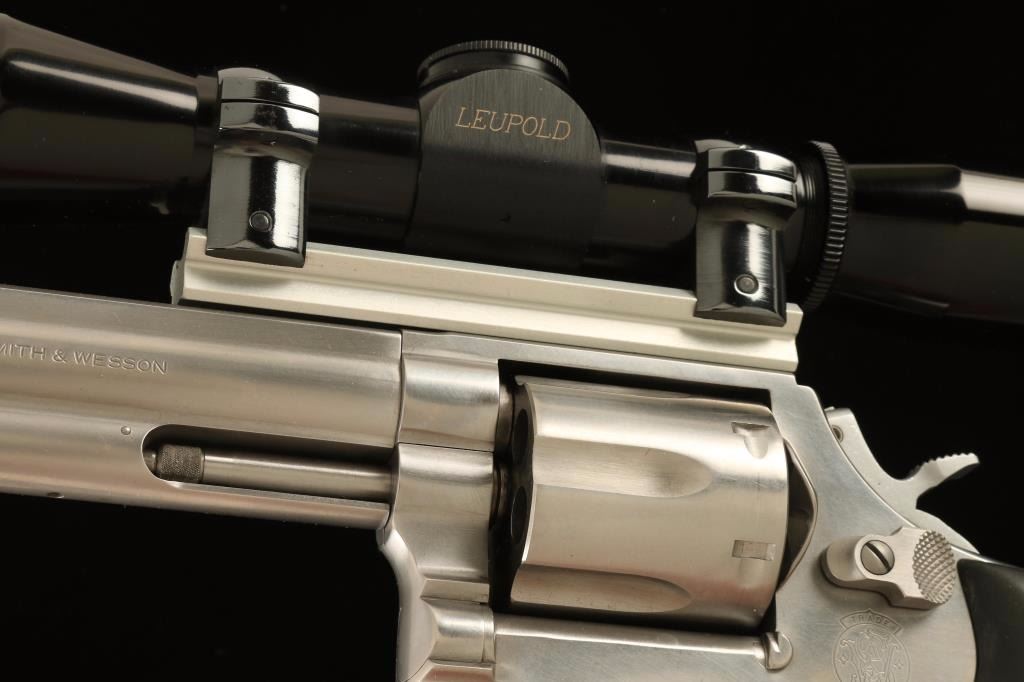 'Distinguished Combat Magnum' Medium frame stainless steel double-action revolver chambered in .357 Magnum, circa 1988-1993. Features a brushed finish, 6" full-lug barrel with serrated top rib, raised ramp front sight with orange insert, removed rear sight, Leupold M8 4x E.E.R. scope, .312" smooth combat trigger, .375" semi-target hammer, fluted six-shot cylinder, square butt L target frame, and one-piece pebbled black rubbed Hogue Monogrip. Revolver exhibits few light handling marks and a faint drag line on the cylinder with no major wear observed. Action is smooth with solid lock-up, bore is pristine, optics are sharp and grip is fine. Condition is excellent. ***Modern Firearm***