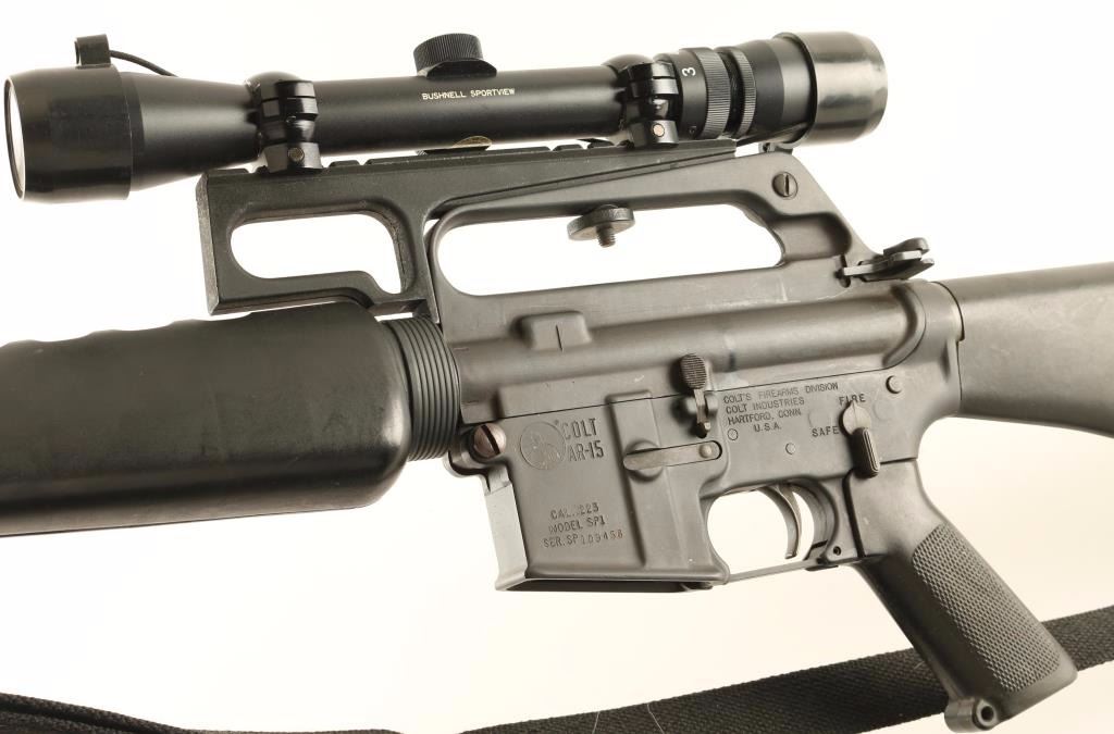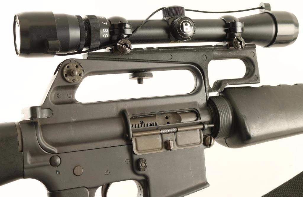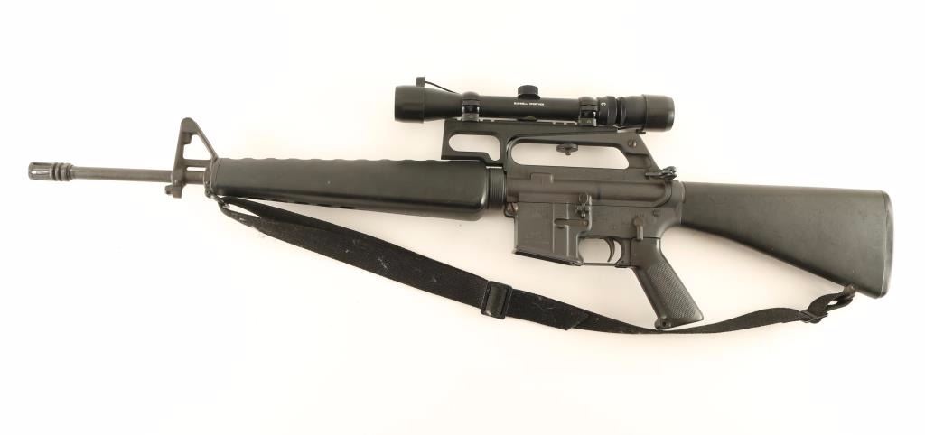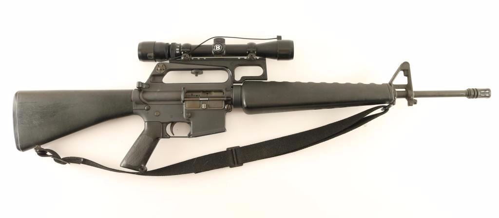 'Pre-ban' Gas operated semi-automatic sporting rifle chambered in .223 Remington, circa 1980. Features a matte grey finish, 20" chrome-bore barrel with bird cage style flash hider, adjustable A2 winged post front sight with bayonet lug, dual aperture rear sight in carrying handle, Bushnell Sportview 3-9x scope on unmarked rail, triangular black synthetic hand guard, correct BCG, checkered black plastic pistol grip, no magazine, black nylon sling, thumb safety, dust cover and black synthetic shoulder stock with trapdoor buttplate. Rifle exhibits approximately 94% of it's original matte finish showing a couple scratches on the barrel near the muzzle, handling marks on the receivers and what appears to be rust forming in the last couple digits of the serial number stamp on the lower receiver. Action is sound, bore is excellent, marking are very good and synthetic stocks are near fine. Condition is very good+++. ***Modern Firearm***