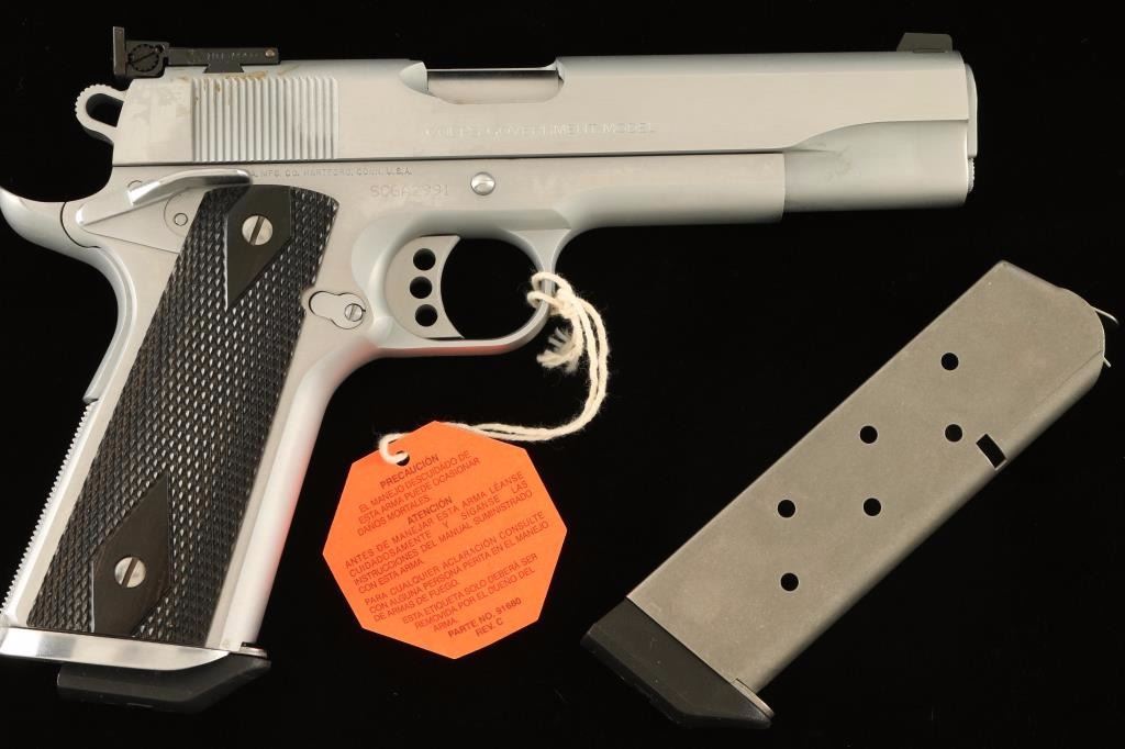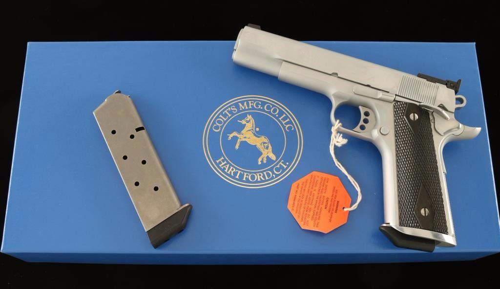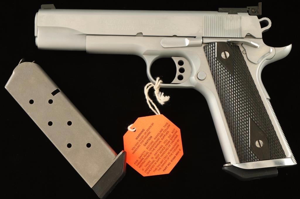 SN: SCGA2991 High quality 1911-A1 style semi-automatic pistol chambered in .45 Automatic and set up for competition. Features a brushed hard chrome finish, 5" N.M. barrel, patridge front sight, Bo-Mar adjustable rear sight, serrated adjustable trigger, skeletonized hammer, ambidextrous thumb safety, beavertail grip safety, push button magazine release, 8 round Chip McCormick magazine, checkered mainspring housing with beveled magazine well and two-piece double diamond checkered dark wood grips. Includes the original cardboard box, shipping sleeve, documents, lock, target and spare magazine. Pistol exhibits little to no visible wear. Action is smooth, bore is pristine and wood grips are fine. Condition is like new in box. ***Modern Firearm***