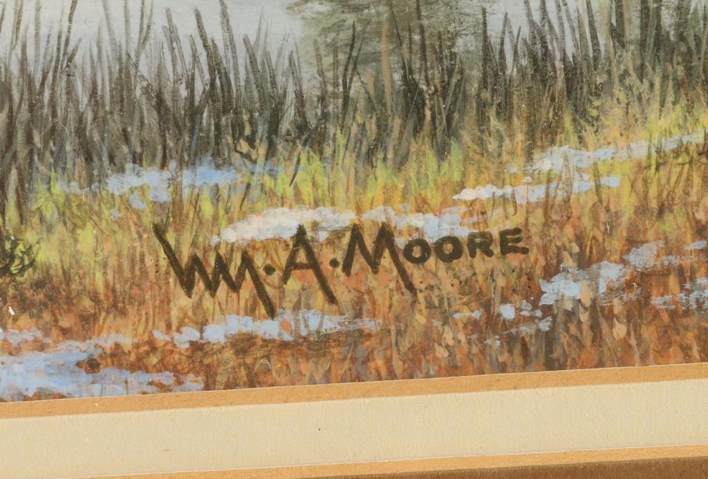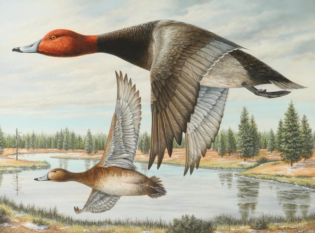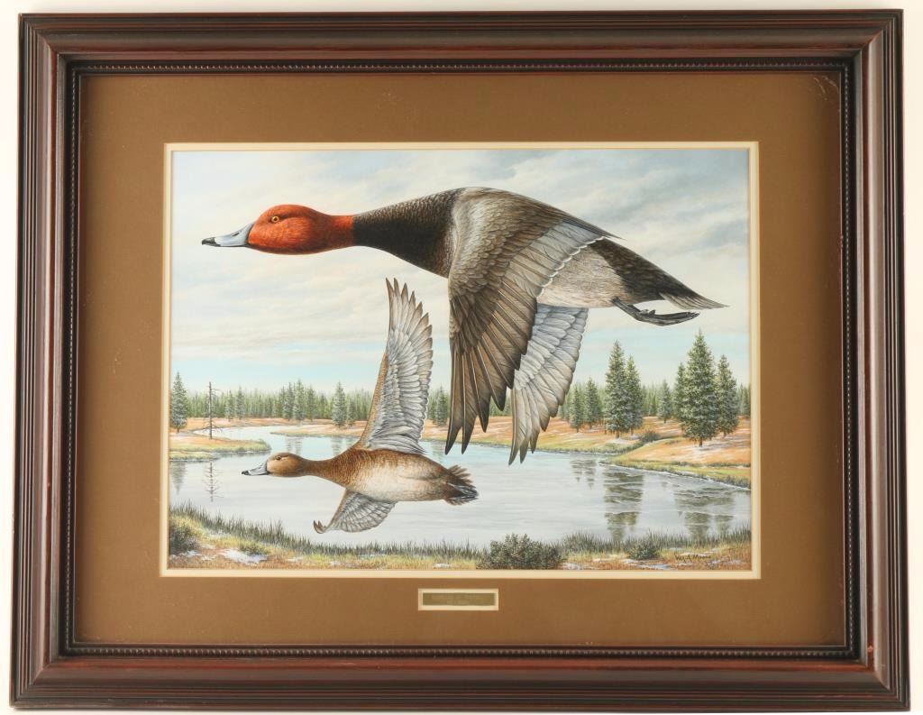 "Redheads at Turnbull" signed lower right. Placed in top 12 out of 48 for the 1986 Washington State Duck Stamp Contest. Image measures 13"x18" in double mat with title plate cut out and wood frame. Information on Duck Stamp entry printed by artist on the back. William Moore was born in Glendale, CA. his early interests were drawing, prehistory and restoring automobiles. Bill's early career was focused on becoming a paleontologist. In 1956 he won the General Motors Fisher Body Craftsman's Guild contest which started his career in commercial art. Bill was awarded a scholarship to the Los Angeles Art Center College of Design where he studied for two years. After this he was involved in aerospace design as well as commercial and technical illustrations. Bill eventually left the commercial art world to pursue his true passion, painting Western themed landscapes and wildlife. He generated a large body of work that is in collections worldwide and in several national museums. Bill has been in the Southwest Art Magazine, Nevada Magazine and has been honored with the Nevada Ducks Unlimited Artist of the Year in 1989 and was chosen for Idaho's 1999 Game Stamp and 1994-95 Duck Stamp.